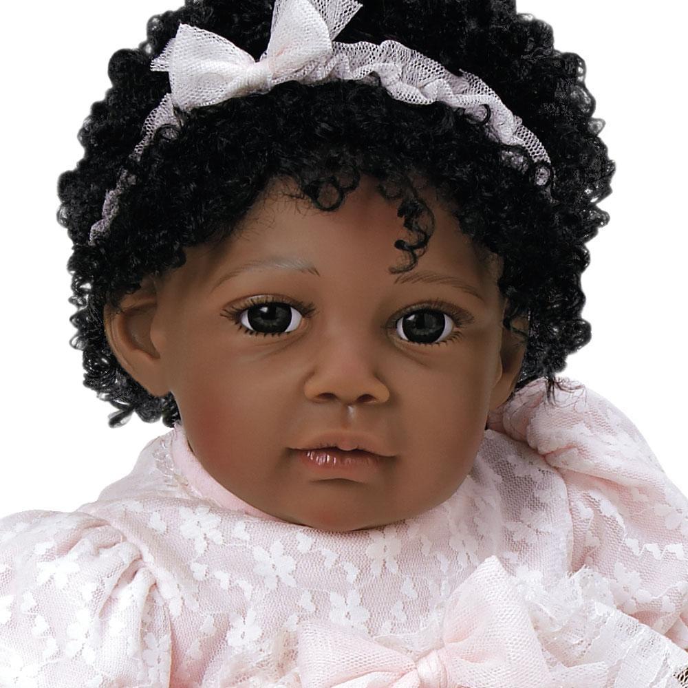 Satisfy your sweet tooth, Chantilly is an absolute treat in a candy-coated pink ensemble. She is an African American baby doll dressed in a baby powder pink tiered top with white lace trim, matching blush pink bloomers and ballet slippers. Her jet black ringlet curls are adorned with a pink headband and topped with a bow. Chantilly is a sugar-coated pink dream, sure to supply the coziest of hugs and biggest of smiles.