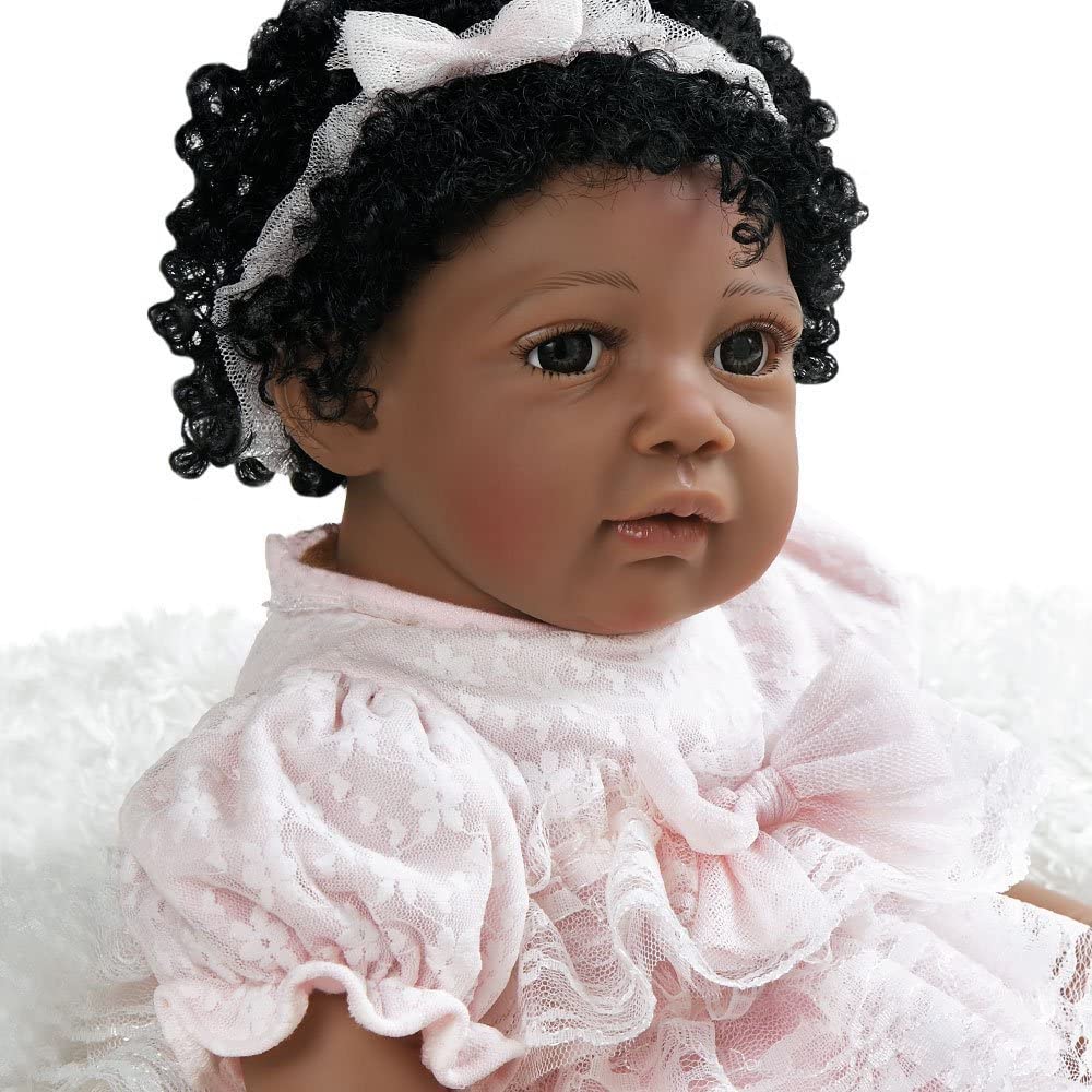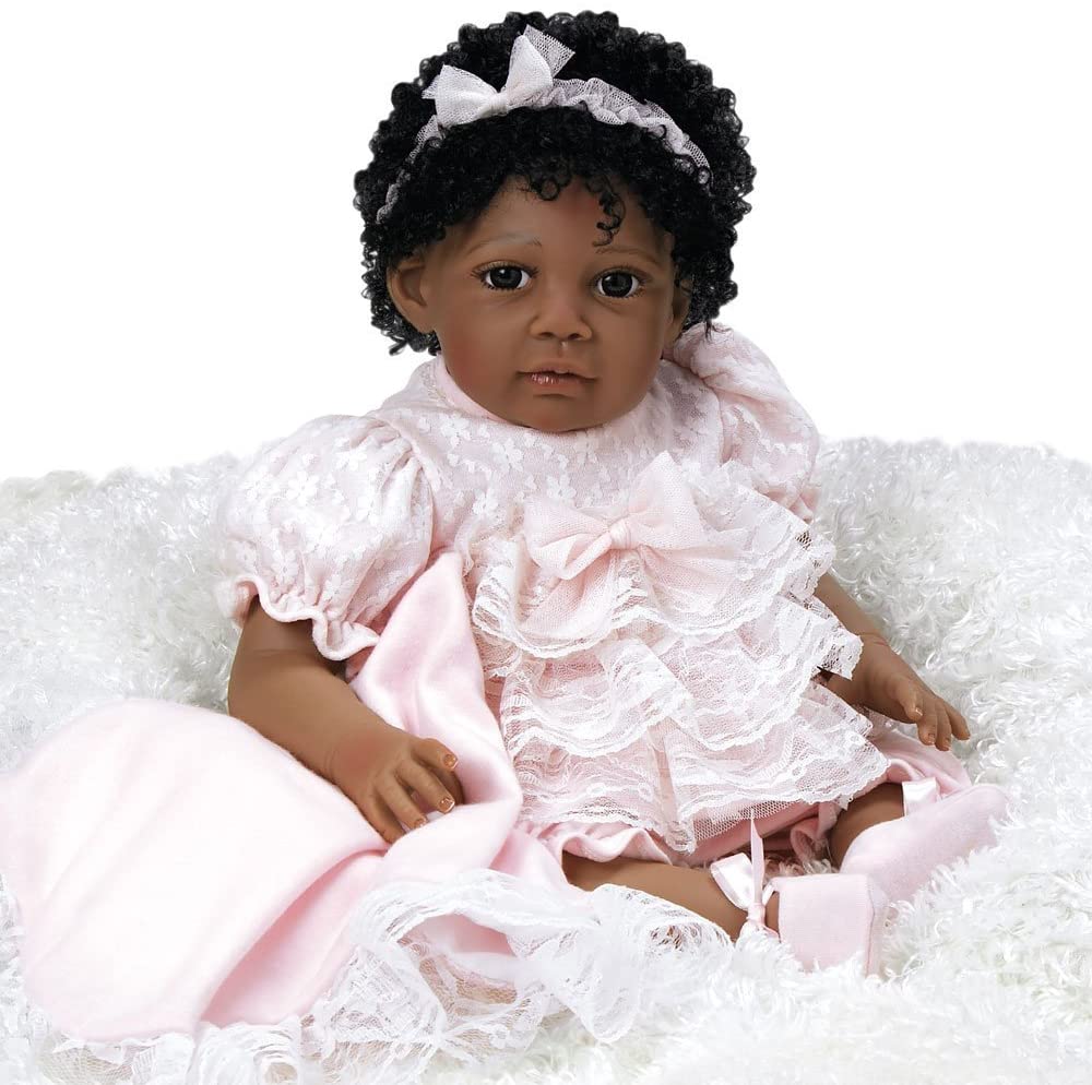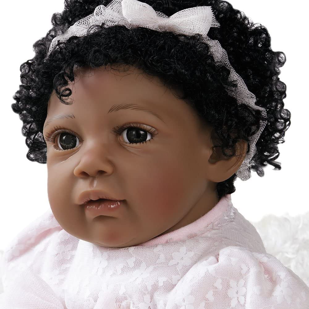 She is splendidly sculpted by awarded doll Artist Jannie de Lange in true to life detail for black reborn toddlers. Chantilly is handcrafted in GentleTouch™ vinyl with magnificently lifelike features and a weighted cloth body. She comes with accessories shown, a numbered Certificate of Authenticity and a collector's box.