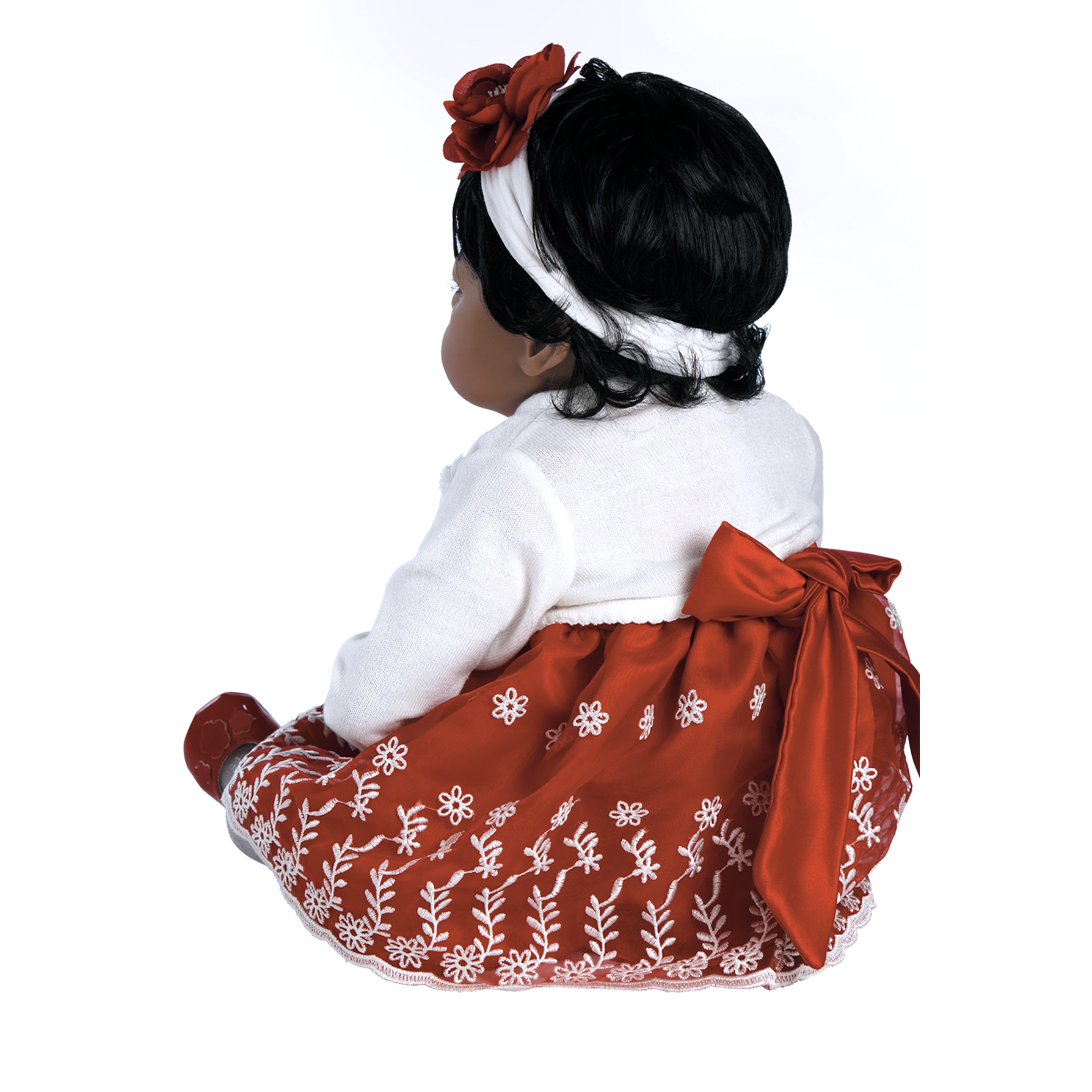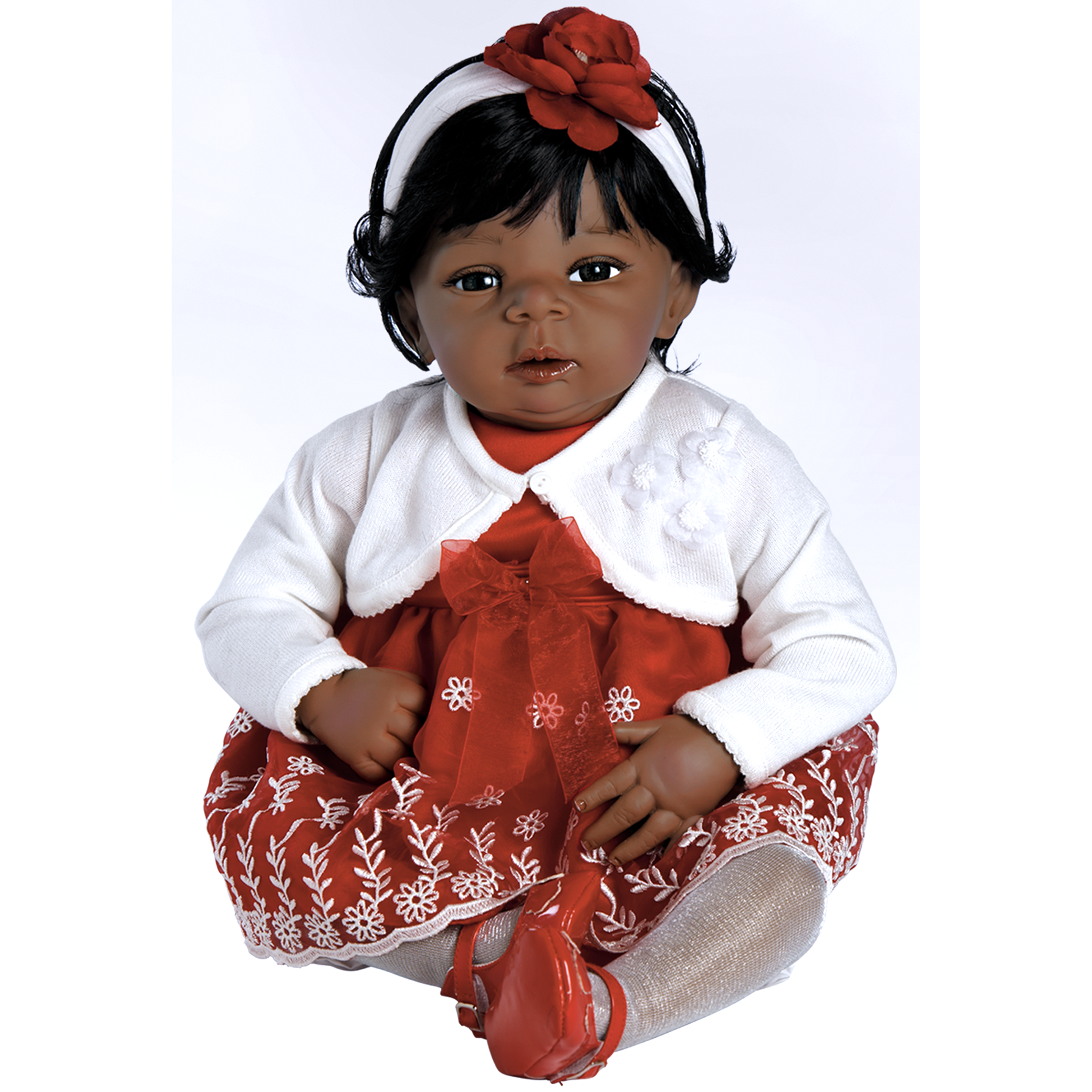 Welcome the perfectly beautiful African-American baby doll to add to your collection - "Sweet Ruby!" Everything about this sweet baby just makes your heart swell with delight! From her deep brown eyes and radiant skintone, Ruby is just a bundle of cuteness! Her gorgeous ebony tendrils perfectly contrast her white headband that’s accented with a sparkly ruby-red flower.