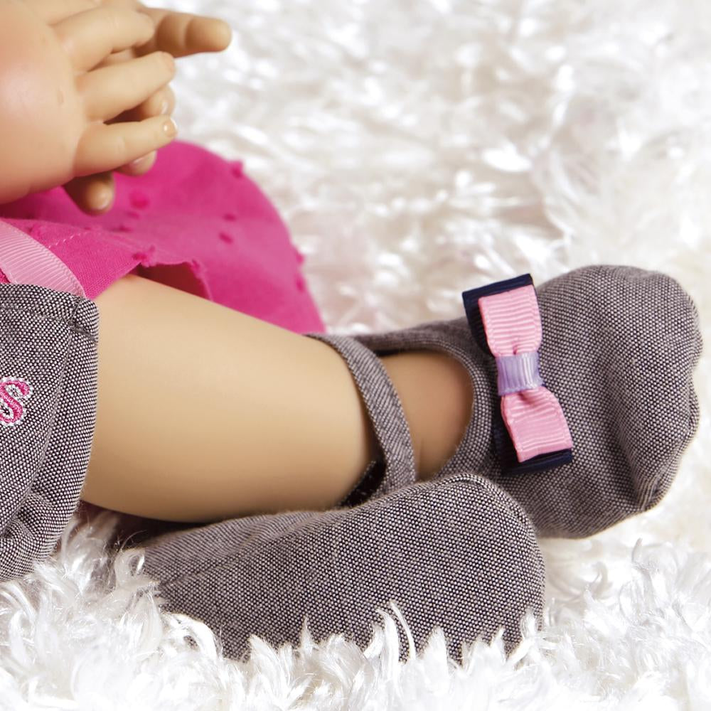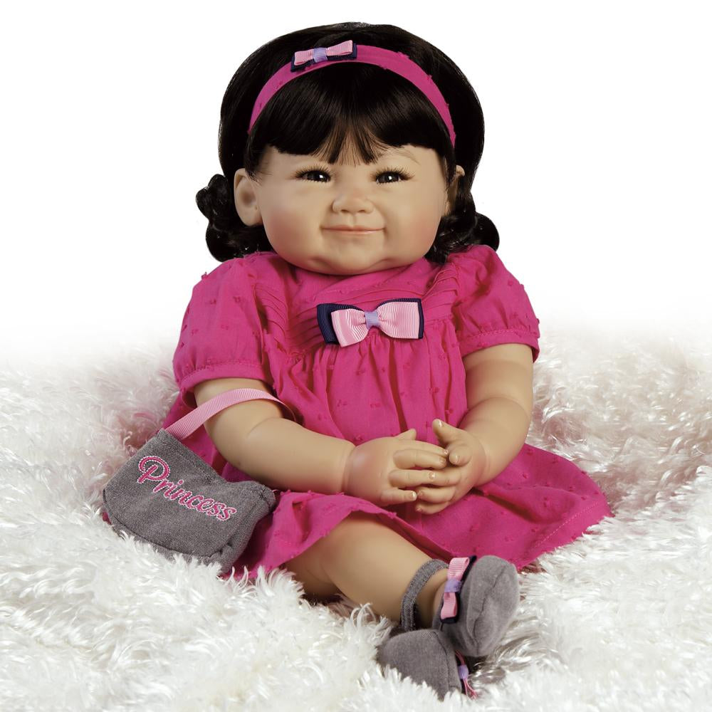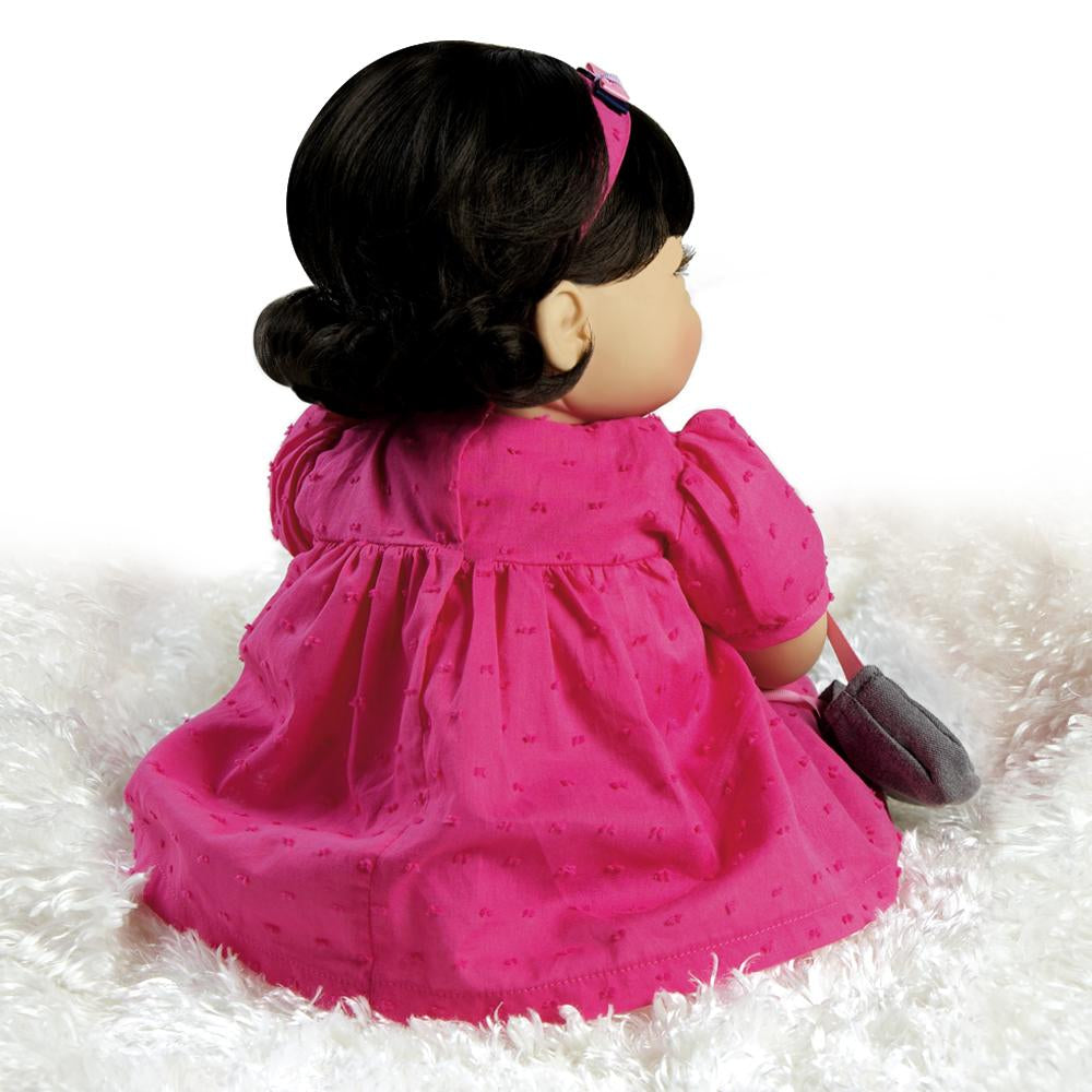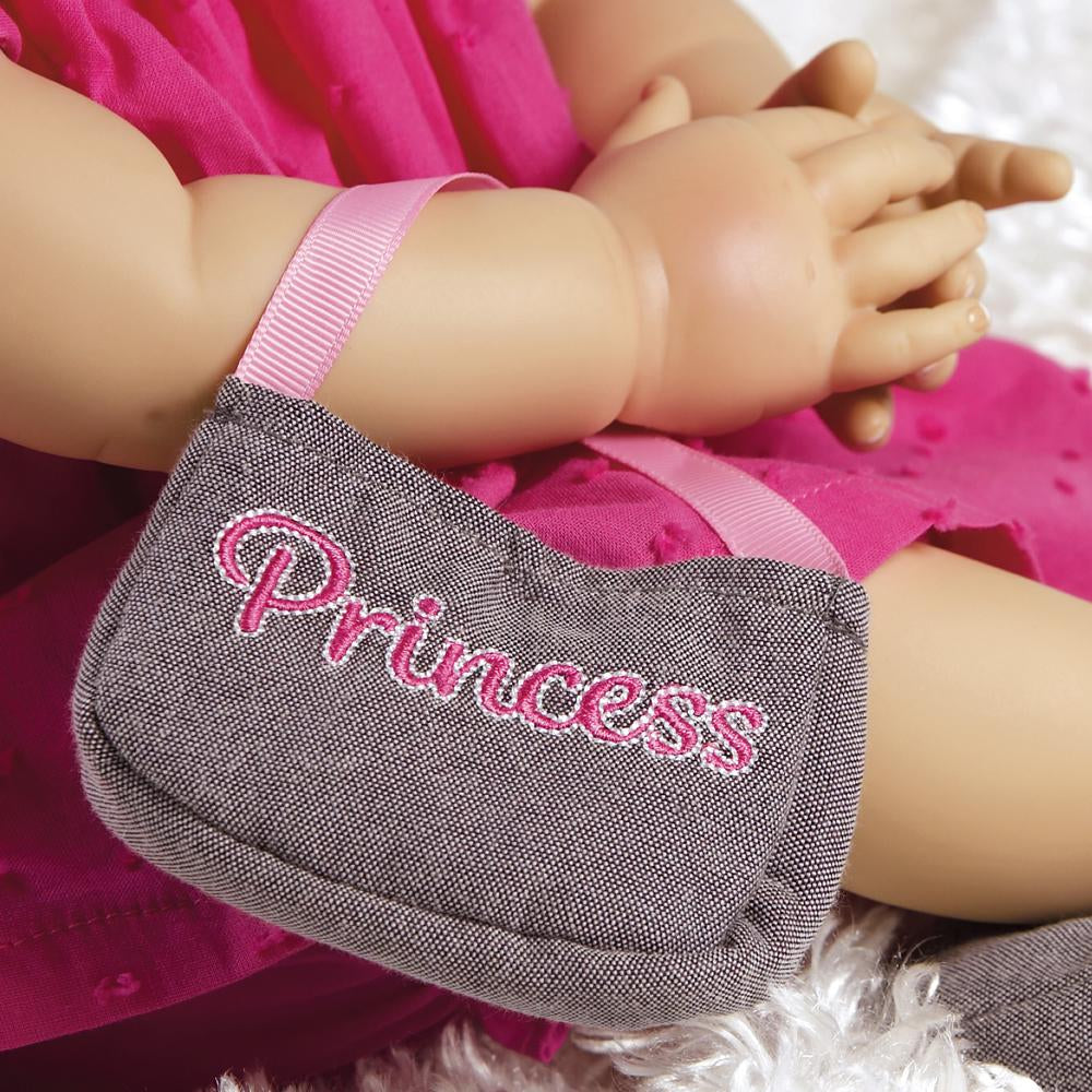 Our beloved "Su-Lin" baby is dressed in a pink Swiss dotted empire waist dress with pintucks on the bodice and a matching headband complete with a pink bow! Her grey ballet slippers have a cute ankle strap to help keep them on her tiny feet and her matching handbag embroidered “Princess” completes her ensemble.