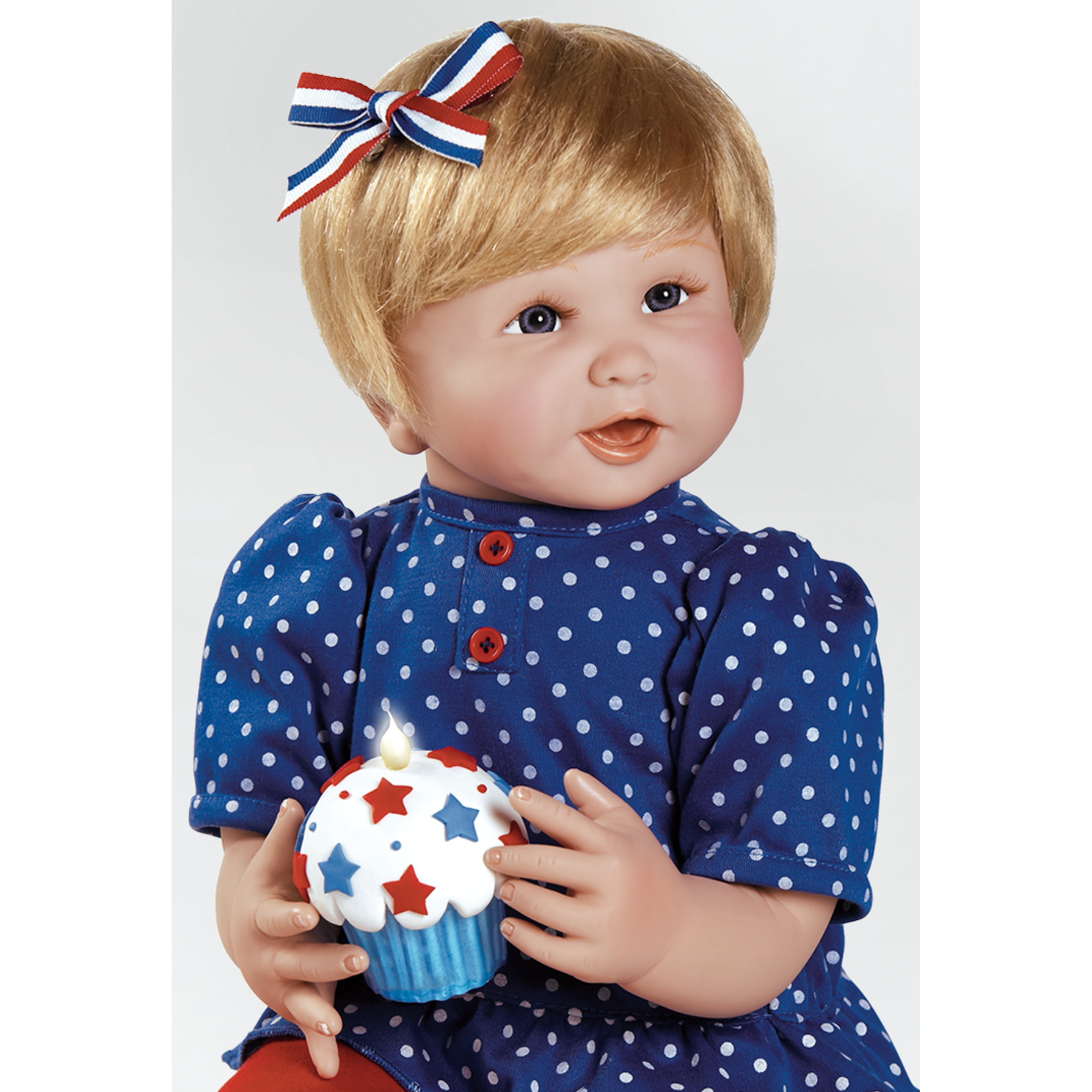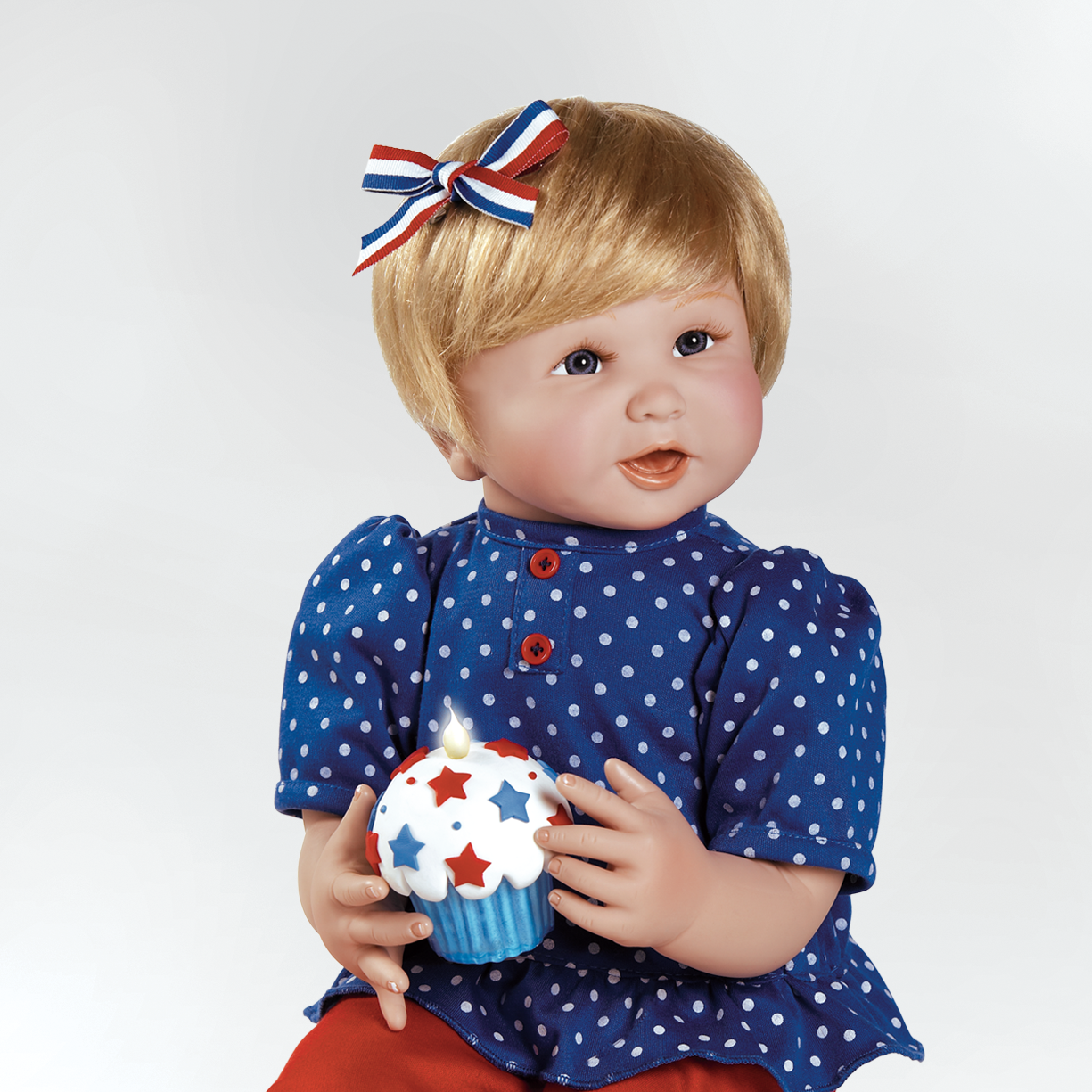 There is certainly no better way to celebrate Independence Day than with a bright and happy baby girl, the adorable "Baby Americana" doll! With her radiant smiling face glowing in anticipation for something beautiful that is about to come, she is the perfect symbol for the July 4th celebrations representing a brighter and promising future full of more fun celebrations!