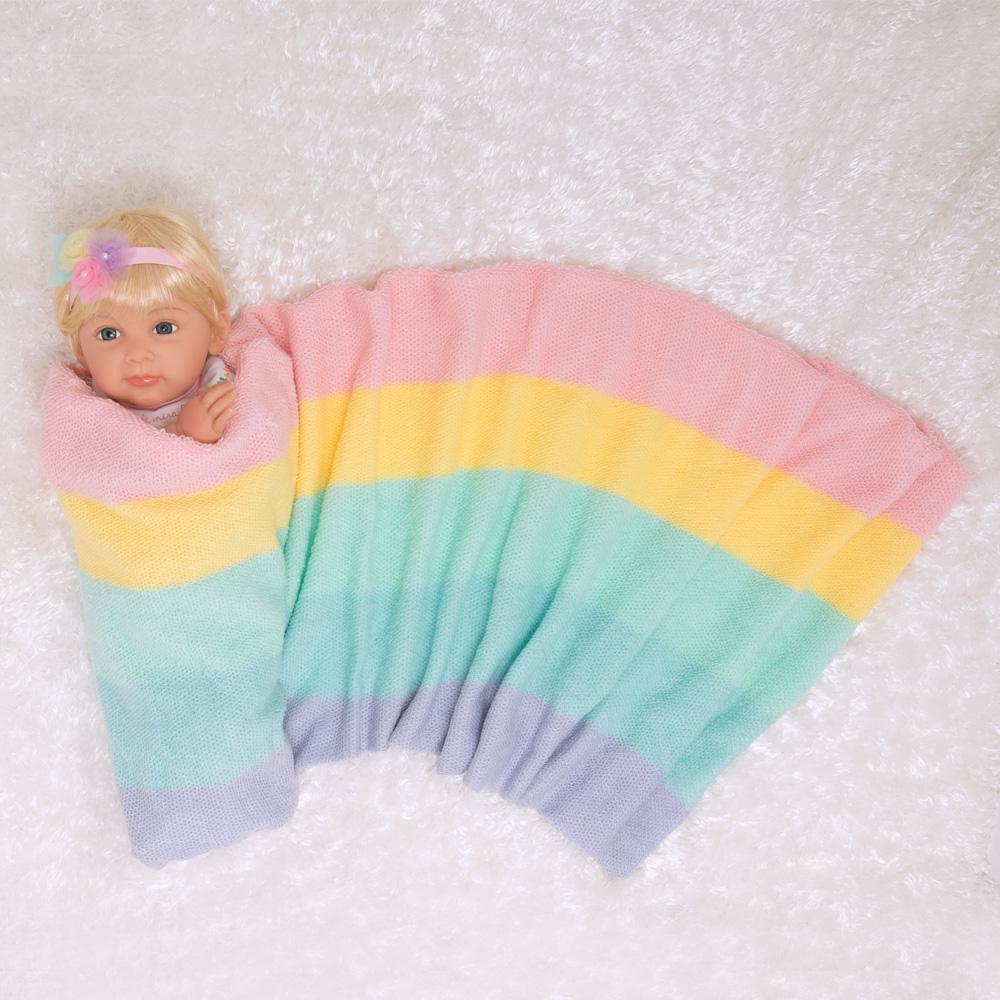 This rainbow blanket is the perfect finishing touch to our Rainbow Blessings collection. Wrap Faith, Hope, or Joy in this cuddly blanket to keep them snug as a bug as they sleep. The blanket is a baby doll accessory that is knit from a polyester-blend and ready to wrap your baby dolls with.