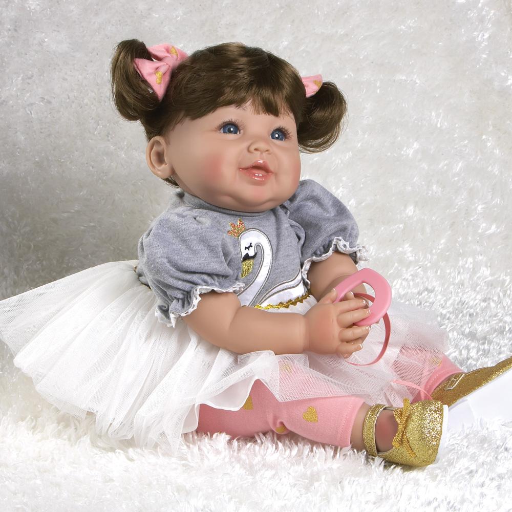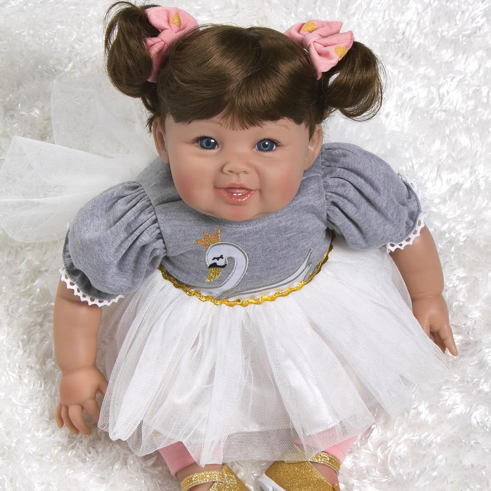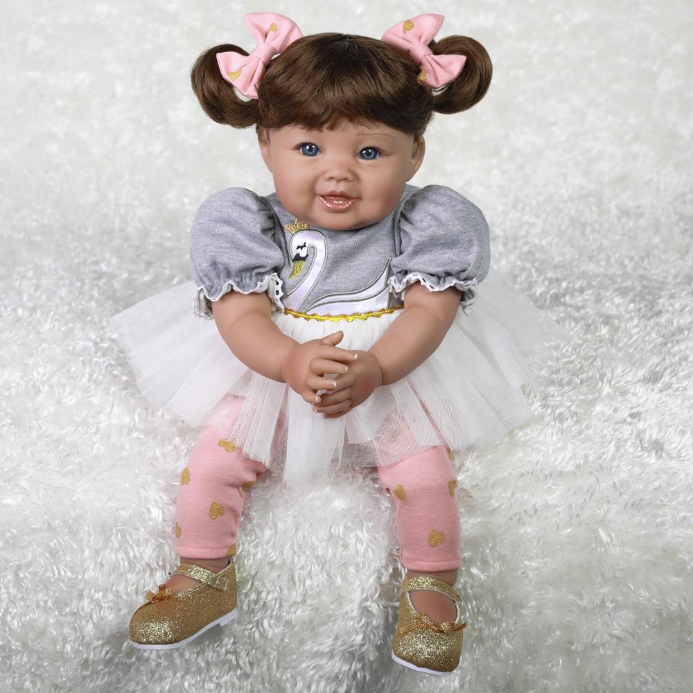 This Sweet Swan ballerina doll will dance her way into your heart. With a gleeful grin that reveals two precious baby teeth and her big blue smiling eyes, this lifelike doll is ready for her close up. She wears an adorable dress with a soft white tulle skirt and white satin underskirt. A satin swan applique with metallic embroidered touches accents her heather gray jersey-knit bodice. Her leggings and hair bows sparkle with gold heart imprints. And her look is completed with gold sparkle Mary Jane shoes. One dance and you're sure to want an encore!