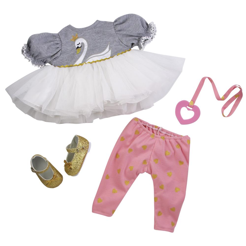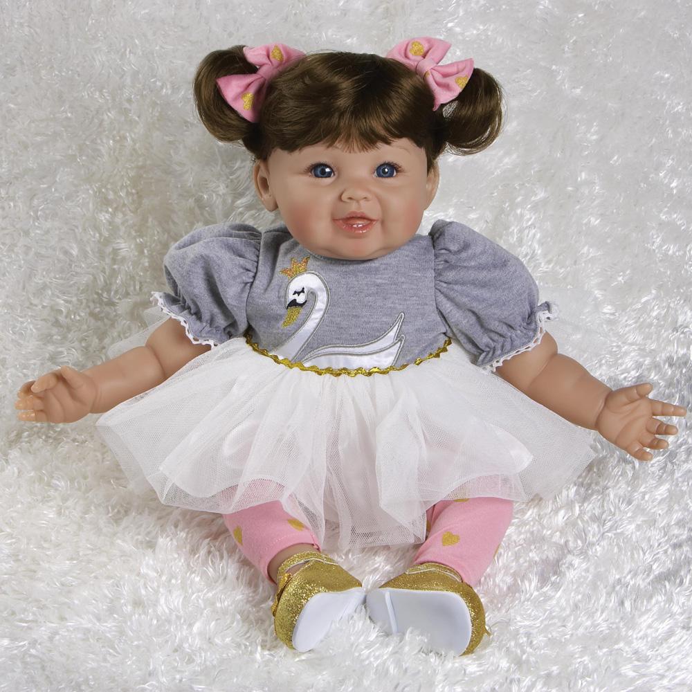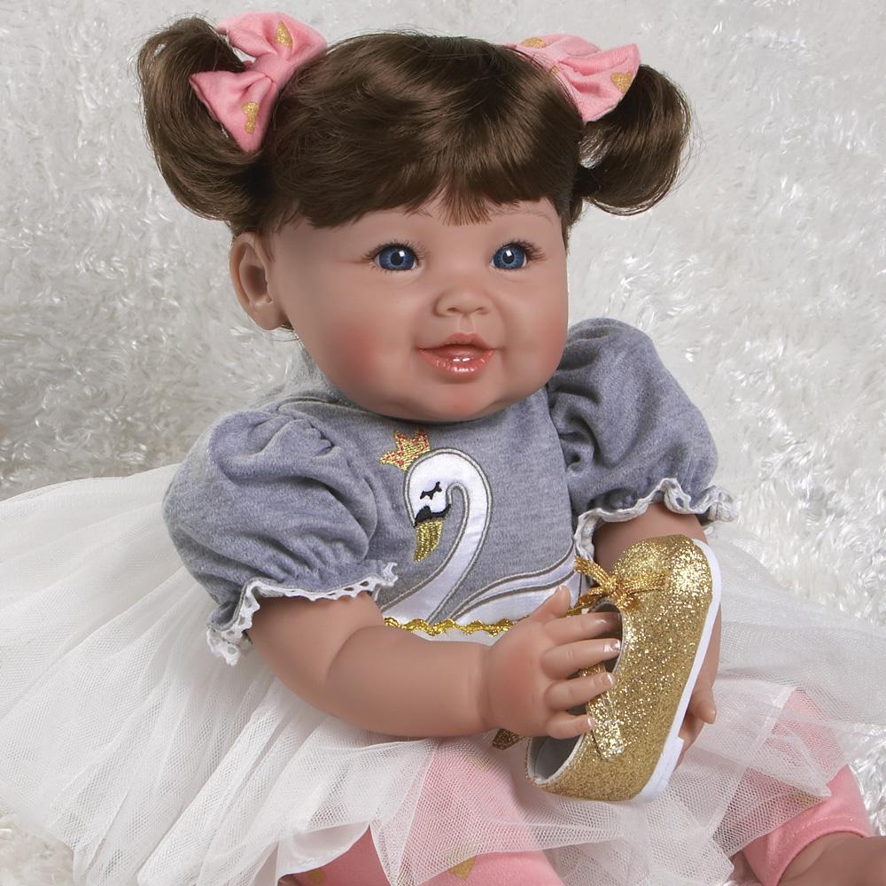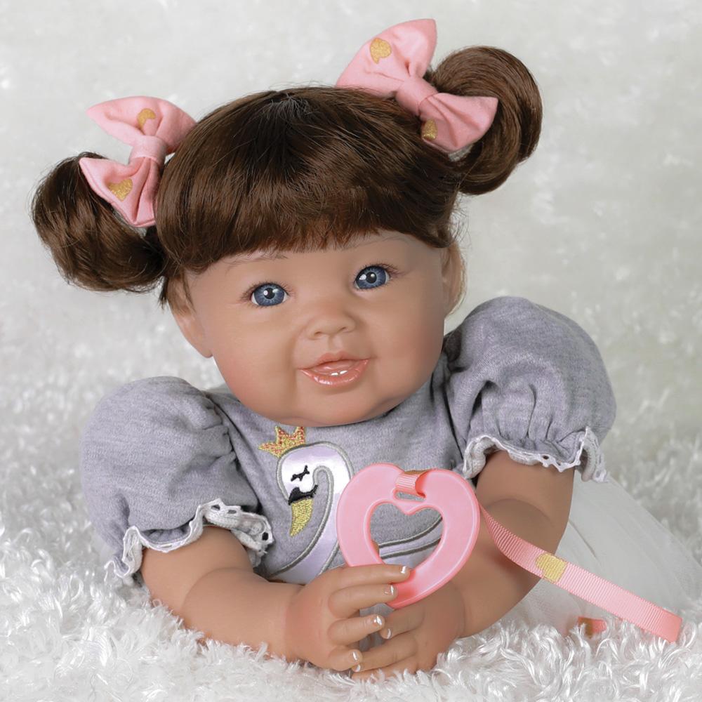 This Sweet Swan ballerina doll will dance her way into your heart. With a gleeful grin that reveals two precious baby teeth and her big blue smiling eyes, this lifelike doll is ready for her close up. She wears an adorable dress with a soft white tulle skirt and white satin underskirt. A satin swan applique with metallic embroidered touches accents her heather gray jersey-knit bodice. Her leggings and hair bows sparkle with gold heart imprints. And her look is completed with gold sparkle Mary Jane shoes. One dance and you're sure to want an encore!