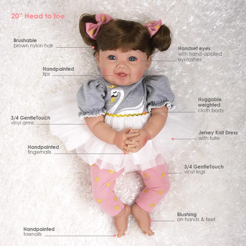 Sweet Swan is masterfully sculpted with true to life detail by world-renowned artist and doll sculptor Ping Lau. Her lifelike features are handcrafted in GentleTouch™ vinyl and a weighted soft cloth body makes her feel amazingly real like a reborn toddler. She comes with a pink silicone heart-shaped teething ring, a numbered Certificate of Authenticity, and an exquisite collector's box.
