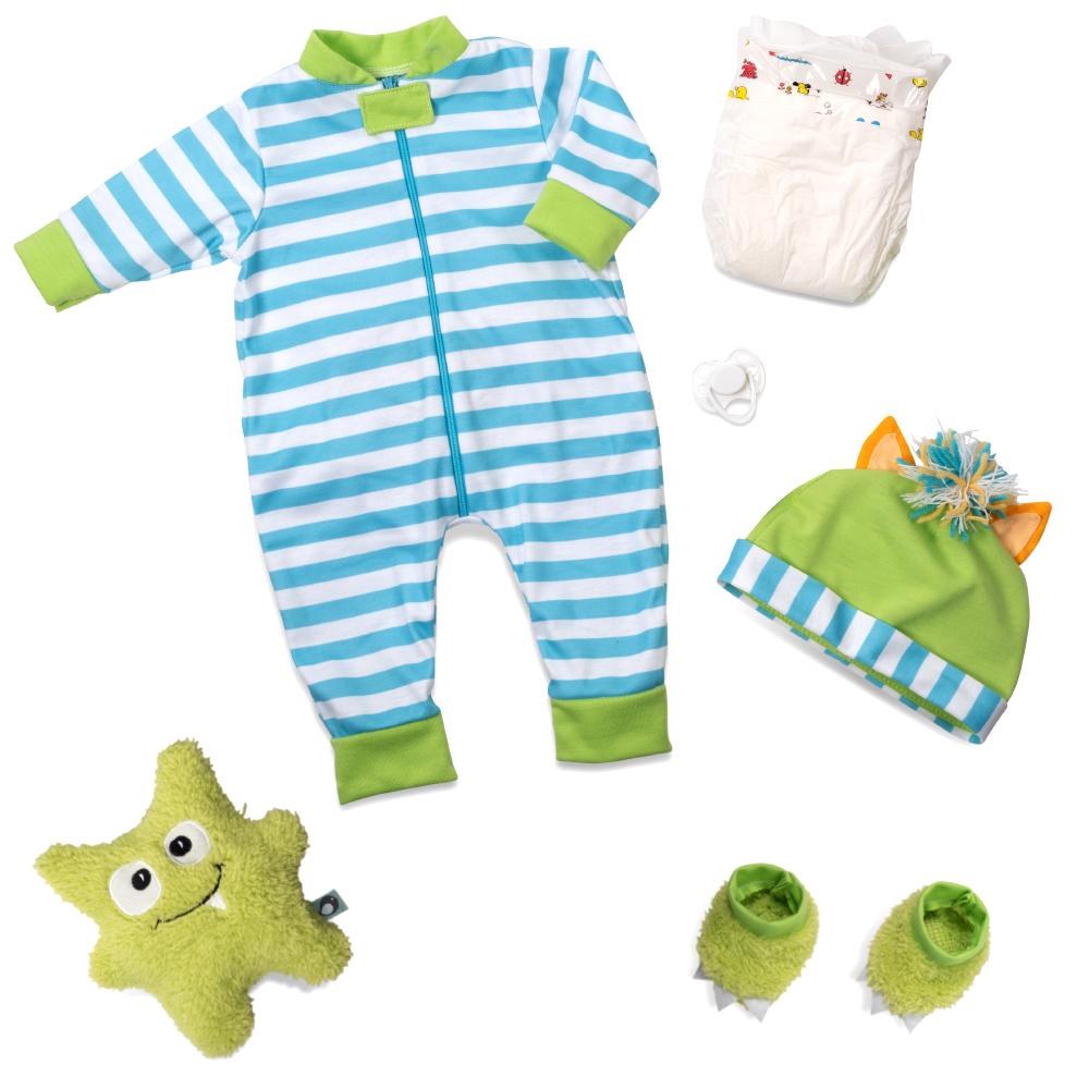 - Comes with jersey knit striped sleeper with cute monster-themed rear flap, magnetic pacifier, diaper, cap with monster ears, plush claw booties and matching plush friend
