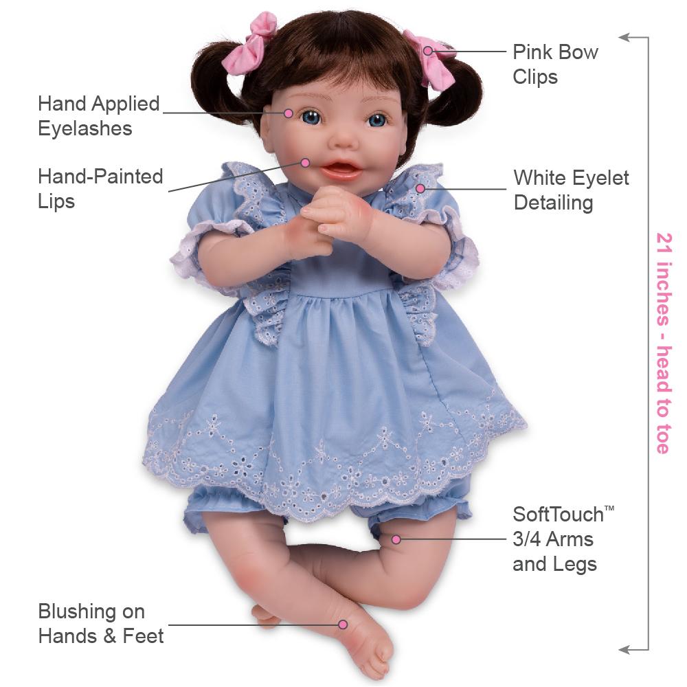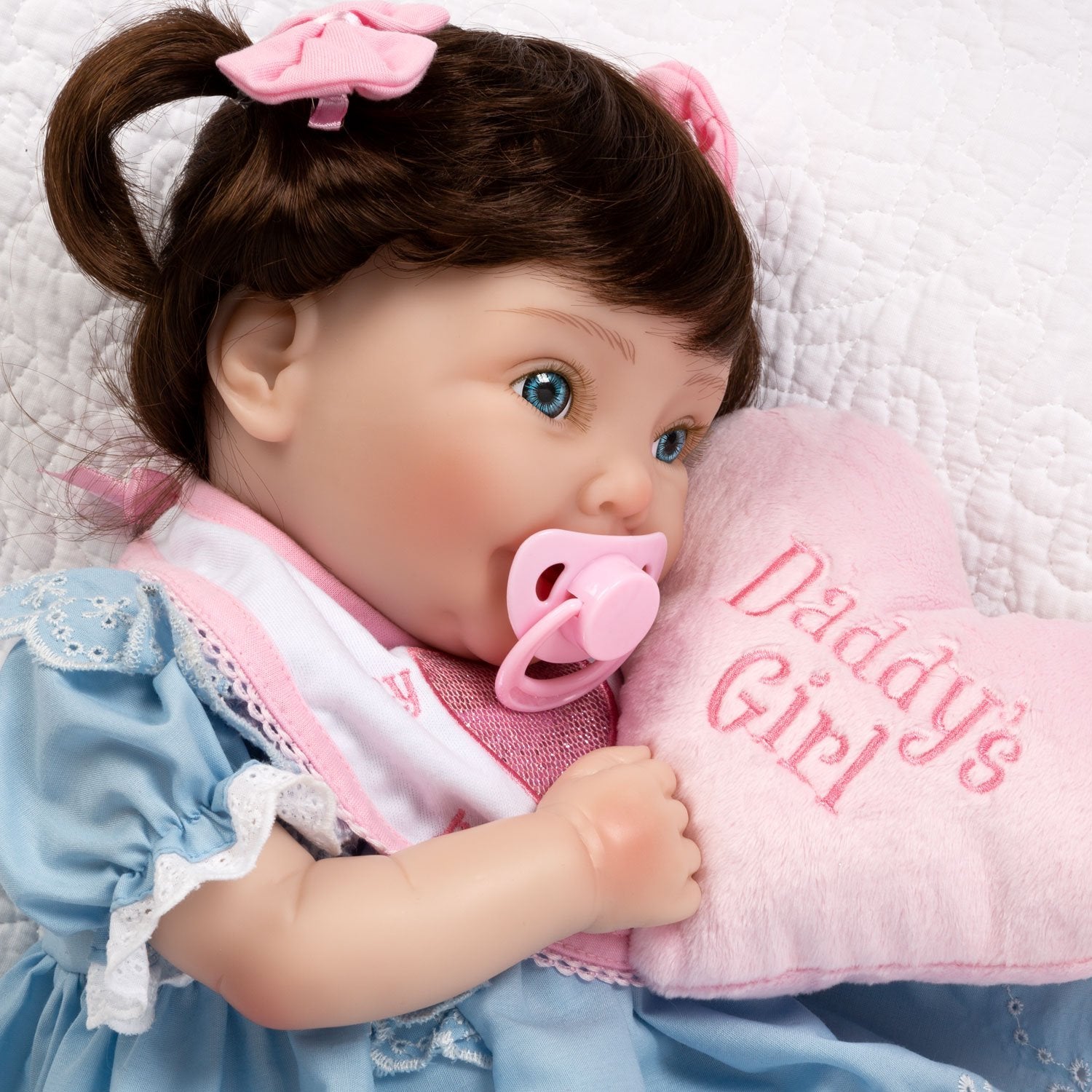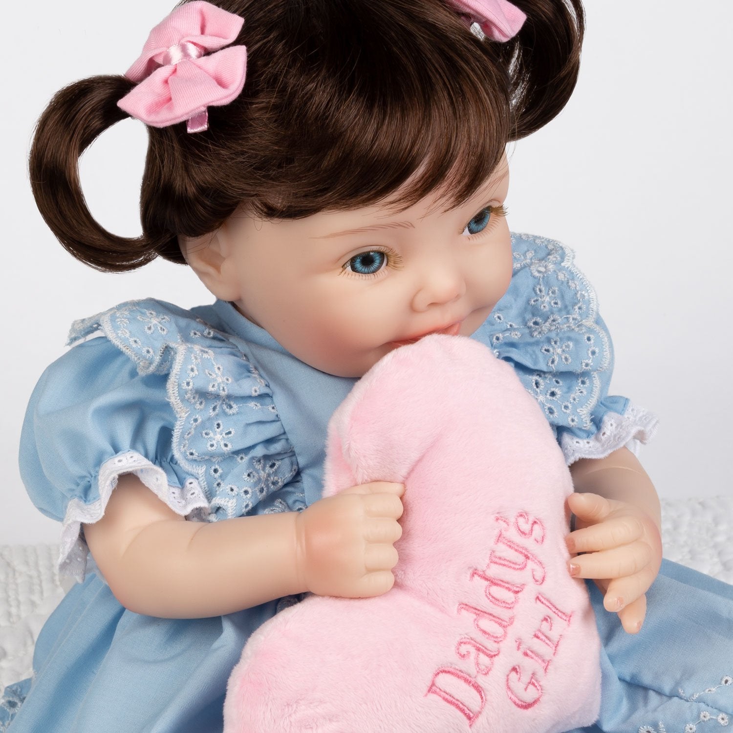 Daddy’s is skillfully crafted by world renowned artist Fiorenza Biancheri. She is created with our newest material, SoftTouch™ vinyl, and a weighted cloth body for that wonderfully lifelike feel. This realistic baby doll arrives inside a Collector’s Box and includes a numbered certificate of authenticity with the artist’s signature.