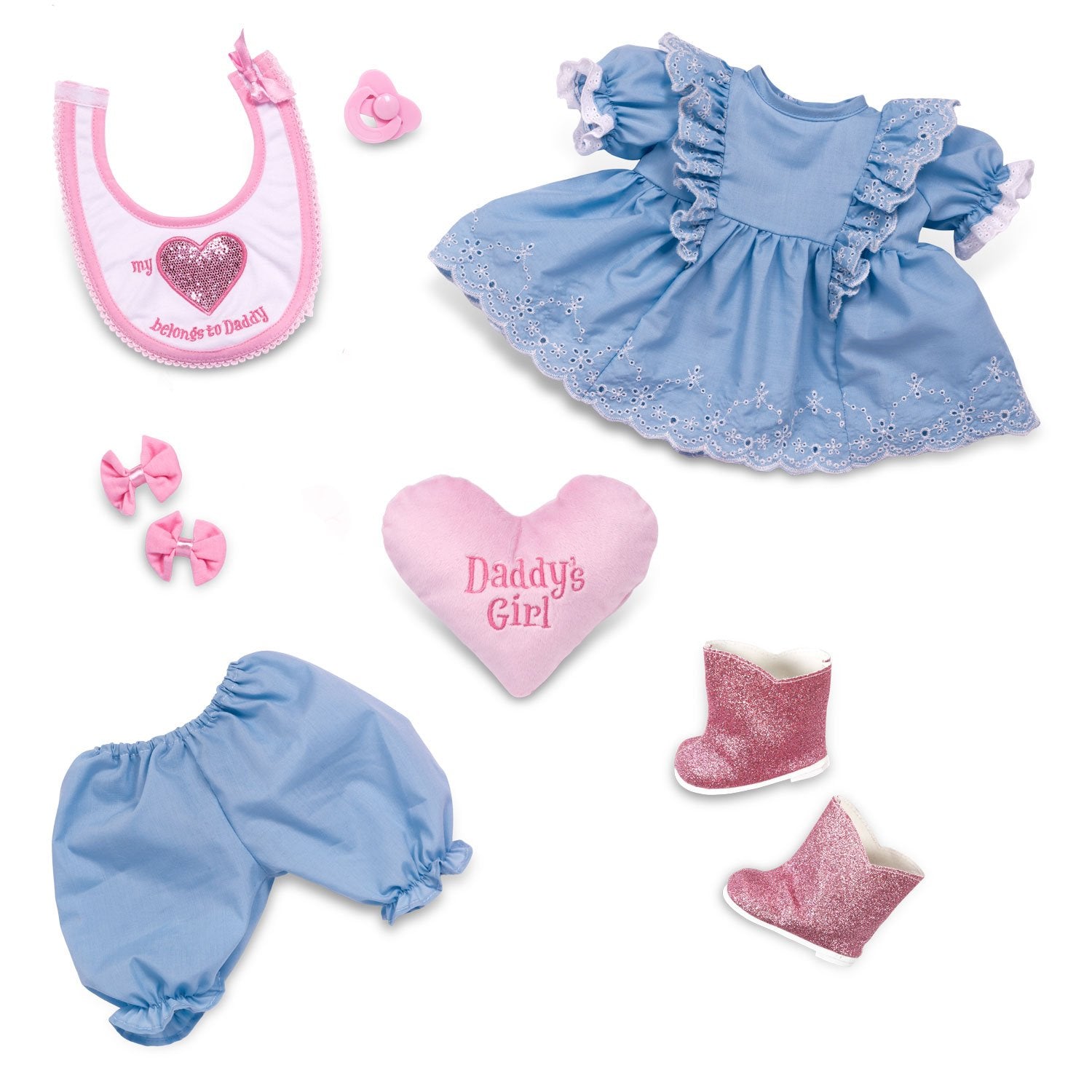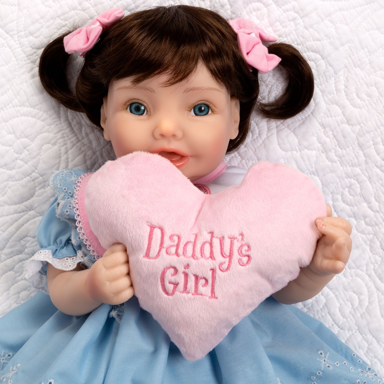 Her delightful ensemble is finished off with her pink glitter boots that match the twinkle in her smile. When it’s time to unwind, Daddy’s Girl has her super soft plush heart pillow and coordinating magnetic pacifier for bedtime. All that’s missing is a lullaby and some loving arms to snuggle in to. It’s time to open up your heart to Daddy’s Girl and fill your home with childhood nostalgia.