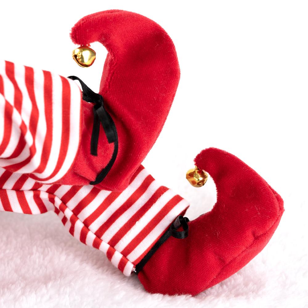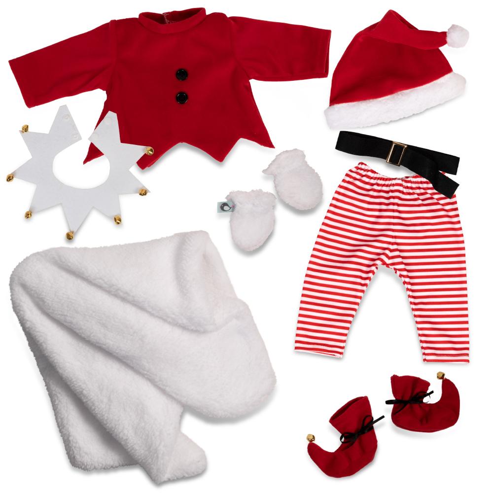 - He comes with a red tunic with a black belt, striped pants, Santa hat, fuzzy white mittens, elf shoes & collar both with gold bells