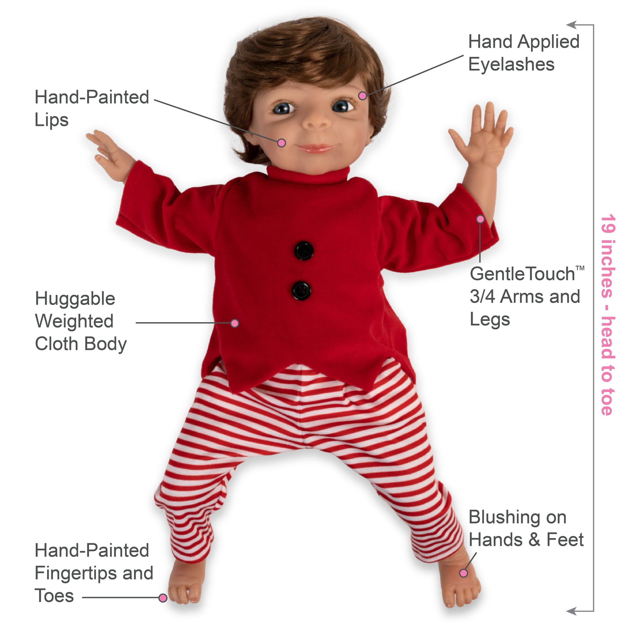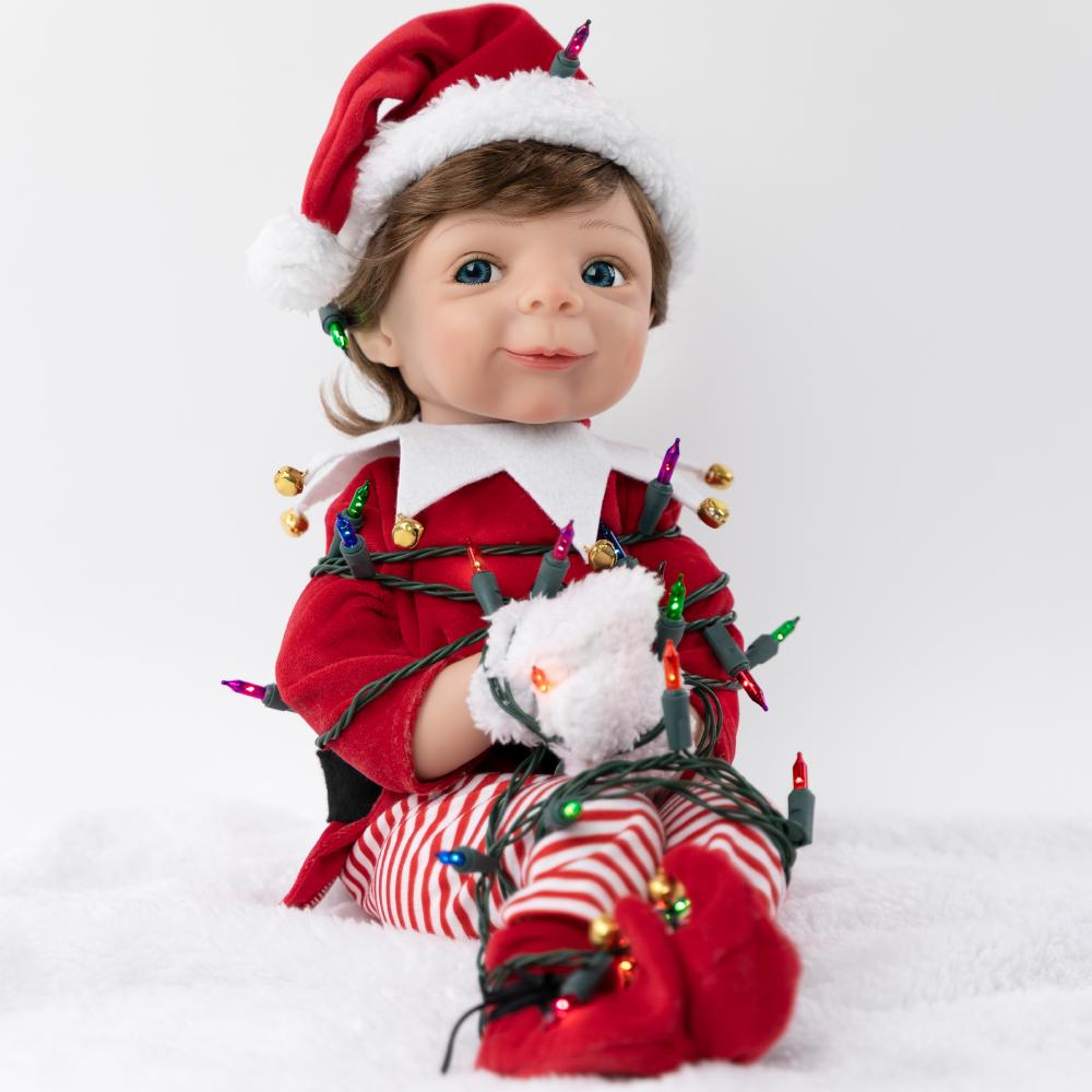 Whether you were naughty or nice this year, Elf will bring endless joy to your home! This little body is dressed in his best holiday-attire with a red tunic (just like Santa’s) complete with a black and gold belt. Underneath his Santa hat, he has silky soft hair you’ll want to style all day long. With his piercing blue eyes, sweet dimples and rosy cheeks, it’s time to wrap Elf up for yourself or for a loved one today. Elf is beautifully handcrafted by world-renowned Pat Moulton. Individually sculpted using our exclusive GentleTouch™ vinyl, his heavy weighted cloth body provides a wonderfully lifelike feel. This reborn-like toddler arrives inside a Collector’s Box and includes a numbered Certificate of Authenticity with the artist’s signature.