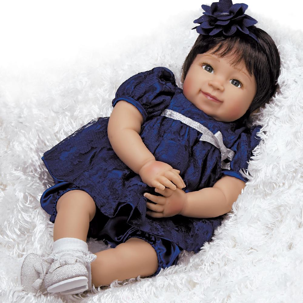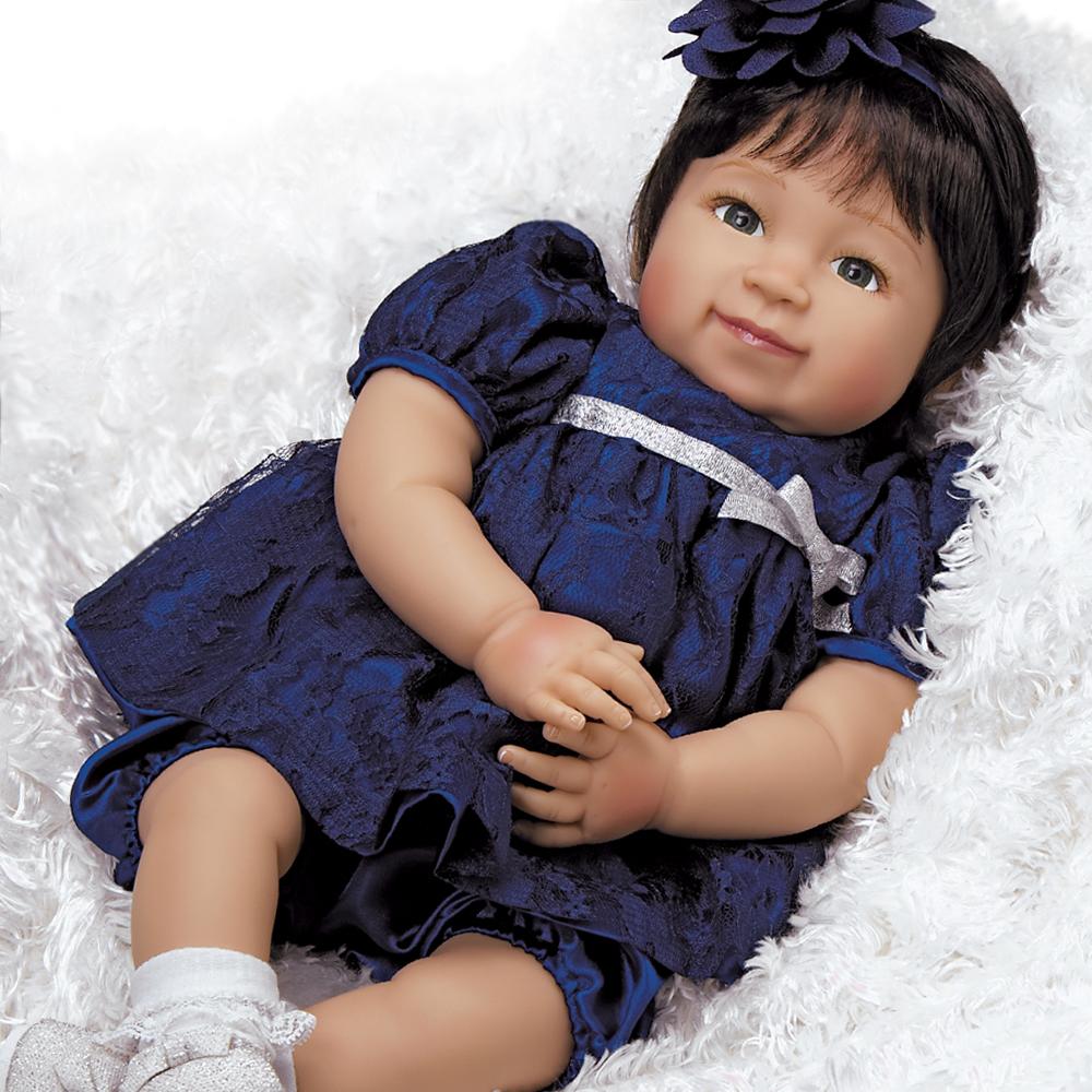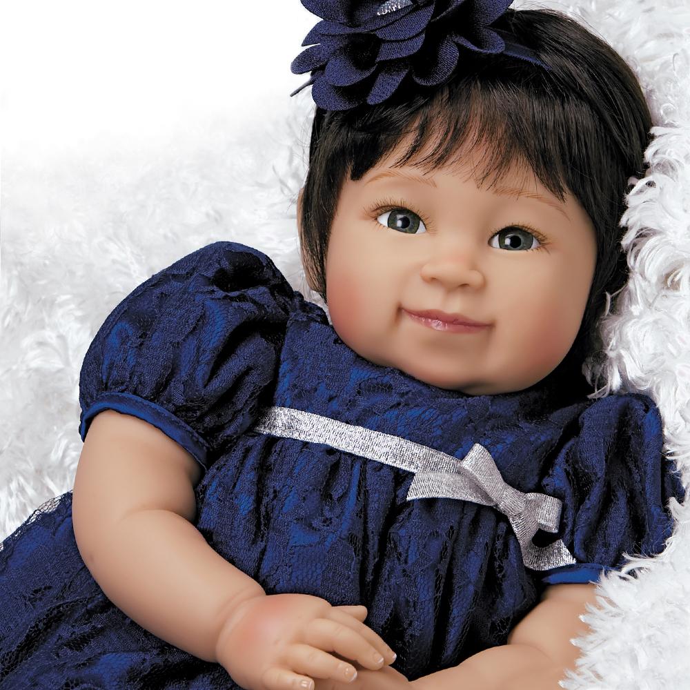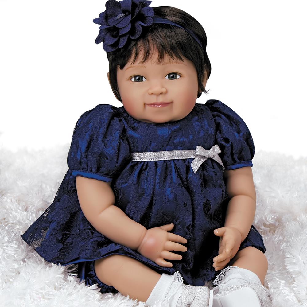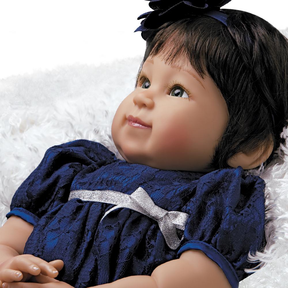 All dressed up and ready to go home with you is beautiful Baby Alexandria. This precious 20" realistic baby doll is perfectly outfitted for any dressy occasion in an intricate party dress that will kick off any celebration. You will love her midnight blue chantilly lace dress, featuring traditional short poof sleeves and a silver metallic bow accenting an elegant empire waist silhouette. Truly sparkling from head to tiny toe, this ethnic doll wears a midnight blue flowered headband with metallic silver accent in her hair, matching silver metallic ballet shoes, and a pretty pair of dainty white lace socks. Her ensemble isn't complete without sweet satin blue pantaloons peeking out underneath her party dress.