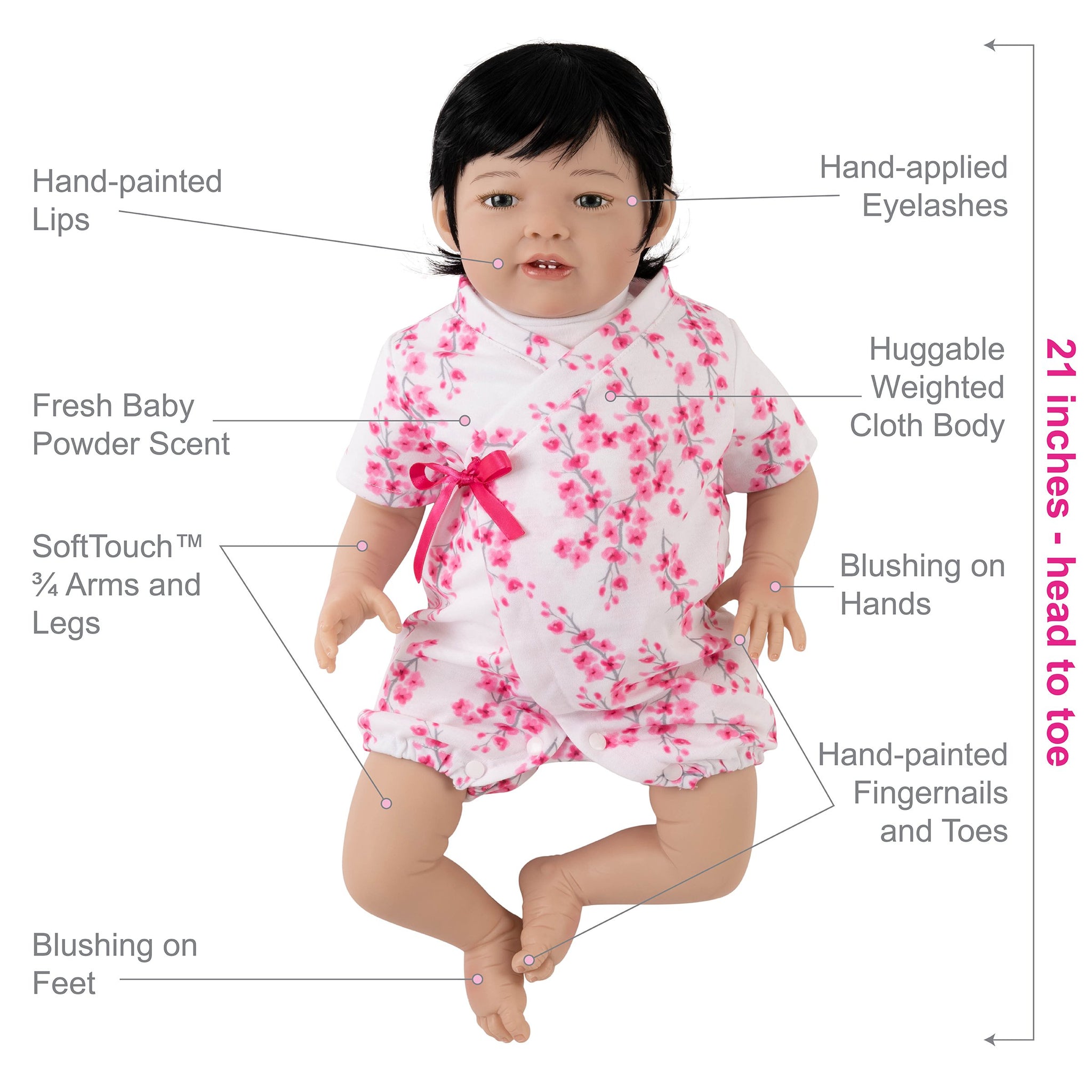 Hanami is a debut sculpt in our Paradise Galleries collection by internationally recognized artist Jannie De Lange, who also sculpted our bestselling Asian baby doll, Sakura. Hanami is lovingly crafted with our SoftTouch™ Vinyl, giving her a comforting baby powder scent and a realistic feel. With this vinyl, she has incredibly lifelike features, including chubby baby rolls! Intended for reborn doll collectors ages 14+