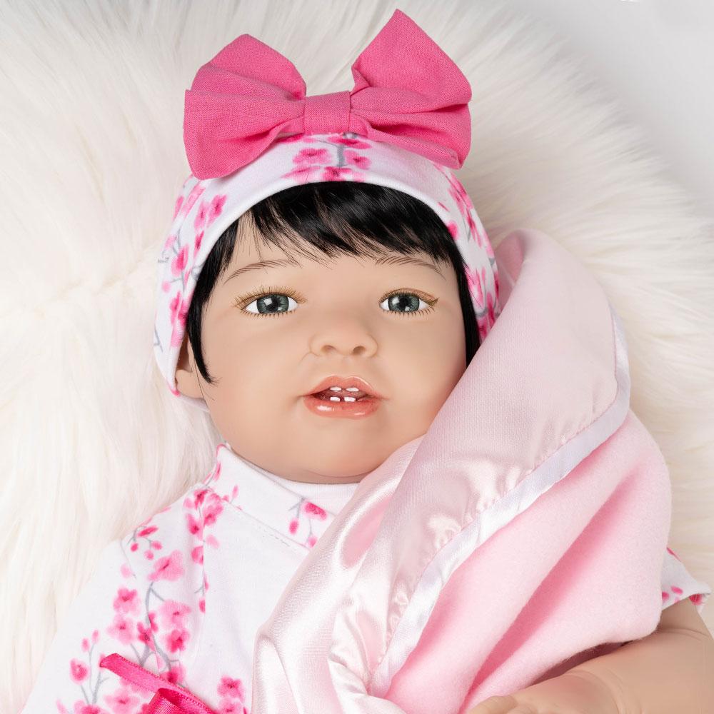 This 21” Asian reborn toddler girl will captivate you with her sparkling gray eyes that are a sharp contrast to her jet black hair. Her sweet and loving expression will melt your heart, along with her chubby baby cheeks and toothy smile! She is dressed in a jersey knit kimono, printed with the magnificent pale and hot pink flowers that inspired her creation, that is tied together with a satin pink ribbon. She wears a matching printed cap with a large pink bow, and white booties with pink ribbons. Our darling Hanami also carries around her favorite satin and velour pink blankie to snuggle up with when she is ready for naptime, along with her cherry teether to soothe her.