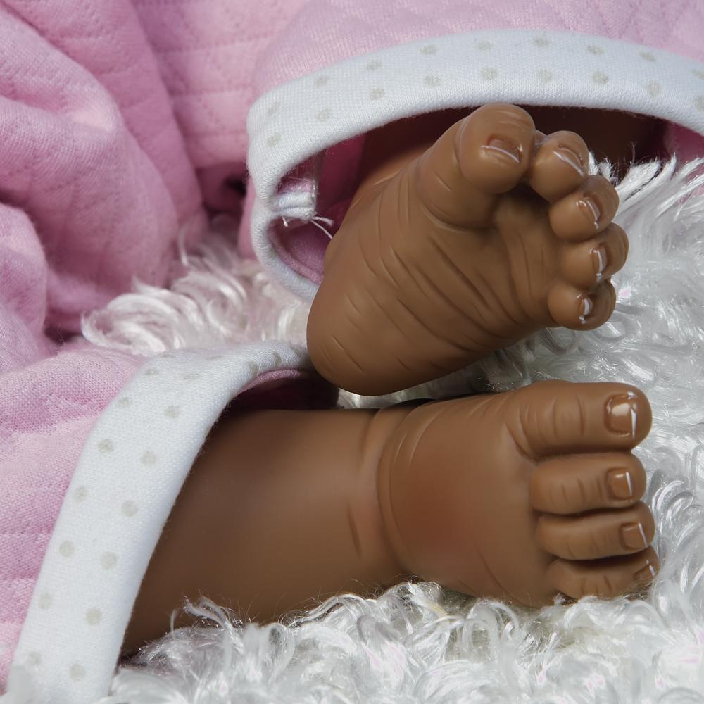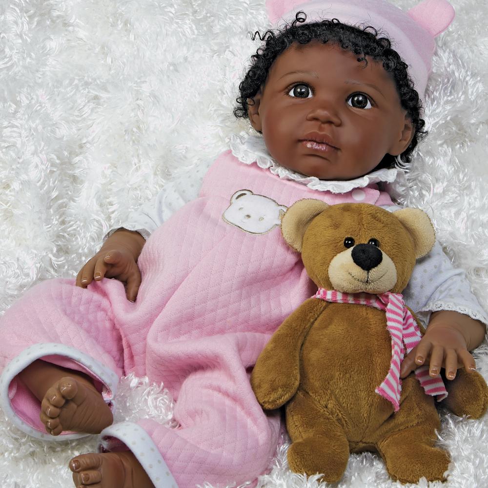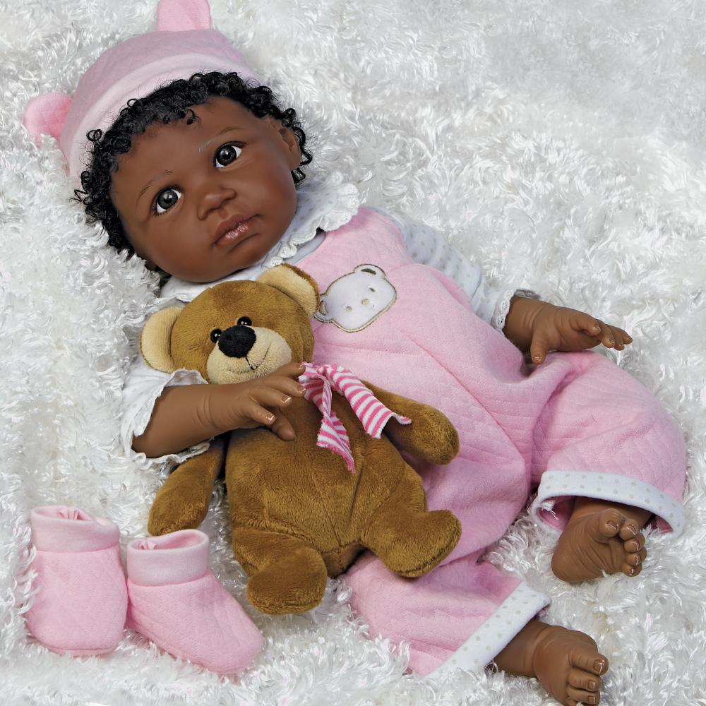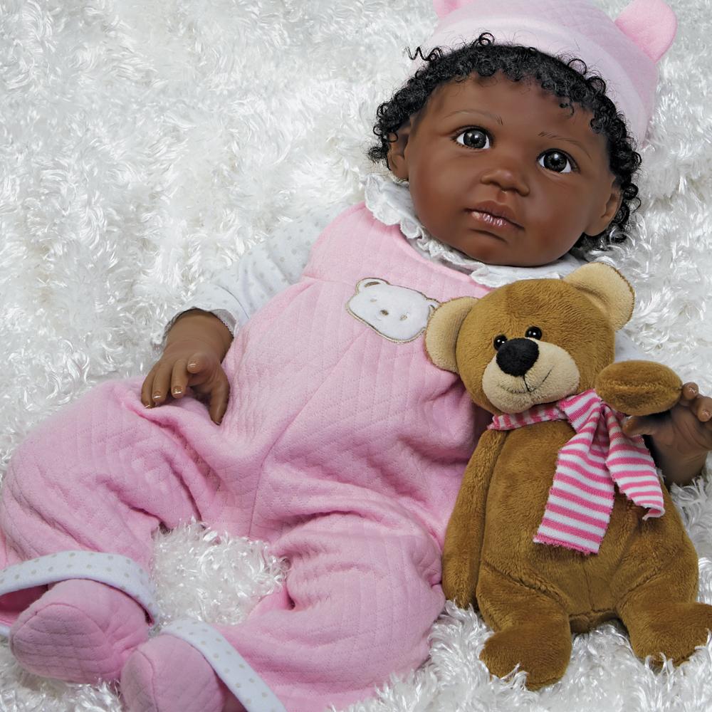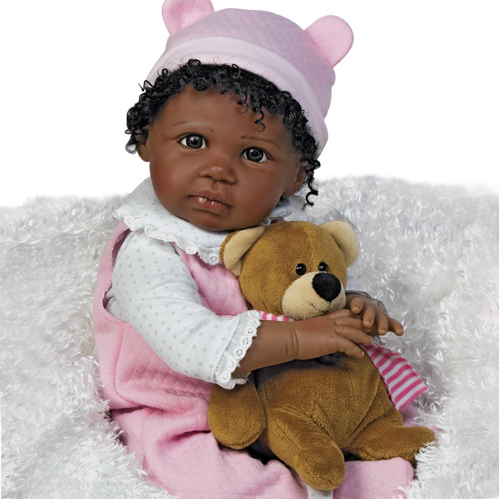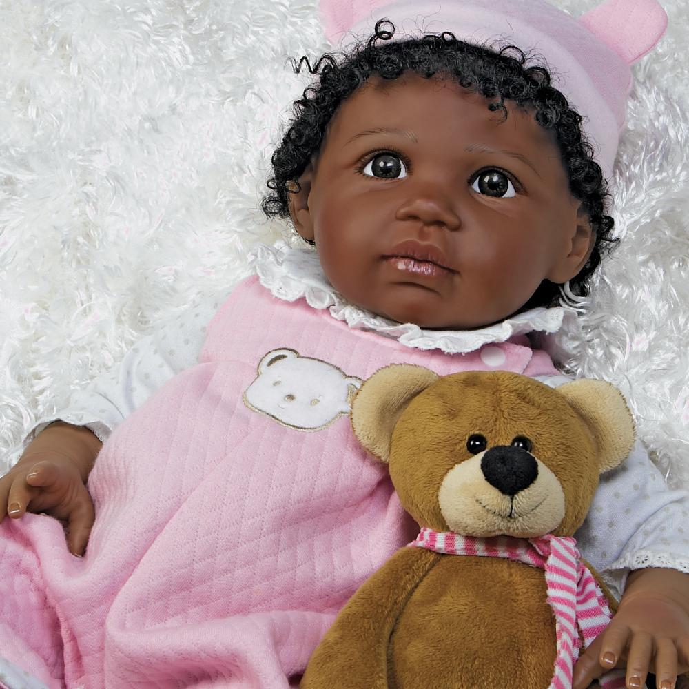 Once you have baby Bailey bundled up in your arms, you'll never want to put her down! The magic is in her unbelievably realistic features and delightful demeanor. Whether she's sitting up clutching her cuddle-worthy plush bear companion or lying down gazing up at you with her big and beautiful brown eyes, Bailey will charm you for years to come. From her sweet kissable lips to her glossy hand painted fingernails and toenails, Bailey is a true beauty to behold, from head to toe. And you won’t be able to resist playing with her head full of soft dark natural curls!