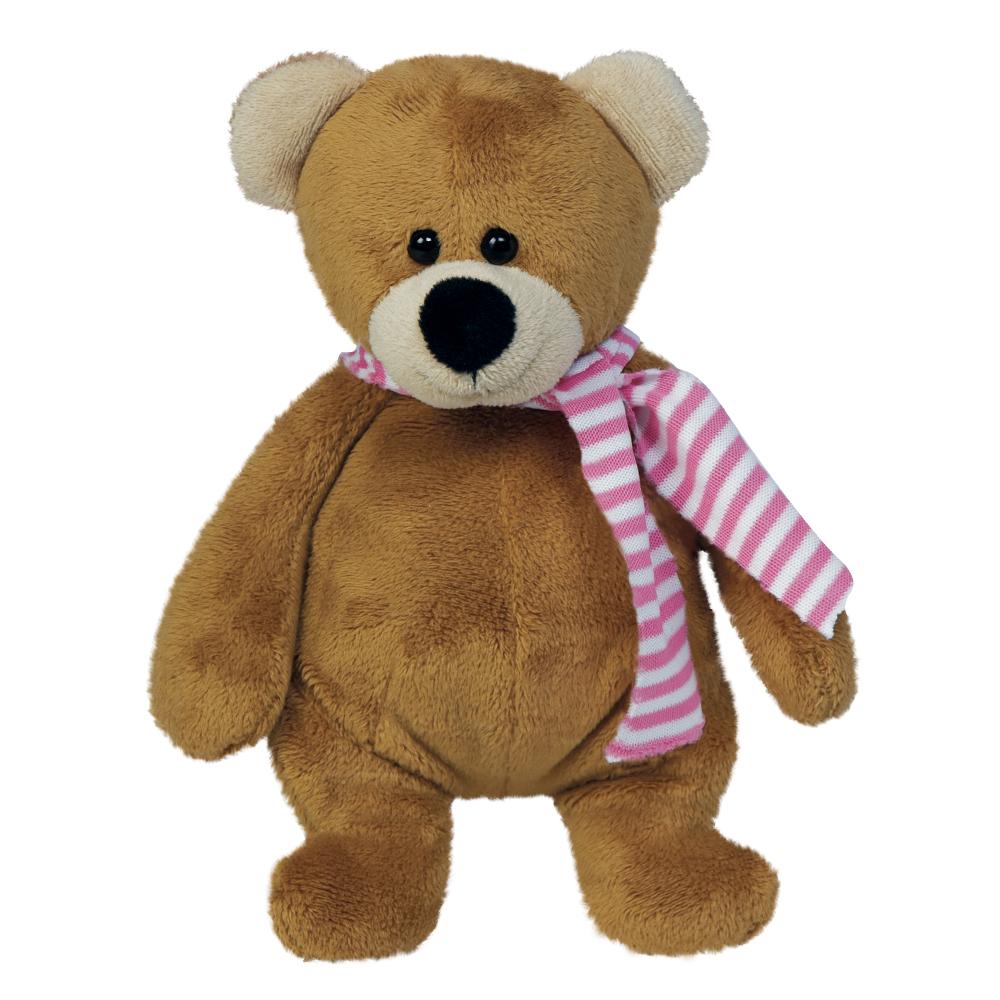 Bailey wears a pink knit quilted jumper layered over a cozy long-sleeved Swiss dot jersey knit top trimmed in eyelet lace. Her ringlets peek out of a precious bear-ear beanie that complements the cheeky cub appliqué centered on her bodice. Bailey comes with a beary special bestie under her spell, a plush teddy wearing a striped scarf and a smitten smile.