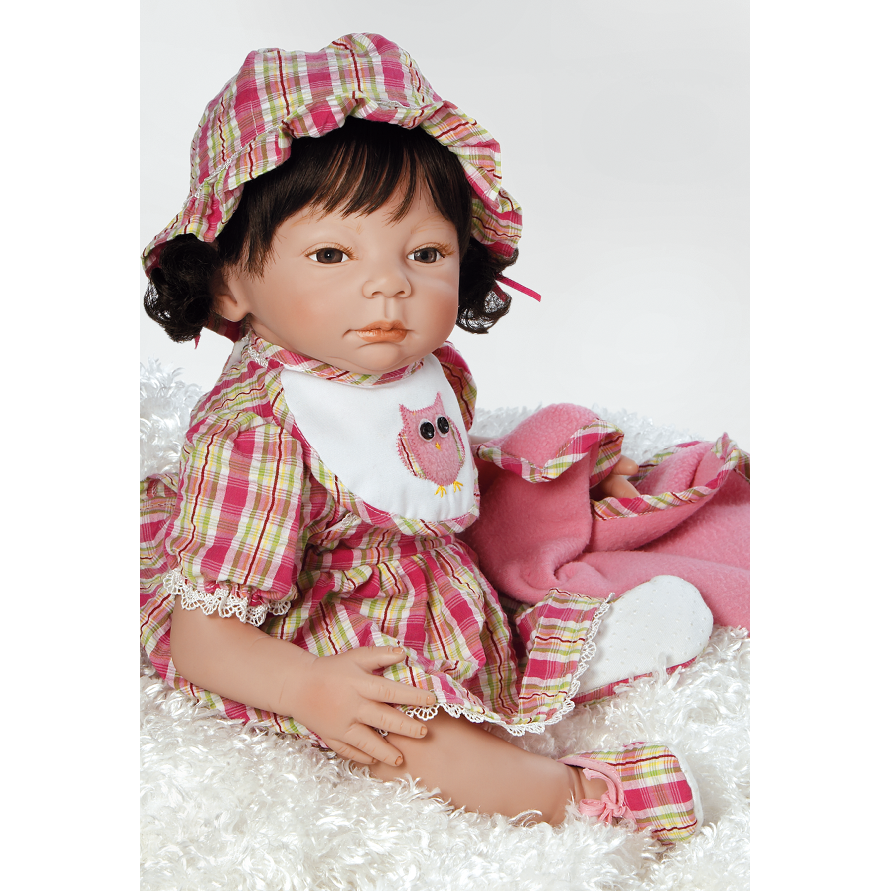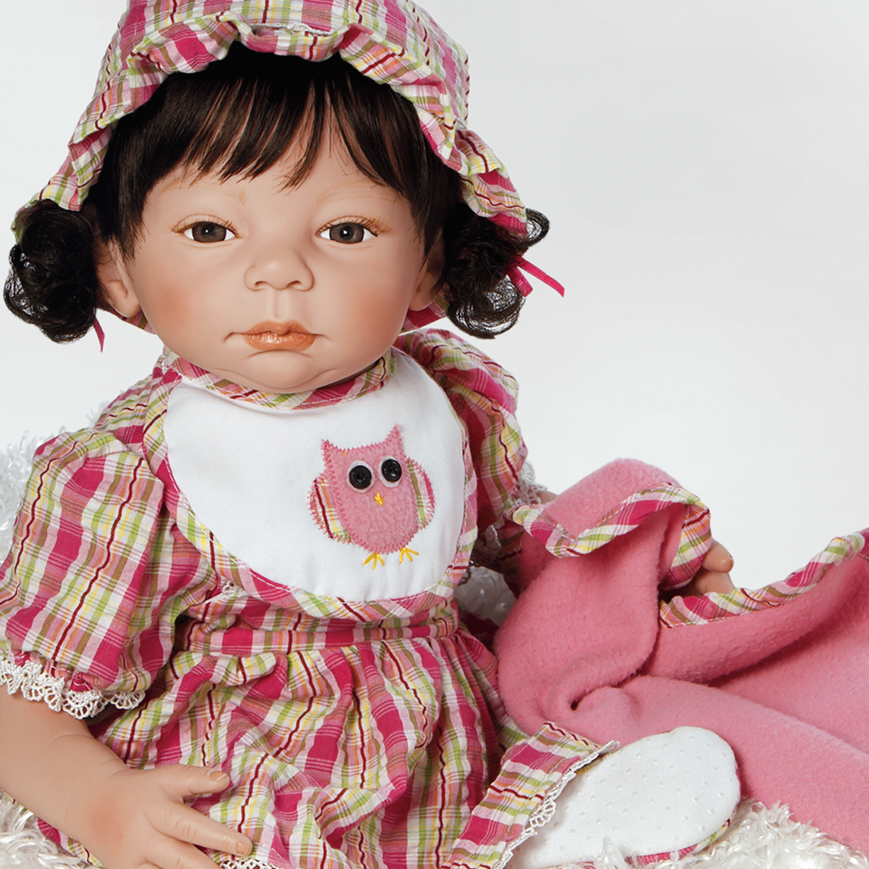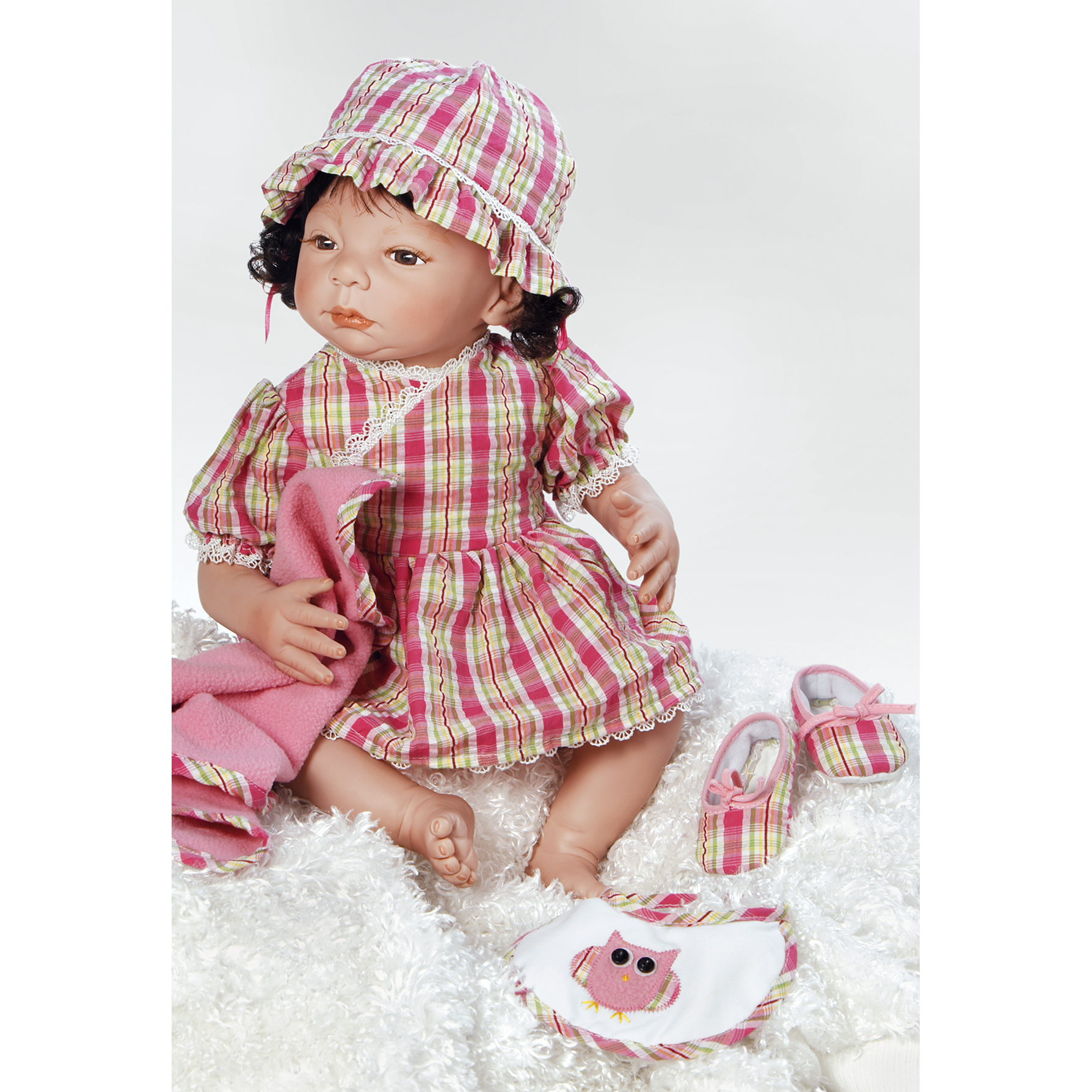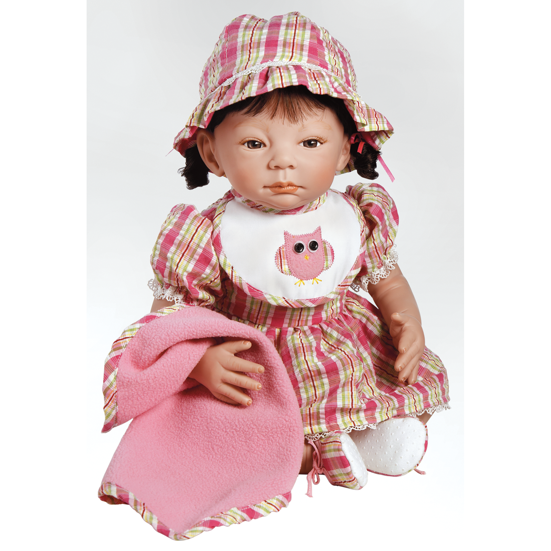 Sweet little darling “Madelyn” is our first ever "fan designed" lifelike baby doll! In 2012 we held a “Design a Doll” contest where fans were able to help us design the doll, eye/hair color, and outfit they most wanted to see us develop…and the winning doll has arrived, meet “Madelyn”. She is dressed in a pink, green and white plaid seersucker short puff sleeve dress with a cross-over front bodice. Her matching plaid hat with white lace trim cover her head gently, under her hat she has the softest brown hair tied in pigtails and held together at the ends with pink satin bow.