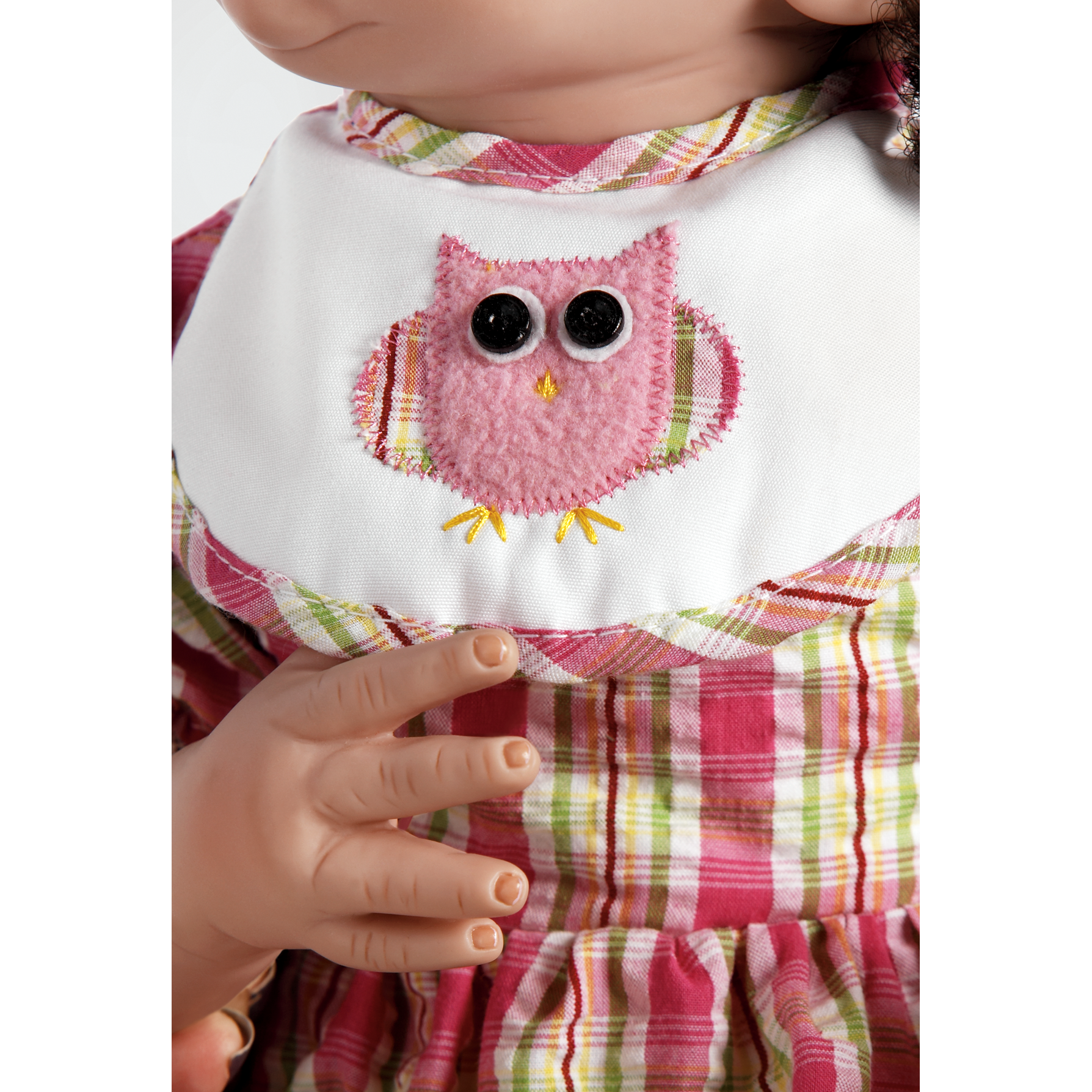 Madelyn’s feet are adorned with matching plaid shoes that have pink binding along openings and tie in a bow. To keep her dress clean at all times is wearing a white woven bib with a plaid binding that ties at the back of the neck, and is perfectly embellished with a pink owl fabric applique and button details for the eyes. “Madelyn” will stay warm forever wrapped in her pink polar fleece blanket with matching plaid binding and cuddling in your arms!