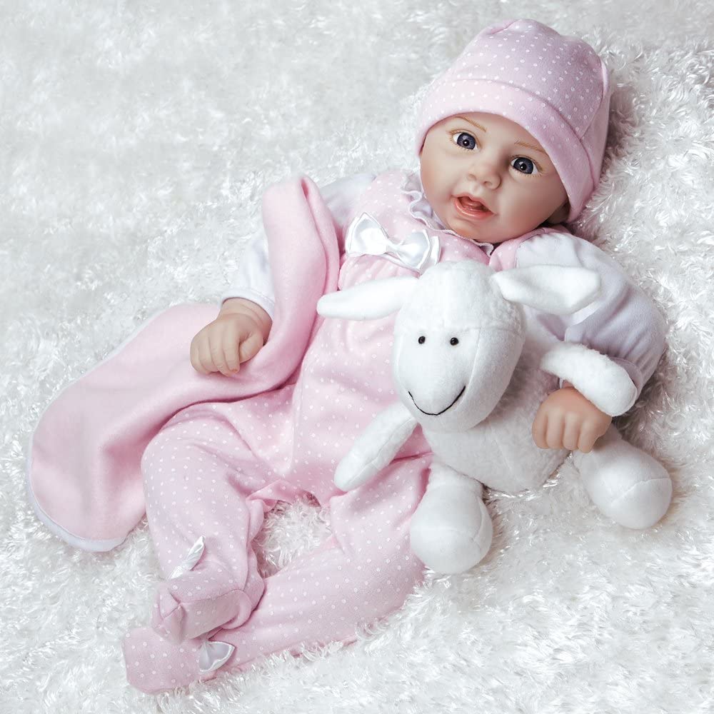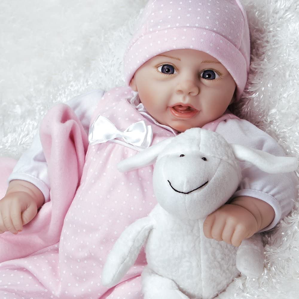 Rachael wears a white jersey knit long sleeved top layered under the softest pink Swiss dot jersey knit jumper with a white stain double stack bow centered on her chest. She arrives nestled in her very own baby bed, featuring a ruffle edge with pink satin ribbon, pink handles for easy transport, and a sweet sheep design lining. Also included is a soft pink ruffle pillow to rest her pretty little head, a fleece lined pink blanket with white trim, and a bottle that fits perfectly in her mouth for easy feedings. All the accessories needed for hours of nurturing time! Finally, a peppy plush lamb pal named Ramsey completes this enchanting ensemble.