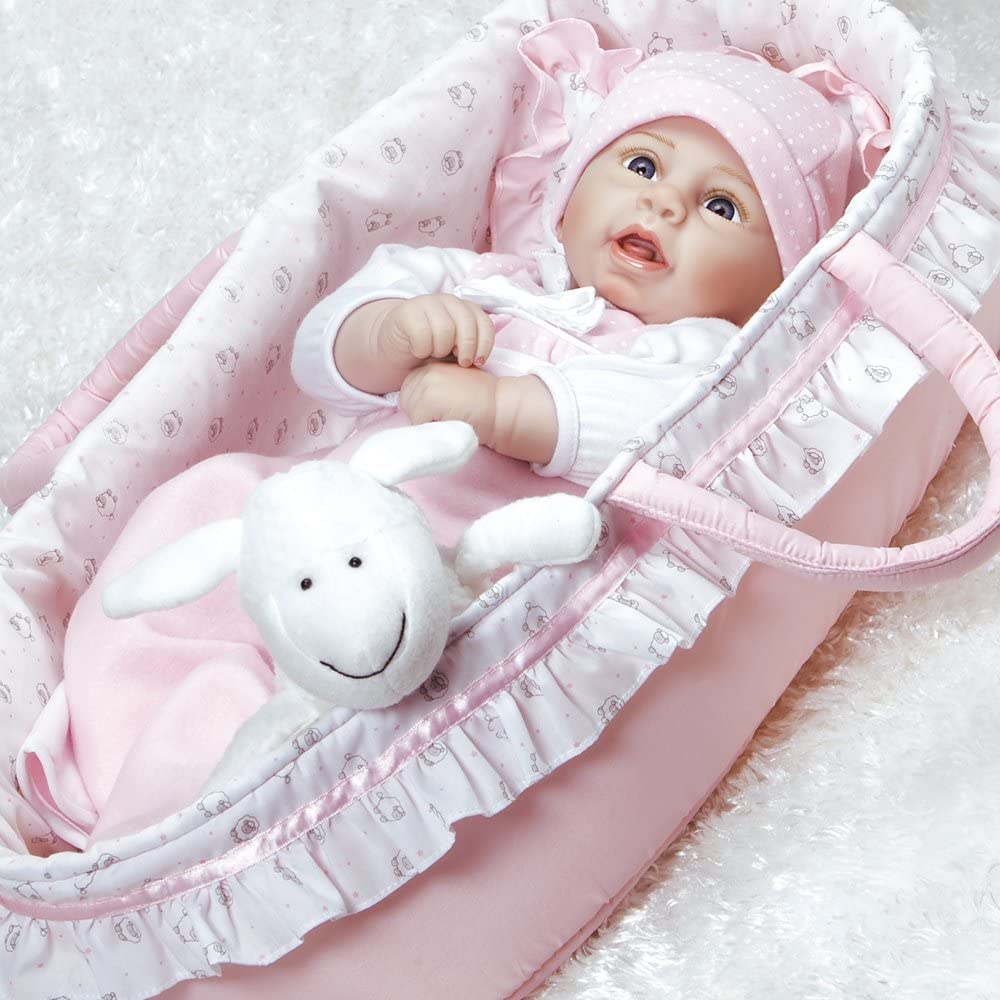 Fall in love with this sweet baby duo…Rachael & Ramsey! Baby Rachael’s 8 piece ensemble includes everything you need to bring baby home and nurture her including the perfect going home outfit, a bassinet with coordinating baby bedding, and sweet lamb lovey to cuddle. Baby Rachael is a realistic wonder with an open mouth and perfect pink lips that reveal a slightly curled tongue. Her bright, wide-eyed expression will make you smile from ear to ear as she looks right at you with a strong, focused and ever alerts gaze. This newborn baby doll has a head of painted auburn hair hidden under a removable pink knit cap. And she’s perfectly sized for cuddling!