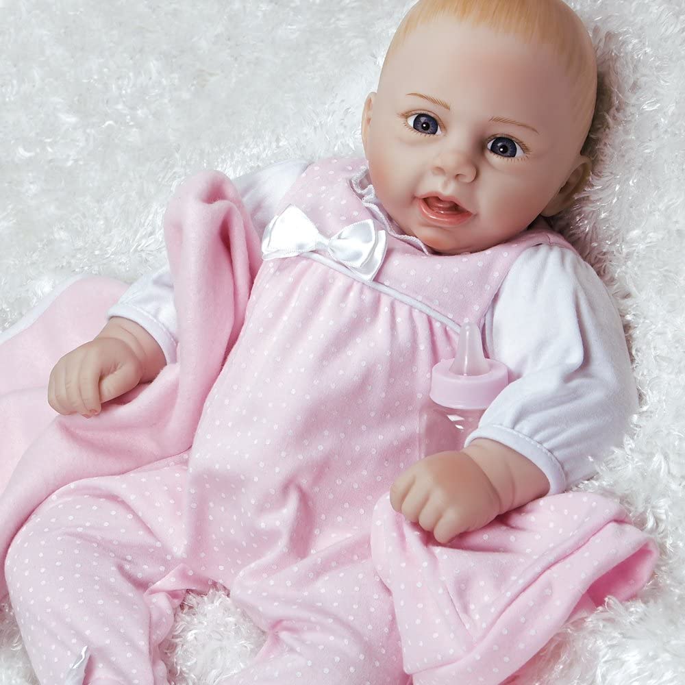 Rachael & Ramsey is a lifelike baby doll made in silicone-like vinyl. Rachael & Ramsey is masterfully sculpted by world-renowned Artist Jen Printy in true to life detail. She is handcrafted in Silicone-Like FlexTouch™ Vinyl and feels wonderfully lifelike with a weighted cloth body. This FlexTouch Vinyl helps her feel just like a silicone baby girl. This real-life baby doll comes with accessories shown, a numbered Certificate of Authenticity and an exquisite collector's box.