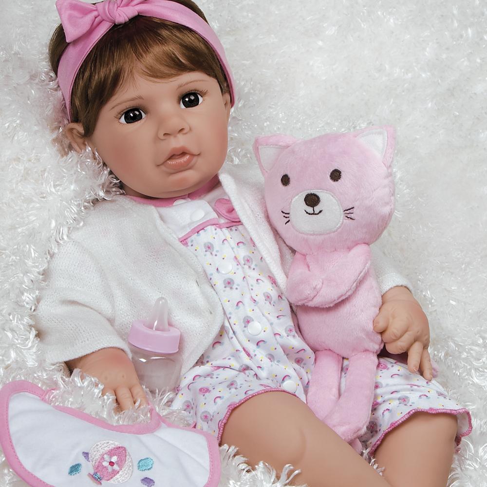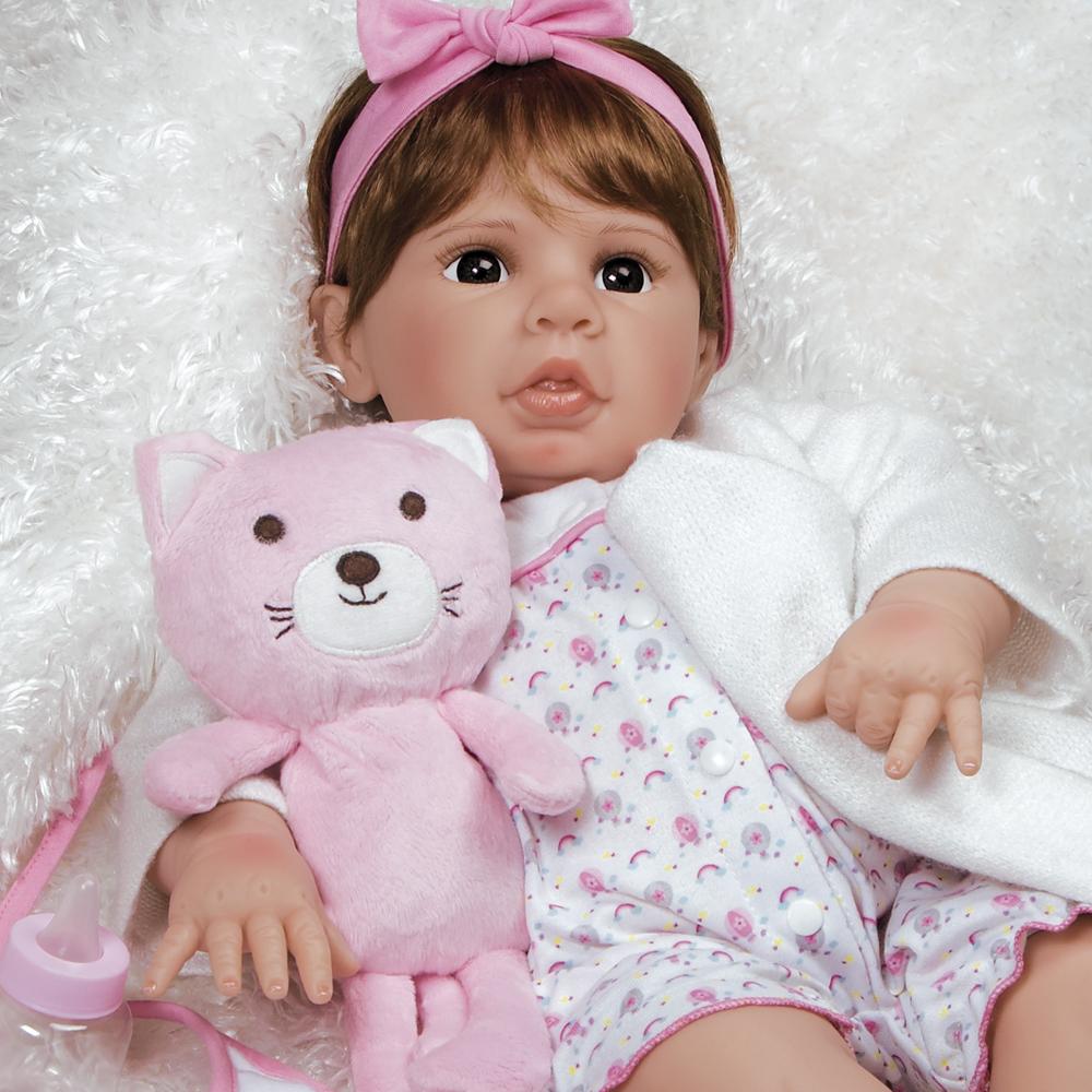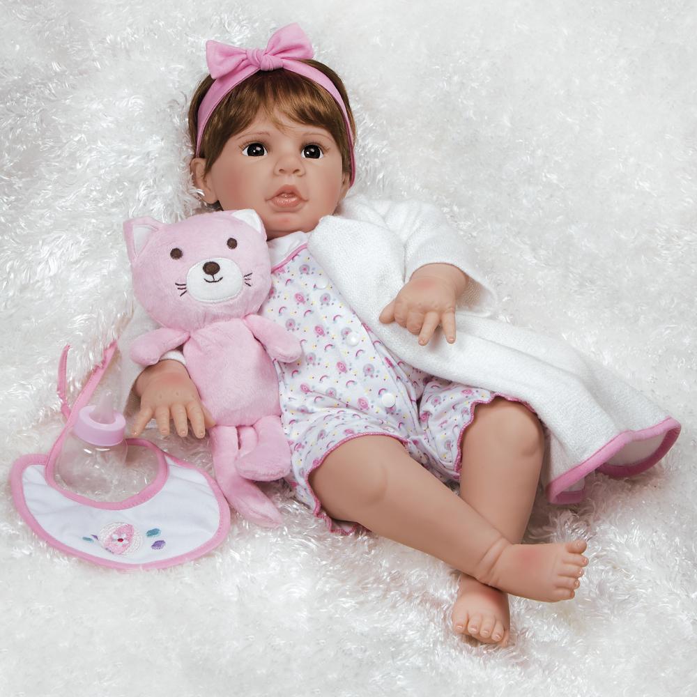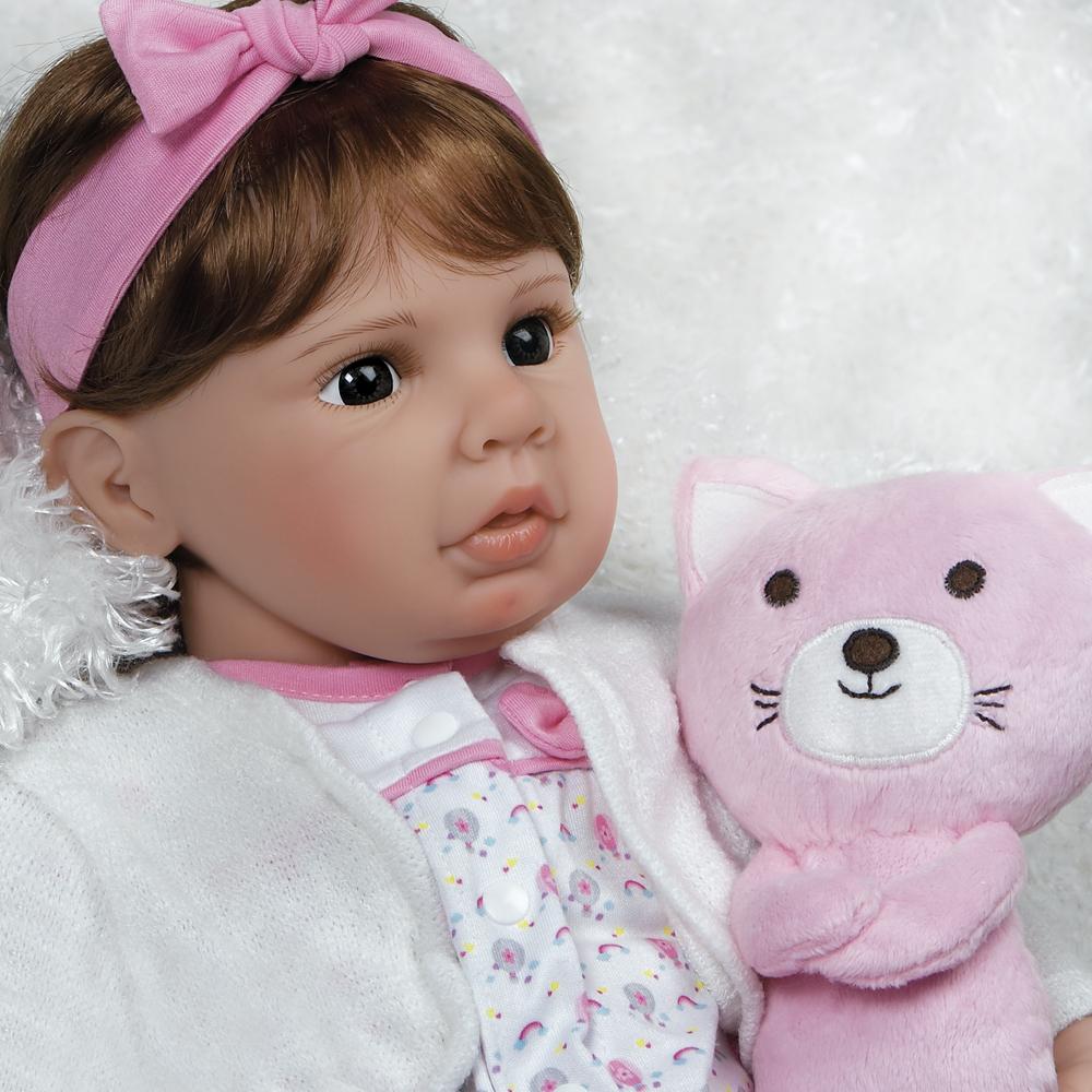 Purrfectly Pink is a lifelike toddler baby doll, masterfully sculpted by world renowned Artist Jen Printy in true to life detail. She is handcrafted in GentleTouch™ vinyl and feels wonderfully lifelike with a weighted cloth body. This vinyl doll looks and feels just like a reborn toddler. She comes with accessories shown, a numbered Certificate of Authenticity and a collector's box.
