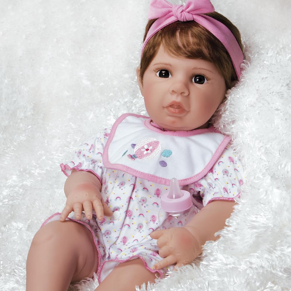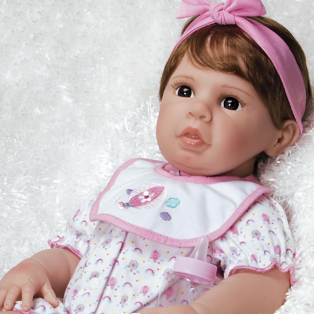 This realistic toddler-sized sweetheart has short auburn hair worn in a pretty pixie cut adorned with a pink bow headband. Her chocolate brown eyes, blushing cheeks, and tongue peeking through slightly parted lips add to her adorable, lifelike appeal. This 7 piece ensemble comes with a jumper, headband, sweater, white-lined fleece blanket with pink trim, sweet bib embroidered with a hot air balloon, baby bottle and, let's not forget her plush pink kitty pal that makes the purrfect co-pilot. Fly away with her!