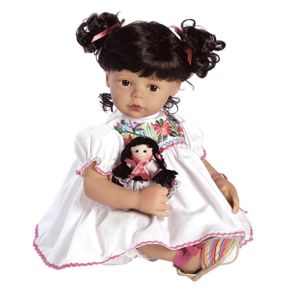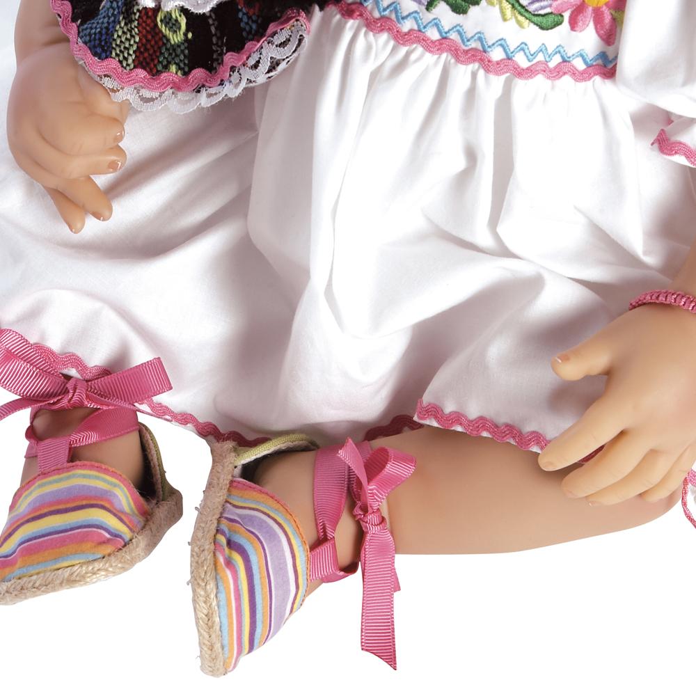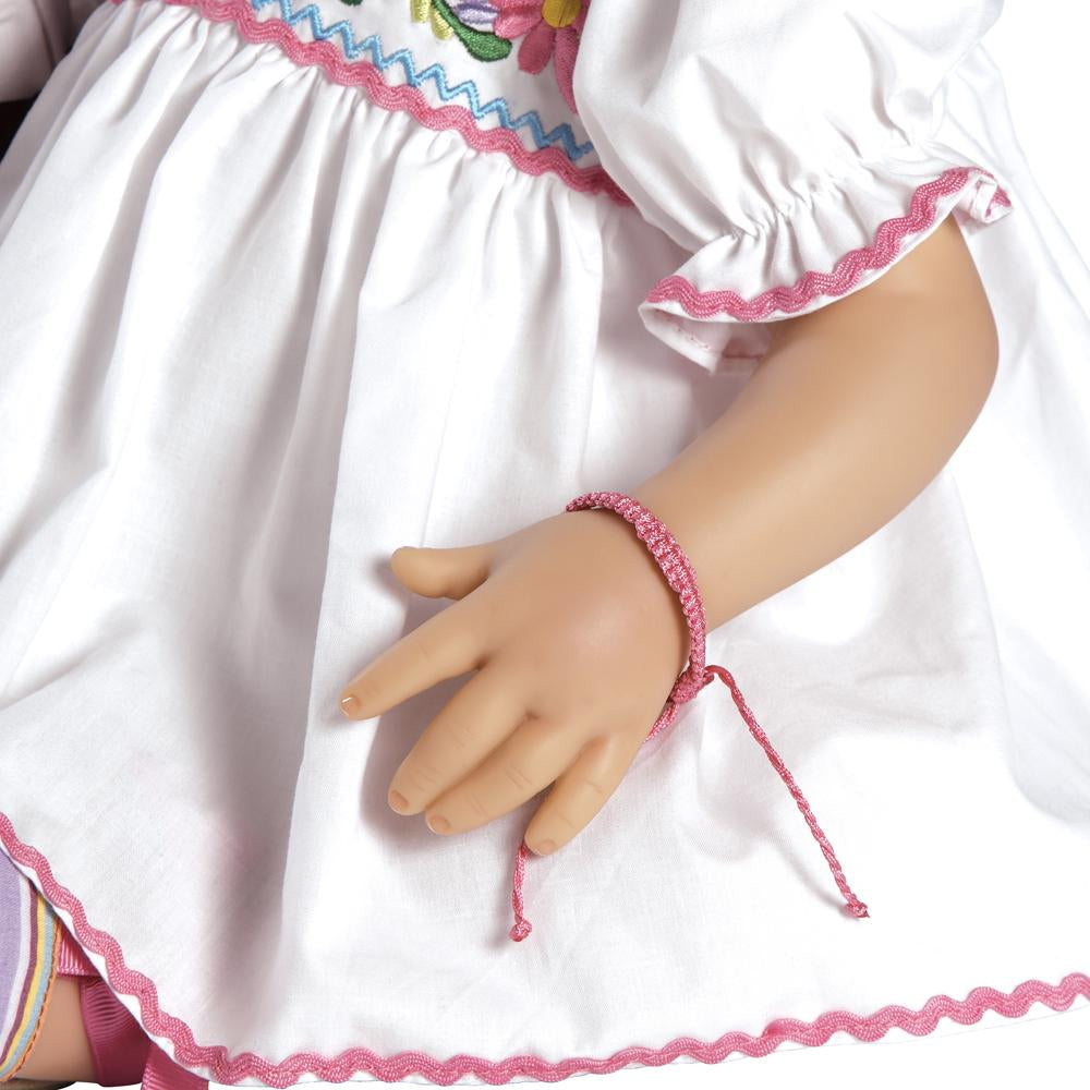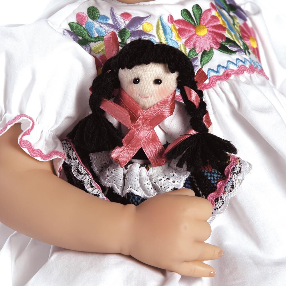 Meet one of the most beautiful Mexican Dolls – Cosita Maria! She is dressed in a traditional Mexican Artisan Puebla Dress with colorful embroidered floral details along the bodice and rickrack trim. She comes complete with white pantaloons with scalloped lace edging and pastel striped espadrilles that tie gently around her ankles. A braided pink bracelet adorns Cosita Maria’s little wrist as she lovingly cuddles her little yarn haired doll.