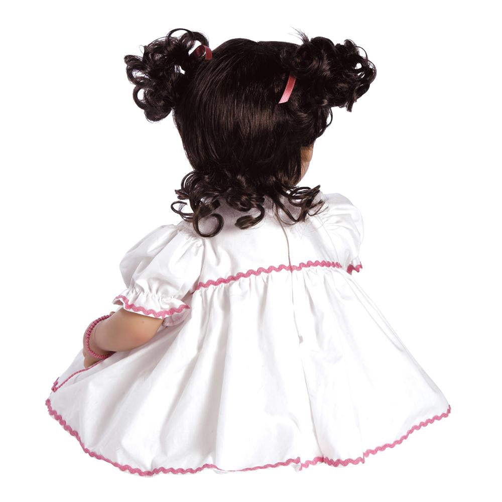 This little darling will definitely melt your heart with her deep coco eyes that innocently peer up from under her bangs and two adorable curly pig tails adorned with pink ribbons. Her sweet little pout, and blushed plump cheeks add to her playful look and will make you want to smother her with “Besos!”