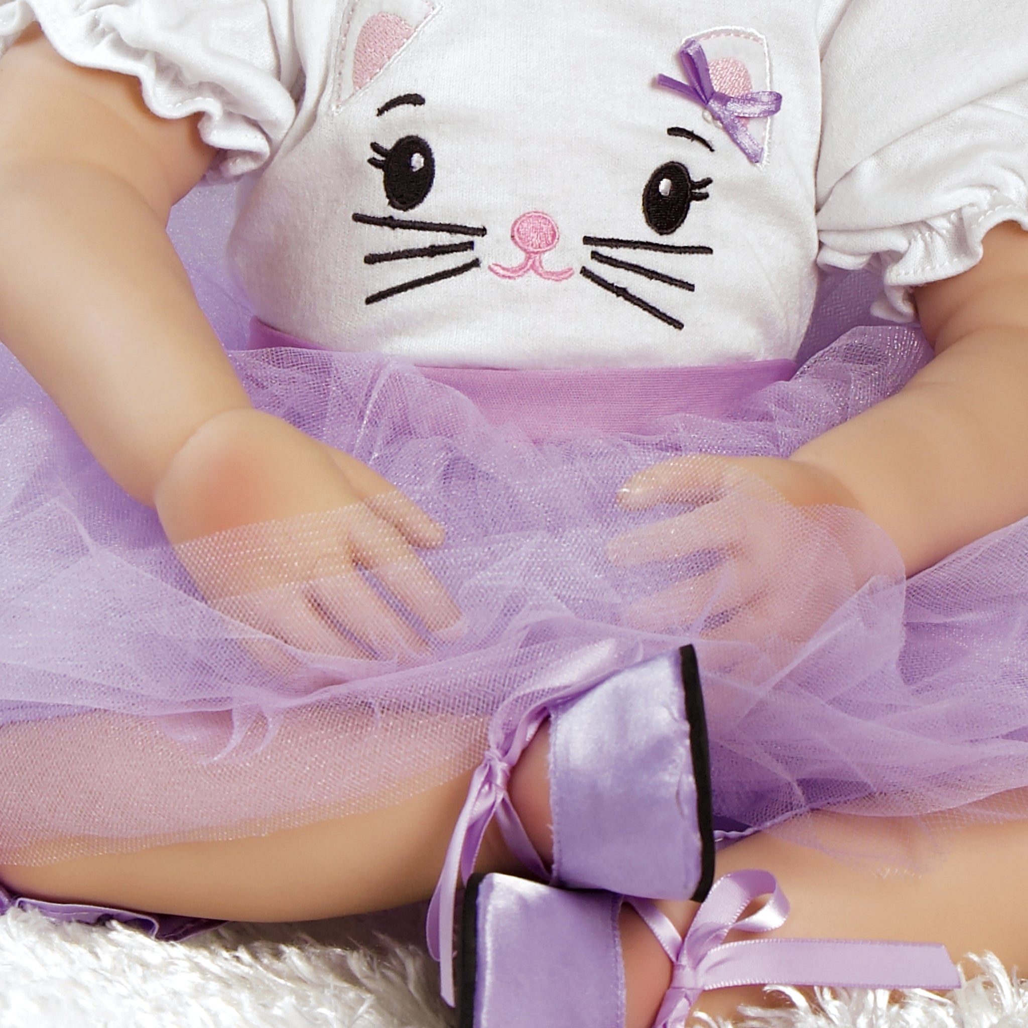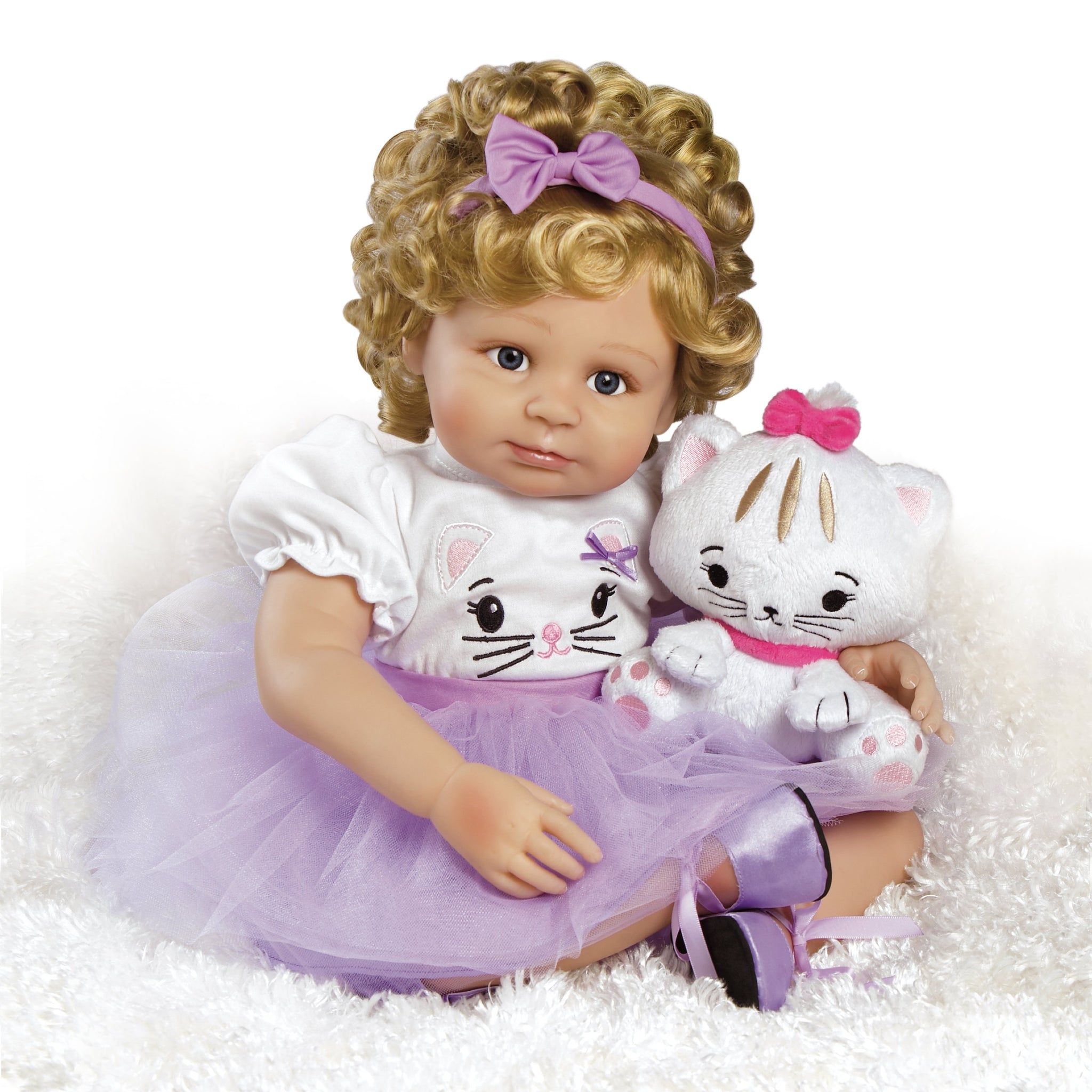 From her bright blue eyes to her blushed chubby cheeks and pursed lips, every realistic childlike feature on Miss Kitty Kate will make you want to take her on every new adventure. And what play date would be complete without her little “whiskers” plush pal by her side!