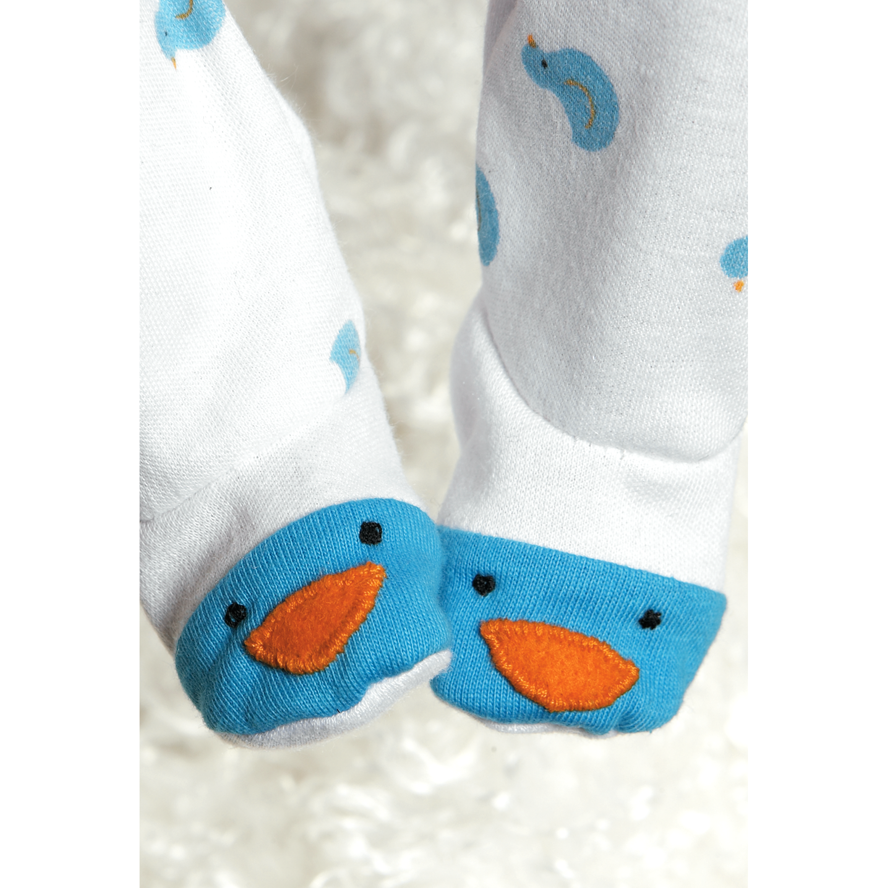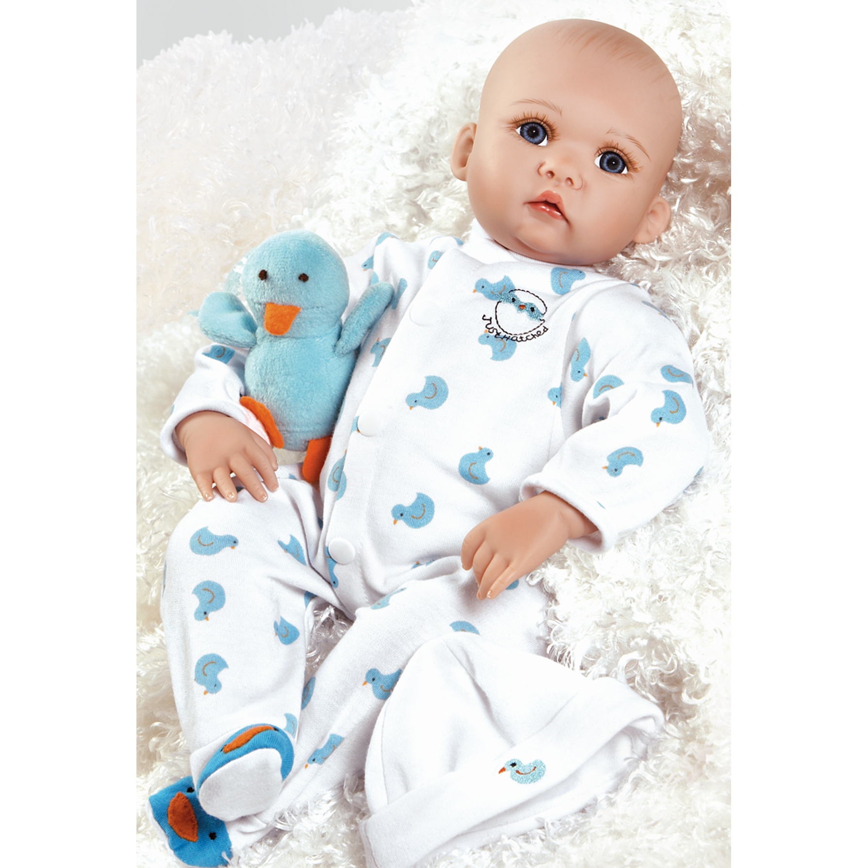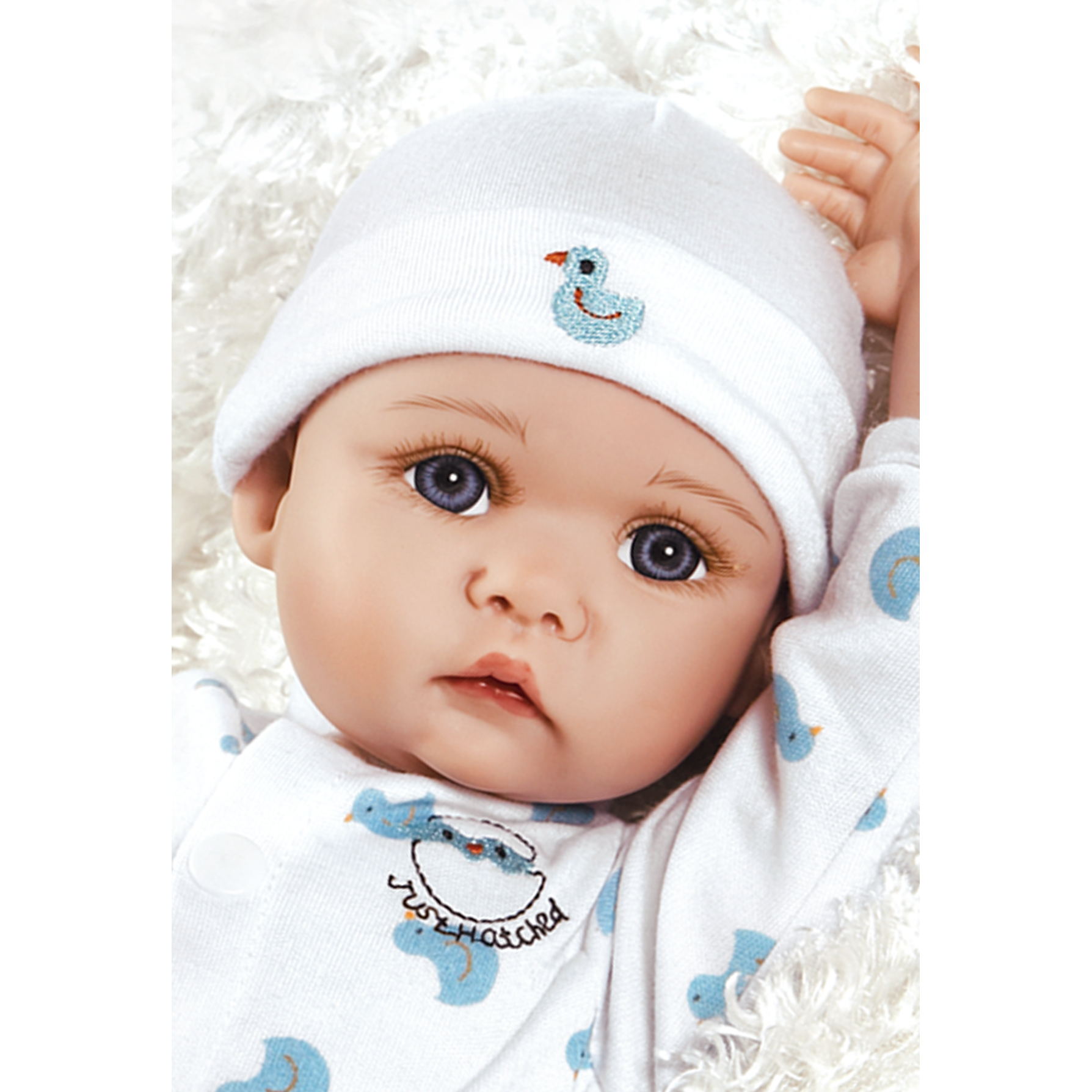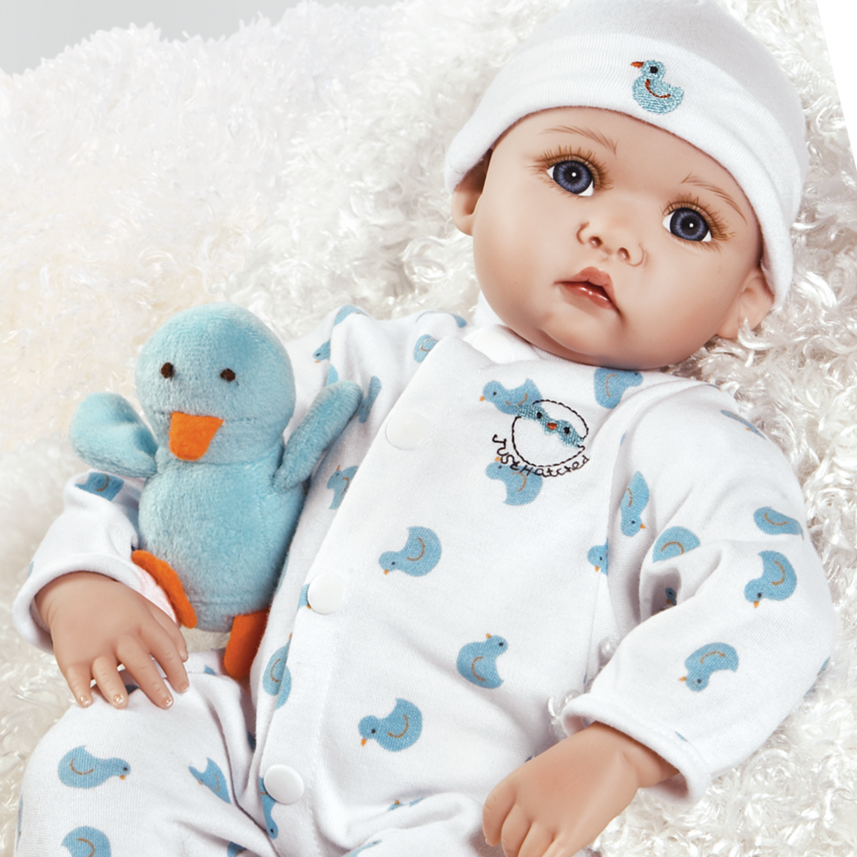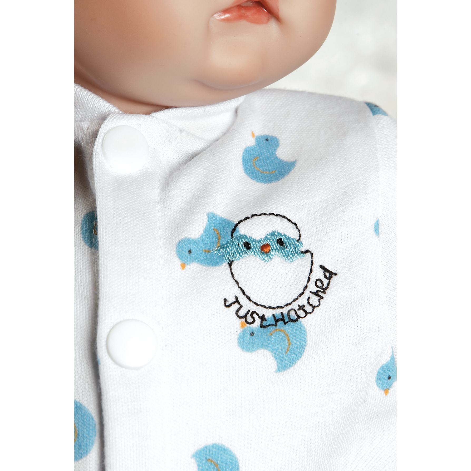 Spring has sprung and this realistic baby doll has “Just Hatched” and he's ready to cuddle in your arms. He is dressed in a white cotton double knit jersey sleeper onesie with blue ducky printed pattern, embroidered delicately on his front left chest is his name “Just Hatched” and an adorable ducky peering out his hatching egg! The sleeper also has matching ducky faces printed on the footies. His big blue eyes and sweet pouty face make him oh, so cute…and to keep his head covered and warm is an adorable white cotton hat with blue ducky embroidery. This little sweetie cuddles his blue ducky friend made of cozy fleece, the perfect naptime companion.