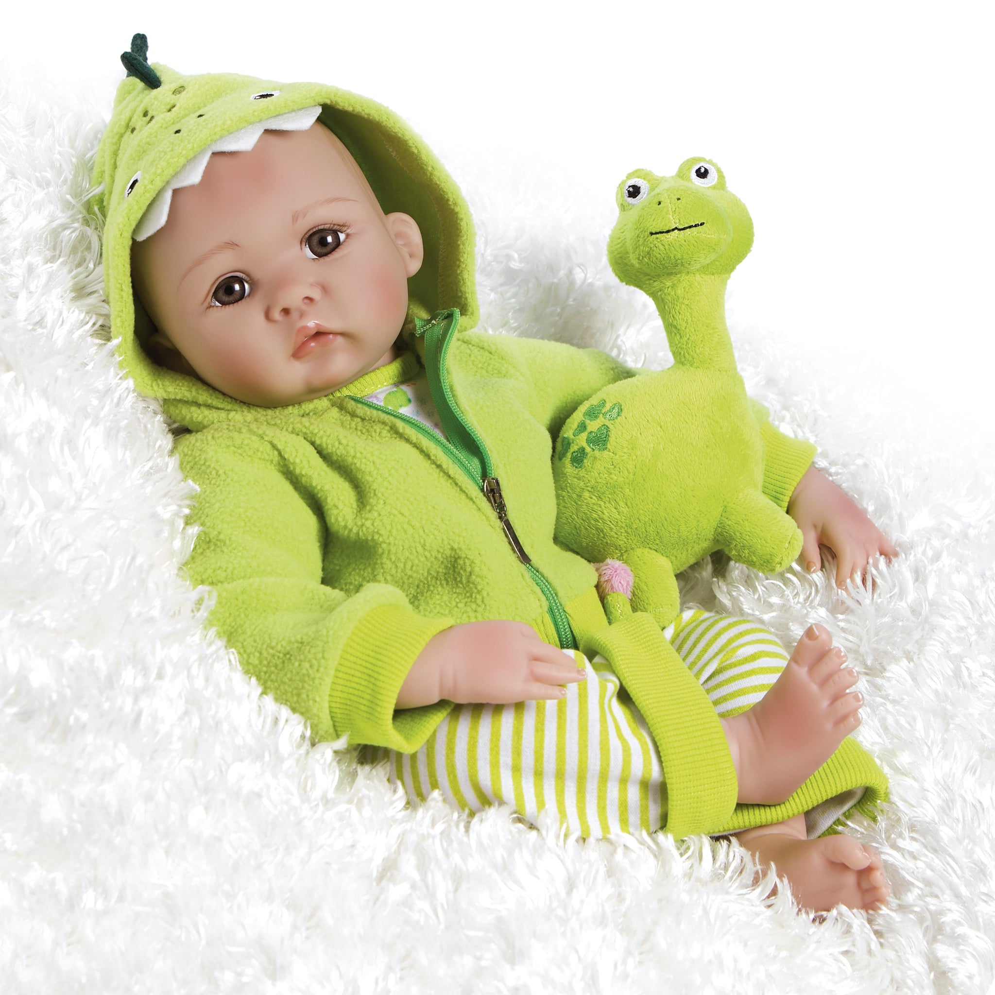 Cuteness of big proportions are found on this little cutie, Dino and Rex! This precious baby has bright hazel eyes that peer curiously from beneath his adorable fleece hoodie! This realistic baby boy doll has two plump blushed cheeks and an adorable pout. And a peek under his hat reveals hand-painted soft-looking brown hair.