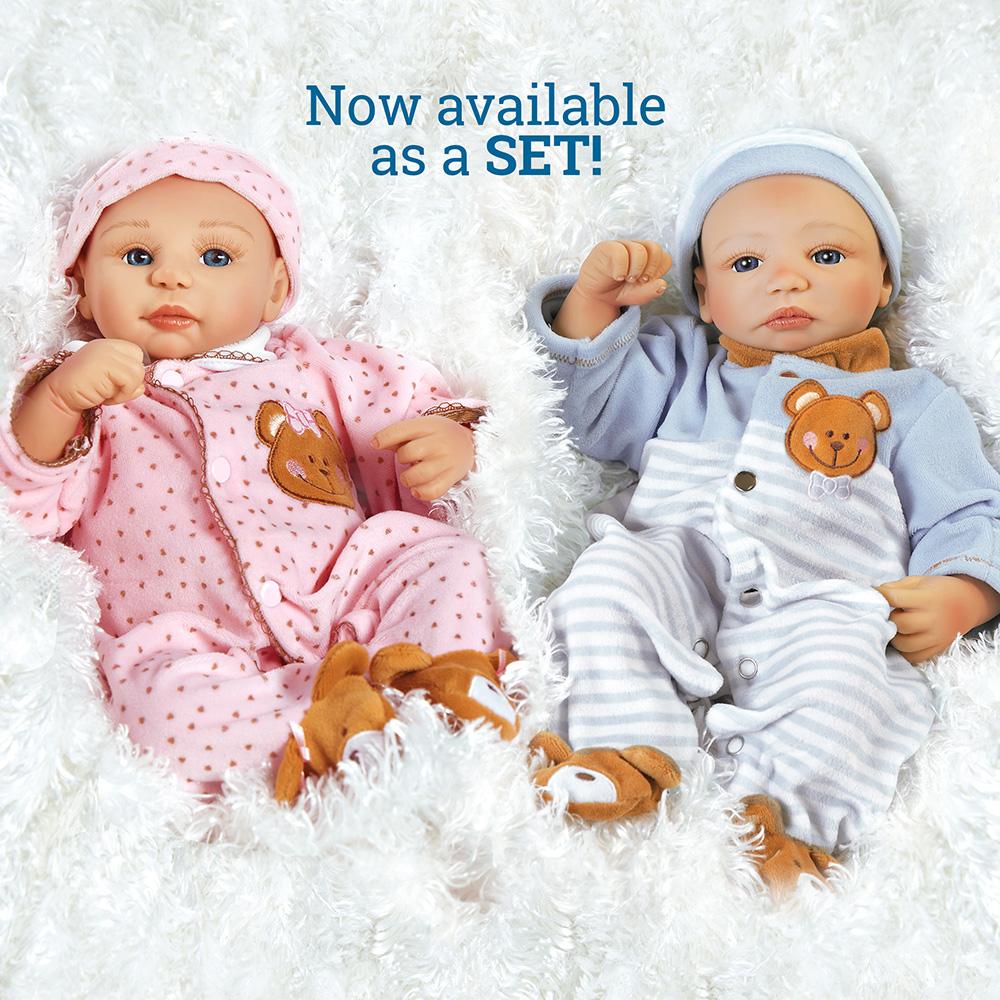 “Teddy Bear Twins” are each lovingly handcrafted from our trademarked GentleTouch™ vinyl, measures 16 inches from head to toe (smaller than most of our other dolls) and comes with accessories shown, a numbered Certificate of Authenticity and an exquisite collector's box.