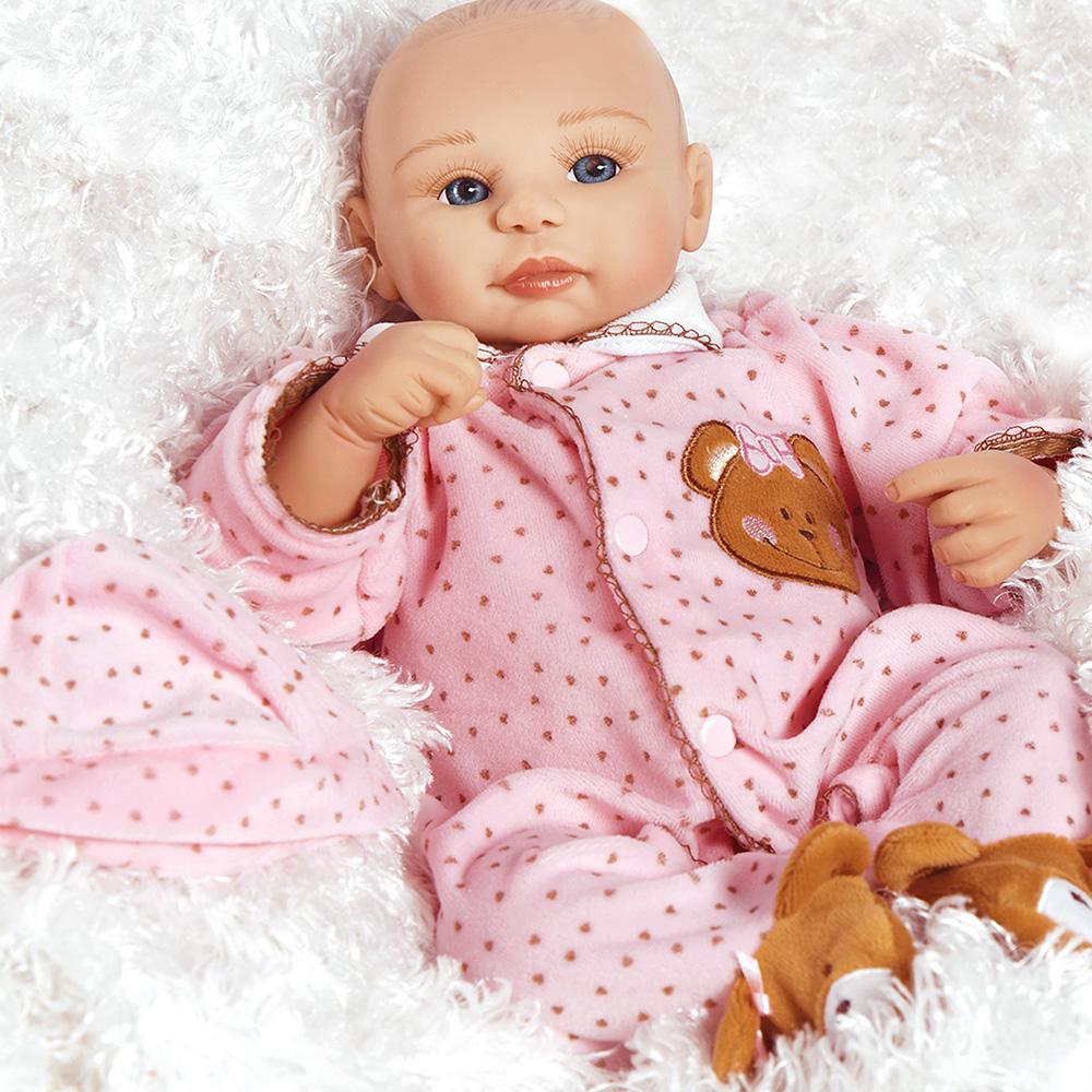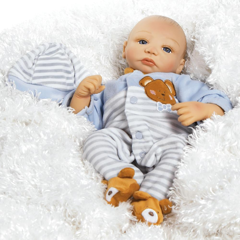 AIDAN - Twin brother Aidan will surely send you over the edge with his powerful charm! Let yourself experience the sweet joy of cuddling a newborn baby doll in your arms and feel the magical moment when you stare right into his gentle eyes and you will surely notice yourself swooning over him! This little darling is dressed in a blue and white striped fleece onesie each with cute appliquéd bear on the front while his twin sister is costumed in a pastel pink, teddy bear footed fleece onesie. This newborn baby doll’s cute and cuddly “preemie” size features with our popular weighted body make for the perfect for cuddling buddy!