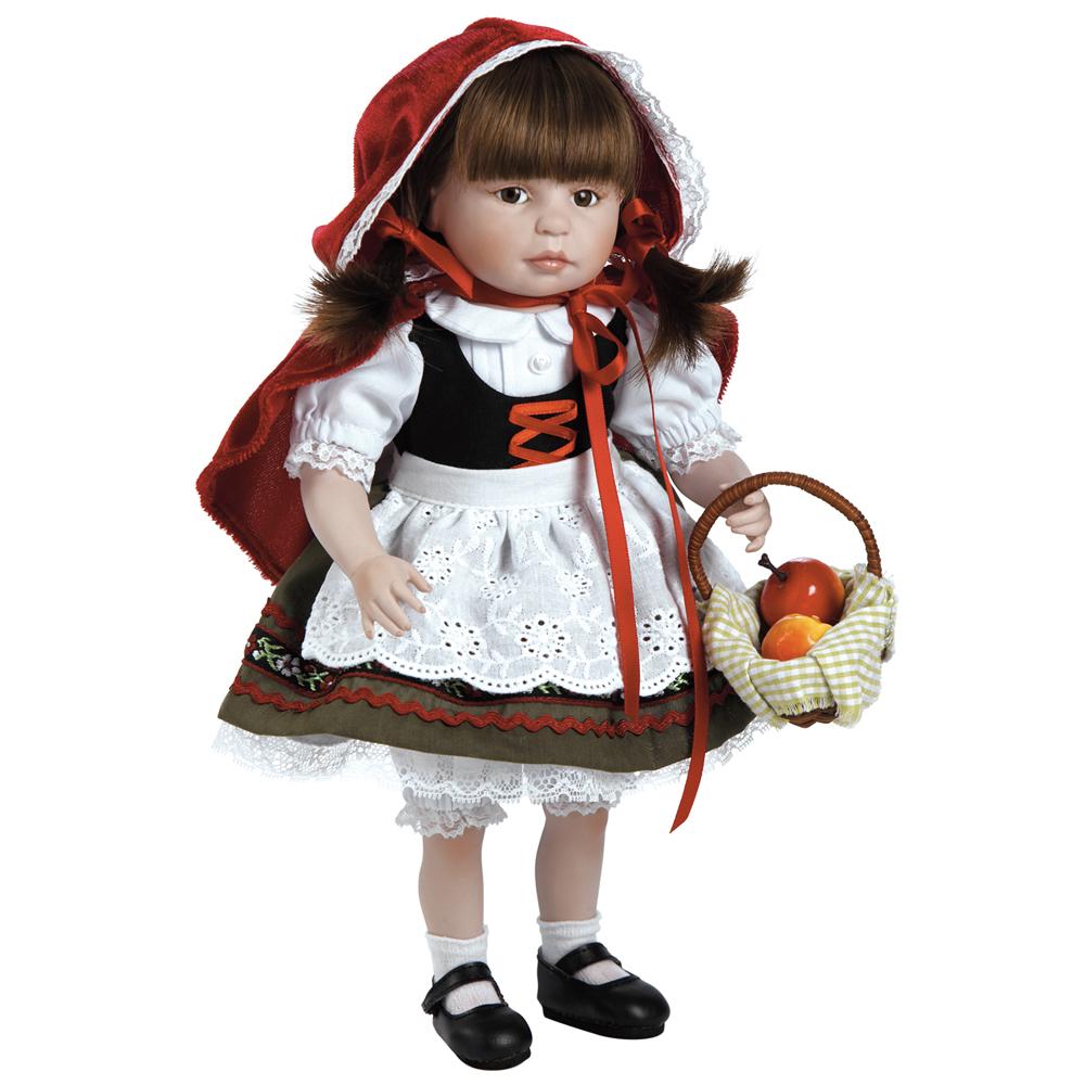 Little Red Riding Hood wears her iconic red velvet cape with delicate scalloped lace trim on the hood and a satin red ribbon that ties gently around her neck. Her puff-sleeved dress has a black vest over the bodice with crisscross ribbon down the front and her trademark Peter Pan collar peeks out from beneath. Her olive-green skirt features a floral pattern trim and ric rac along with a layer of scalloped lace that brings the perfect touch of softness to this stunning doll. Her dainty eyelet apron ties gently around her waist and is secured in the back with a bow. The dramatic contrast of soft white pantaloons and faux leather Mary Jane’s complete her storybook look.