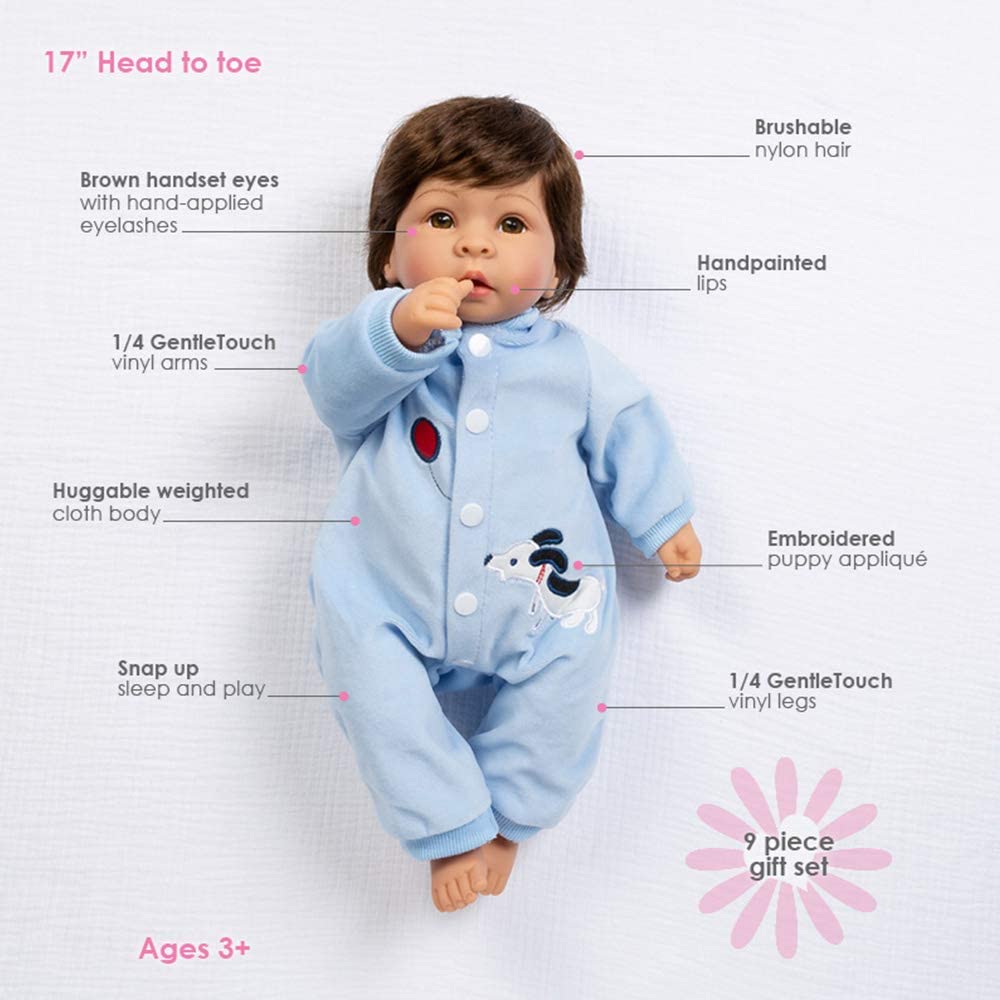 Our realistic baby boy doll and his cutest puppy make a perfect pair! This gift set has everything you need all-in-one! This baby doll set includes 9 pieces — a baby boy doll, fleece sleeper, fleece booties, hat with dog ears, plush puppy Sparky, diaper, bottle, bib, and a baby carrier. Finn has plenty of matching accessories with his baby doll set for hours of playtime fun. His real looking baby doll eyes are round and innocent, but it is his sweet blushed cheeks and round face that make us love this bundle of sweetness!