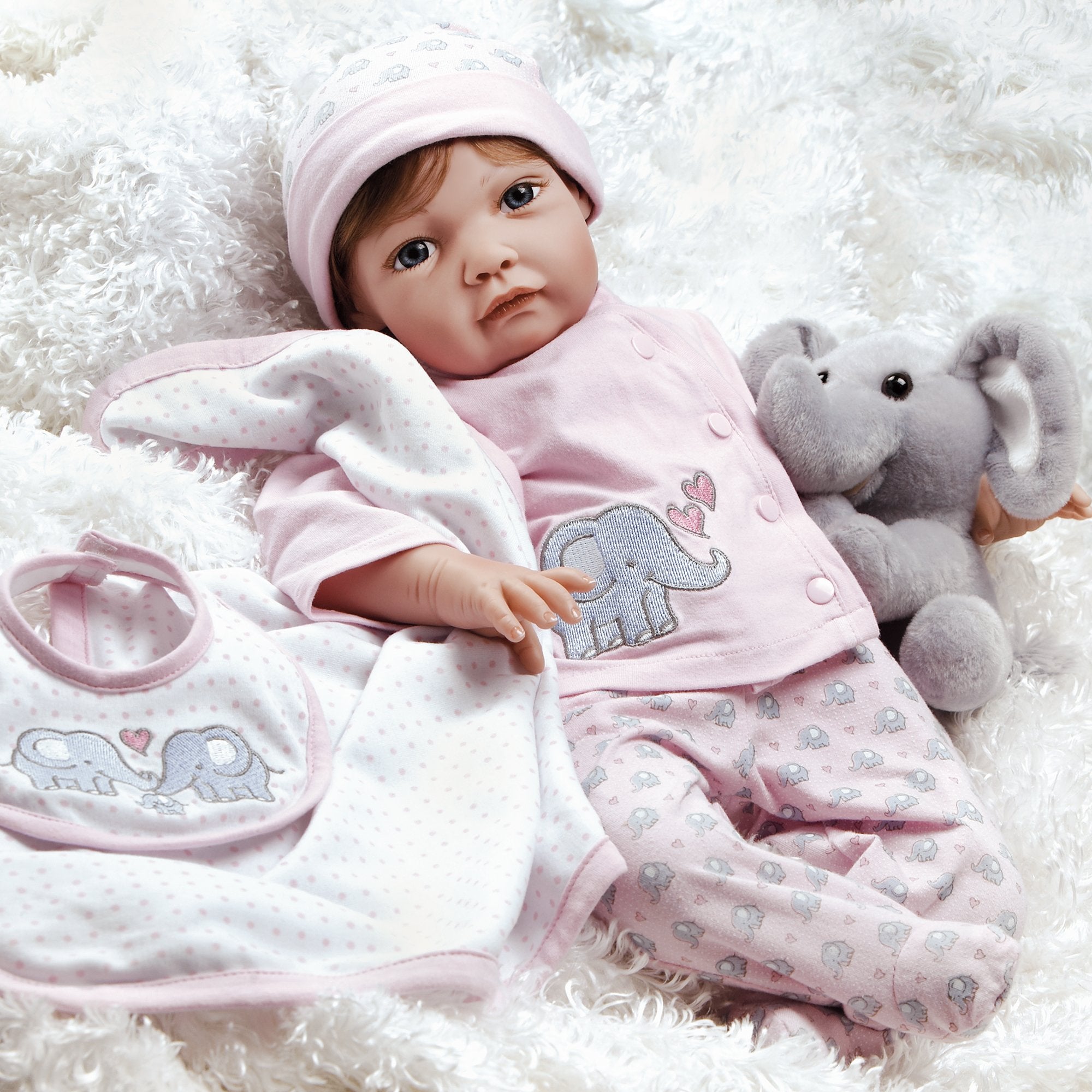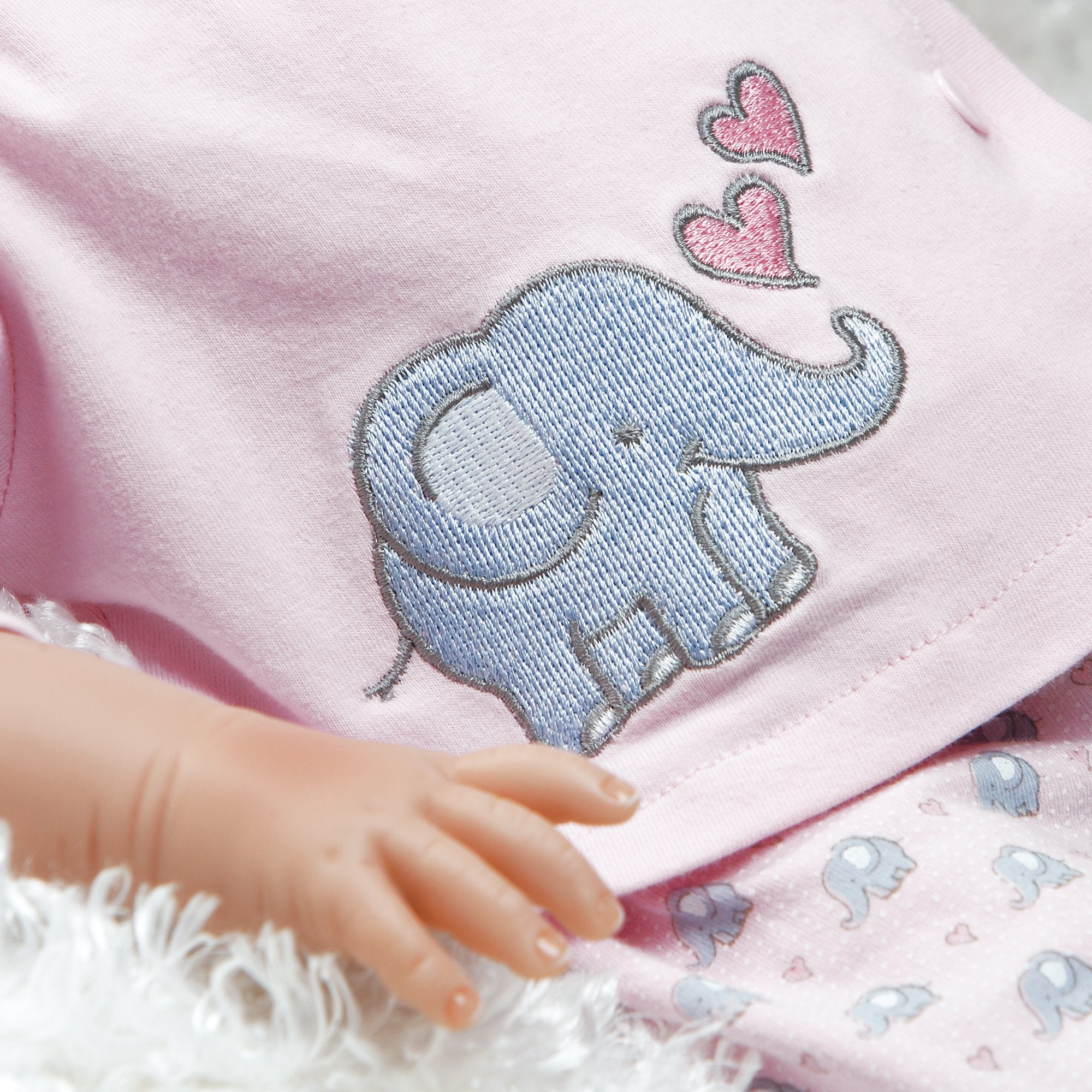 This darling girl is BIG cuteness in a small package! Precious Peanut is wildly cute in her baby pink pajamas that feature button snaps up the front with a sweet embroidered elephant and hearts on the bodice. This realistic baby doll looks so cuddly in her elephant print footie pajama pants and white knit under shirt! Peanut never plays without her plush elephant friend who is always by her side.