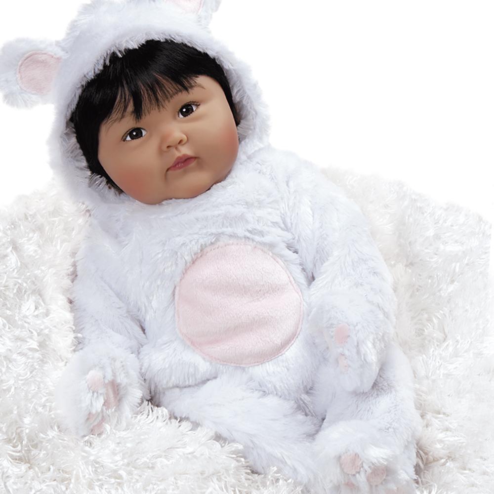Baby, it's cold outside! Thankfully Chilly Lily is snuggly warm, all cuddled up in her super soft and cozy polar bear bunting. Chilly Lily is an adorable Asian baby girl, quite possibly the cutest bear cub you ever did see. Well protected against the elements, she is outfitted in a pink and white striped polar bear onesie layered under a plush polar snowsuit, complete with attached pink padded paws, hoodie, pink inner ear, and belly accents.