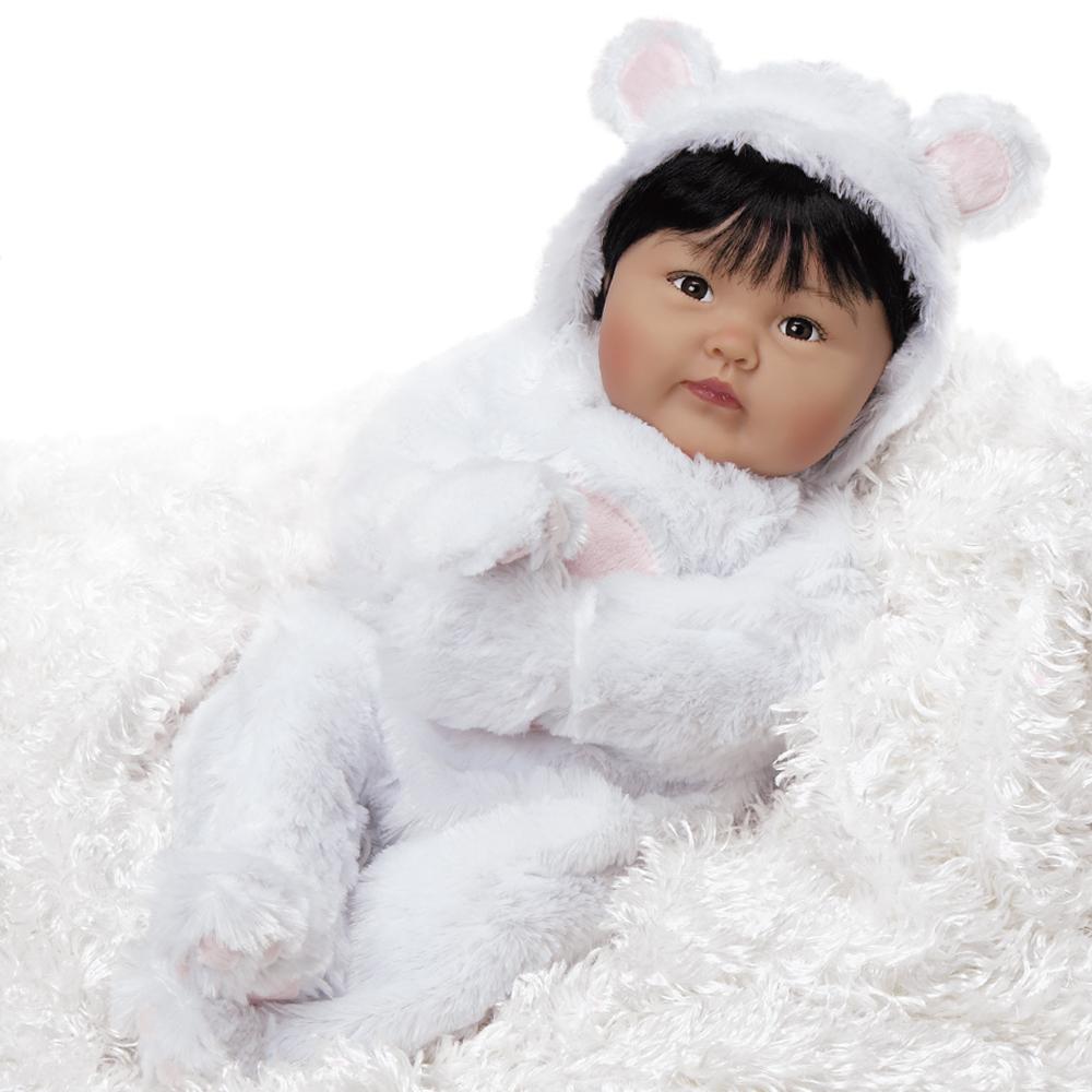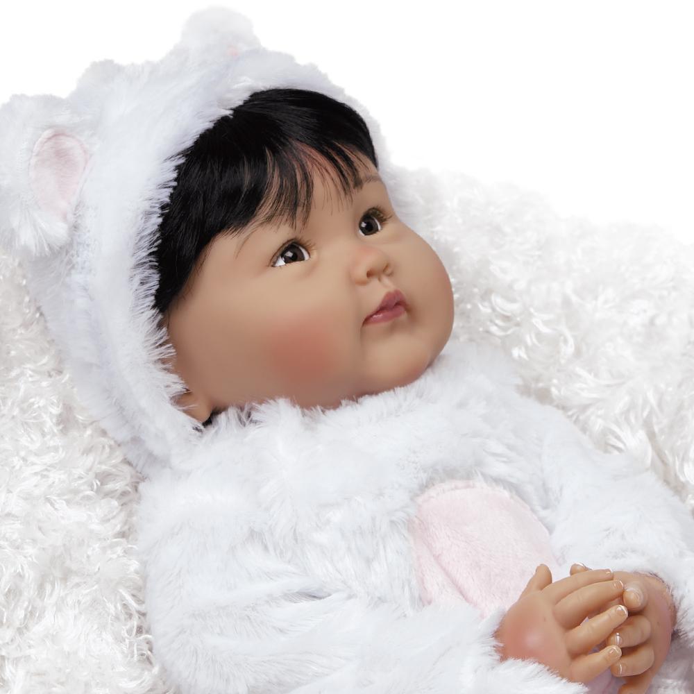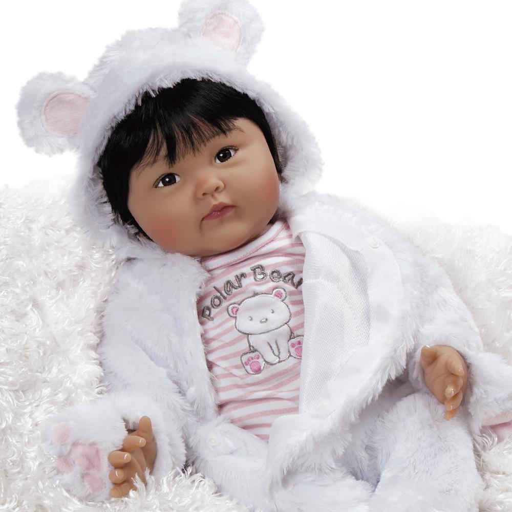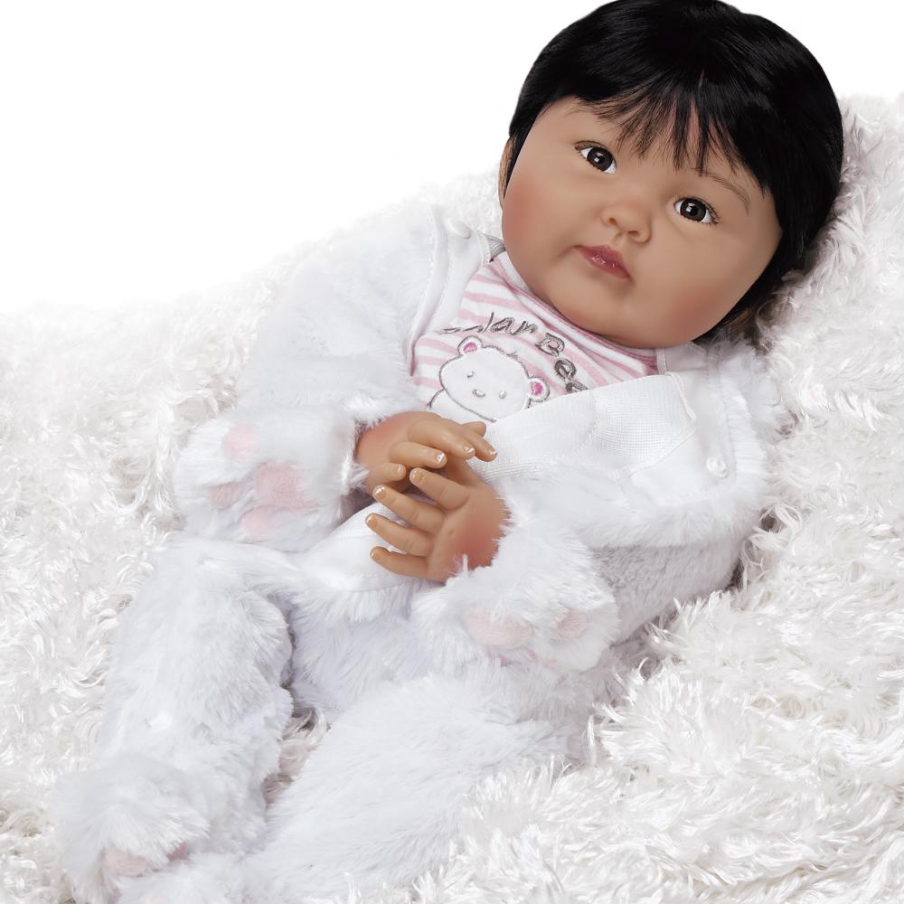 This arctic angel is a lifelike bundle of love featuring sweet and expressive almond-shaped eyes, handpainted eyebrows, shiny black hair, and a flawless olive complexion. You'll want to smother her rosy cherubic cheeks with dozens of Eskimo kisses, not to mention her perfectly pursed lips. When they aren't bundled up in warm bunting, her hands and feet show off realistic handpainted finger and toenails.