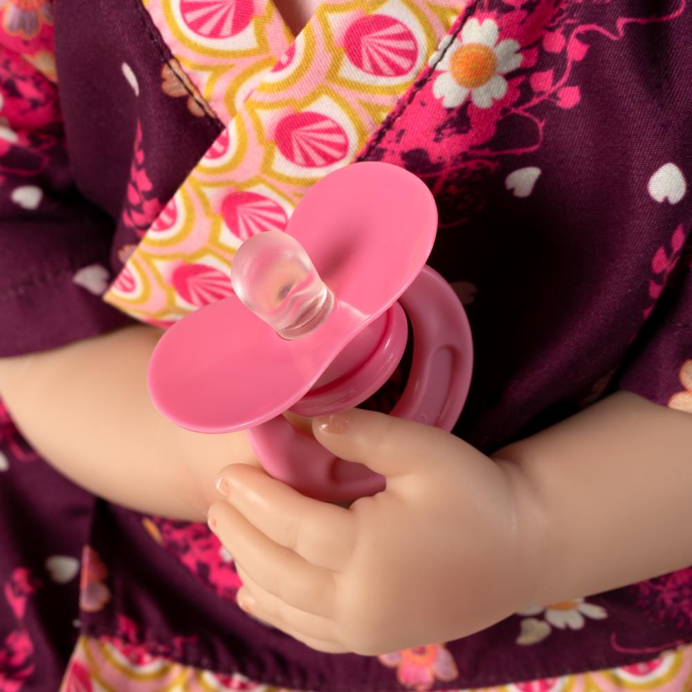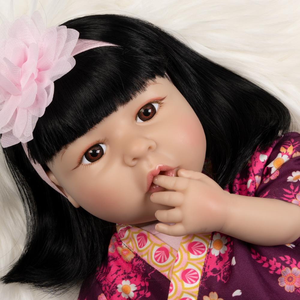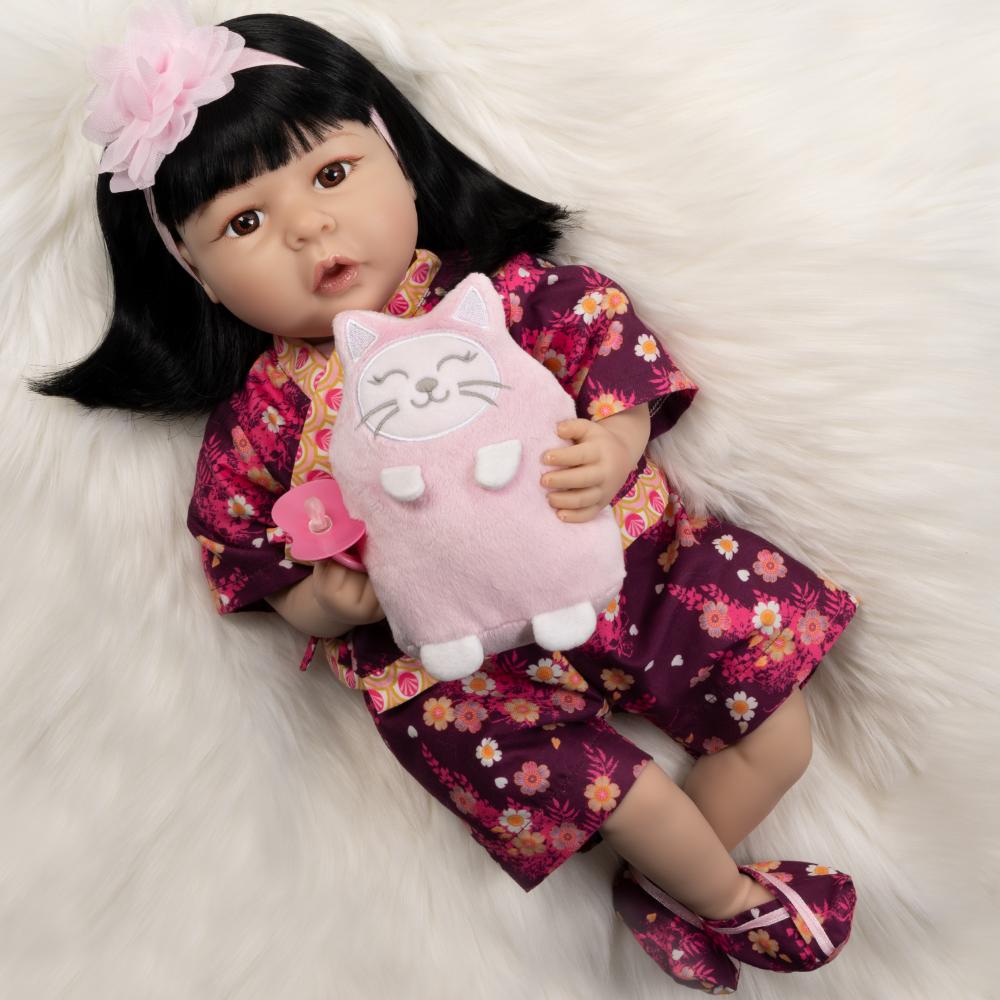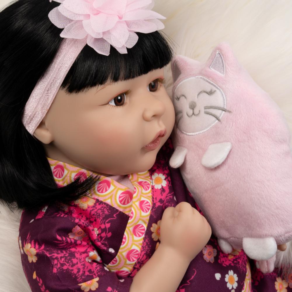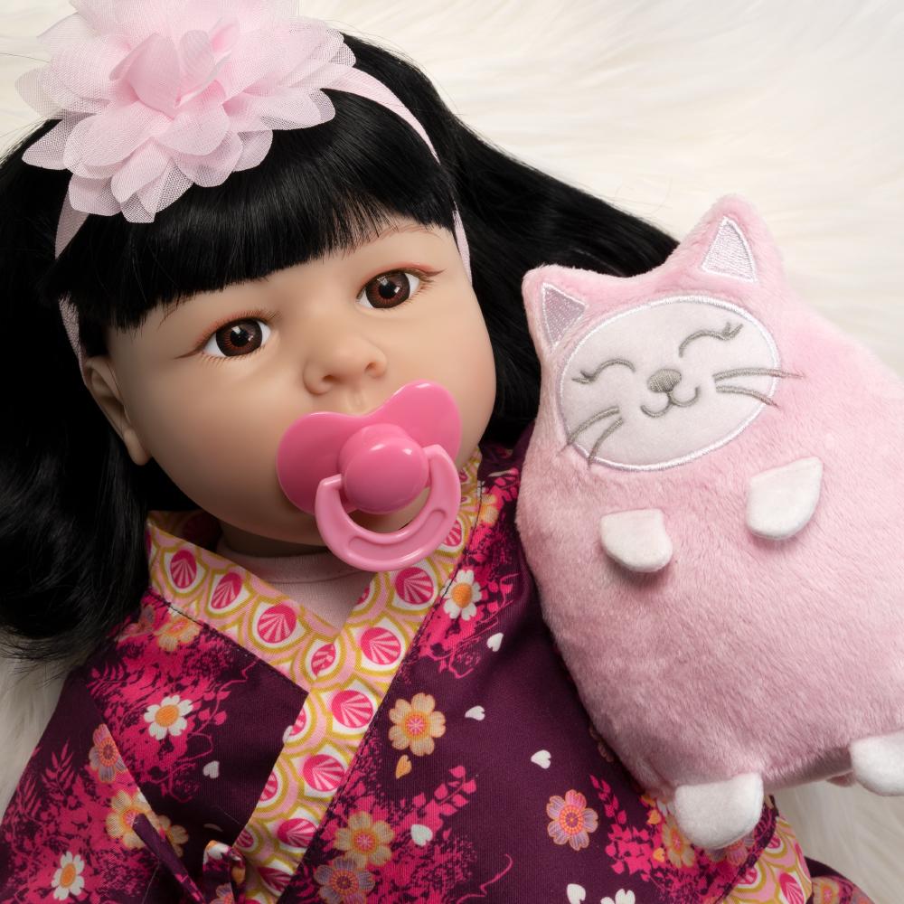 This beautiful lifelike Asian baby girl has squeezable cheeks, a pert nose, and realistic hand-painted lips in an open-mouthed expression. Her glowing brown eyes are framed by her long, hand-applied eyelashes and highlighted with winged eyeliner and bright pink eyeshadow to give her an extra Kawaii (cute) look! One of her most stunning features is her flowing, luxurious straight thick black hair with bangs that is held back by a light pink cloth flower headband, but can be styled in any which way! Kiko is elegantly dressed in a light pink onesie underneath her wonderfully soft berry-colored kimono with an exotic pattern of hot pink flowers and delicate daisies that match her shorts and dainty slippers. Her best friend Suki (meaning loveable in Japanese) is an ultra-soft light pink plush kitty with a cute little slip-pocket on his back, and he’s always there for Kiko when she needs a cuddle! When Kiko is tired from a day of playing in the springtime sun, she always has her bright pink stem pacifier to soothe her to sleep.