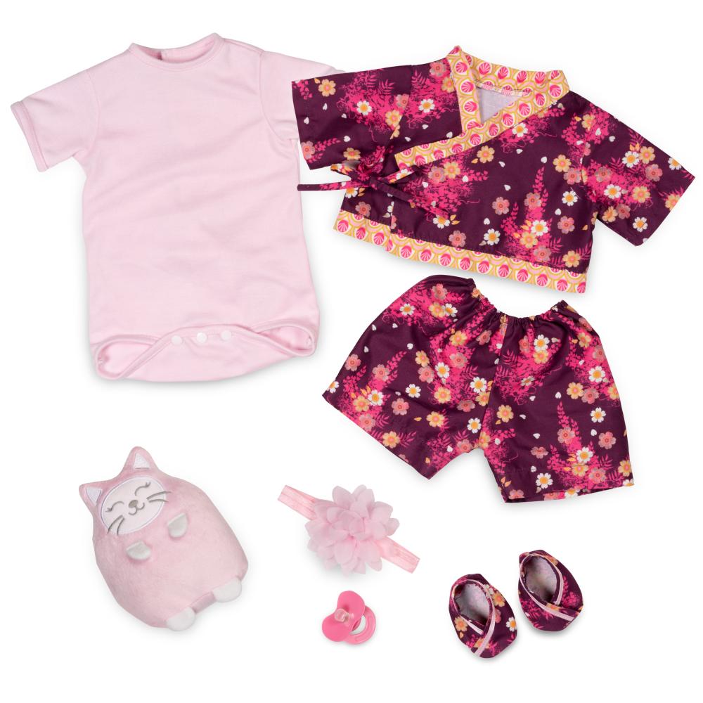 - Comes with a light pink onesie, a bright floral-patterned kimono with matching shorts and slippers, a cloth headband with a tulle flower, and a stem pacifier.
