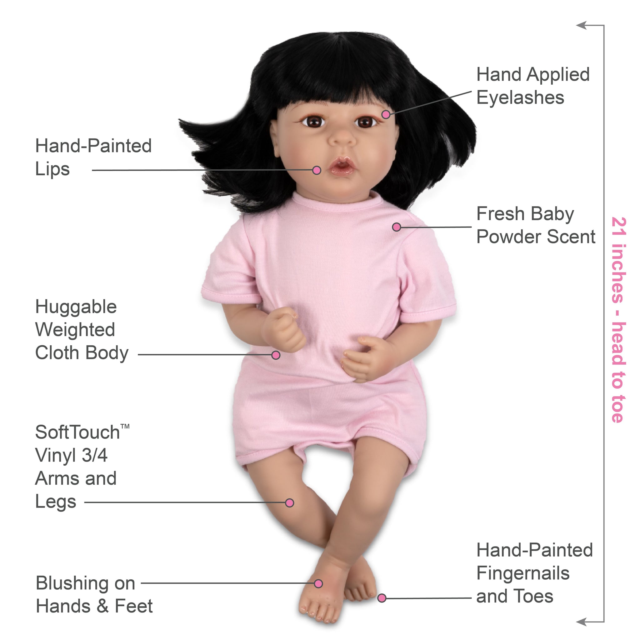 Kiko is beautifully handcrafted with an original Paradise Galleries sculpt and constructed with our exclusive SoftTouch vinyl, giving her a delicious, fresh baby powder scent and snuggly-soft skin. Intended for reborn doll collectors aged 14+.