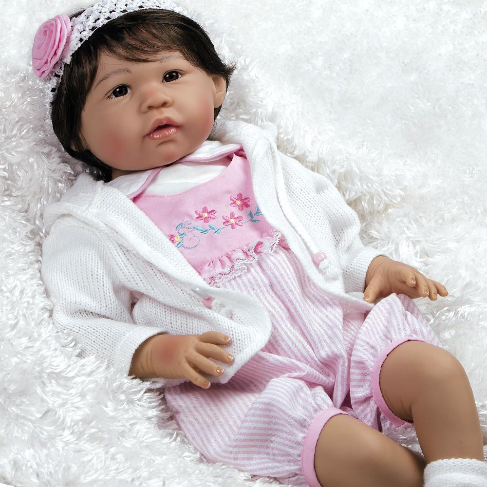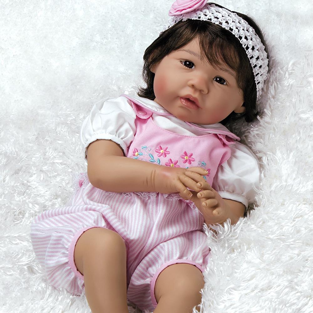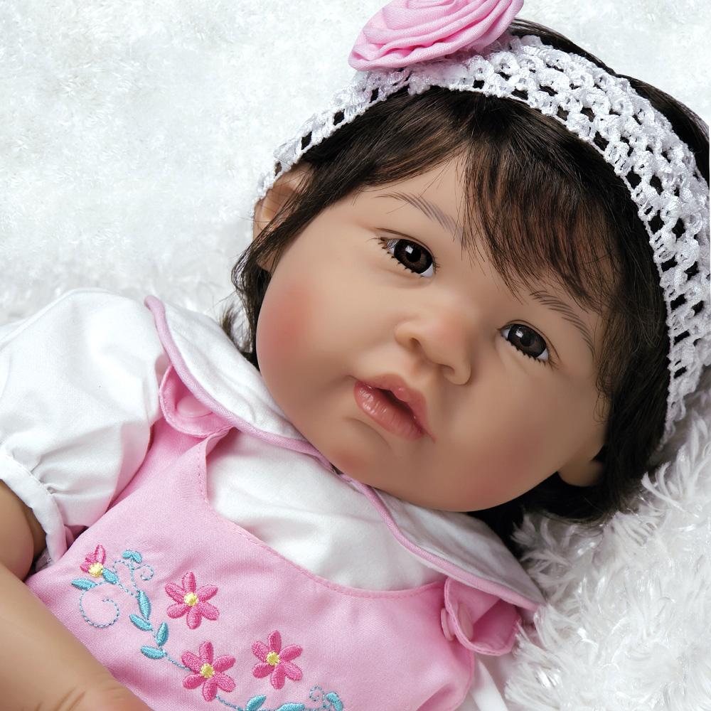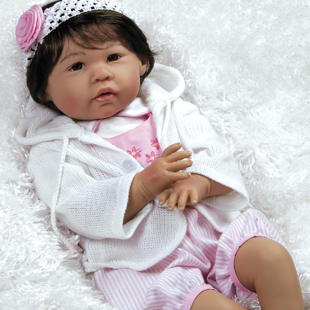 Meet Sakura, the sweetest Spring beauty whose name means cherry blossom in Japanese. Give a nice warm Konichiwa (hello!) to this irresistible Asian baby doll who will brighten your day in her spring studded seasonal ensemble. Sakura wears a lightweight cotton jumper that features pink button snaps at the shoulder, a pink top with embroidered pink blossoms sprouted on the bodice, pretty pink and white striped bottoms and lovely lace and ruffle detail at the waist. Her jumper is layered over a white poof sleeved topped with a Peter Pan collar finished with pink trim. Sakura also wears a light white knit sweater hoodie with tie, hand knit white crocheted headband with pink flower accent, and matching white knit socks. Sakura has the softest short brown hair, a slightly open mouth and the rosiest of cheeks.