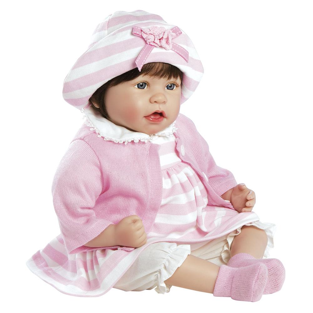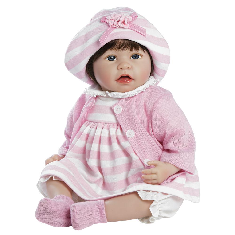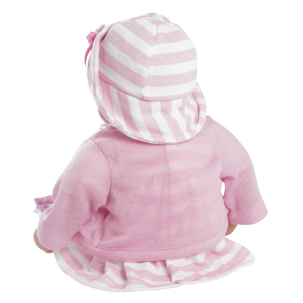 Picture perfect Penelope is ready to be loved! She's as charming as can be and adorably outfitted in a sweet pink and white striped jersey knit dress with daintily trimmed Peter Pan collar. Whether she's spruced up for Sunday brunch or sitting pretty in the sandbox, she is primed and prepped for a cool breeze, stylishly layered with a cotton candy cardigan and matching socks to keep those tootsies warm. Her vintage look is anchored by a pair of crisp white pantaloons and topped off by a matching striped hat, embellished by a delicate duo of crocheted roses centered on a pink ribbon.