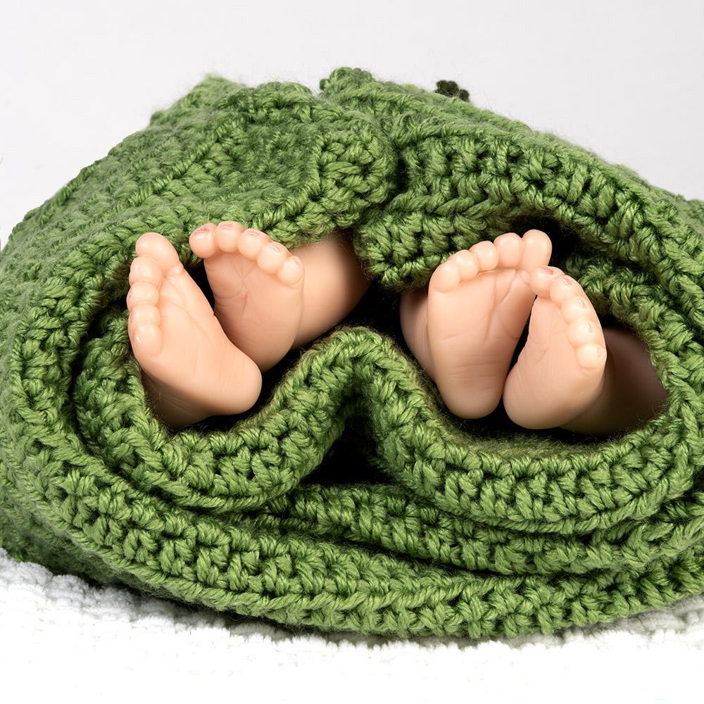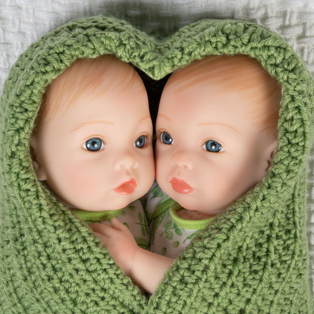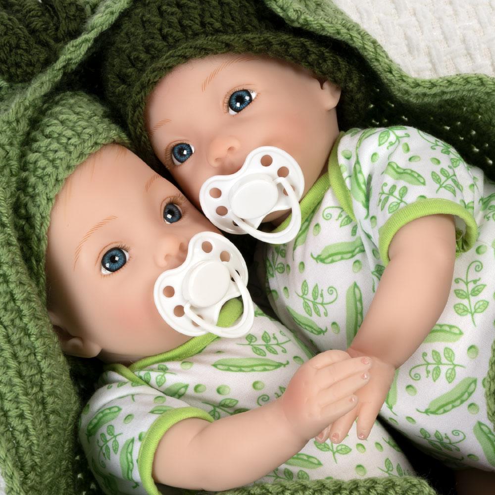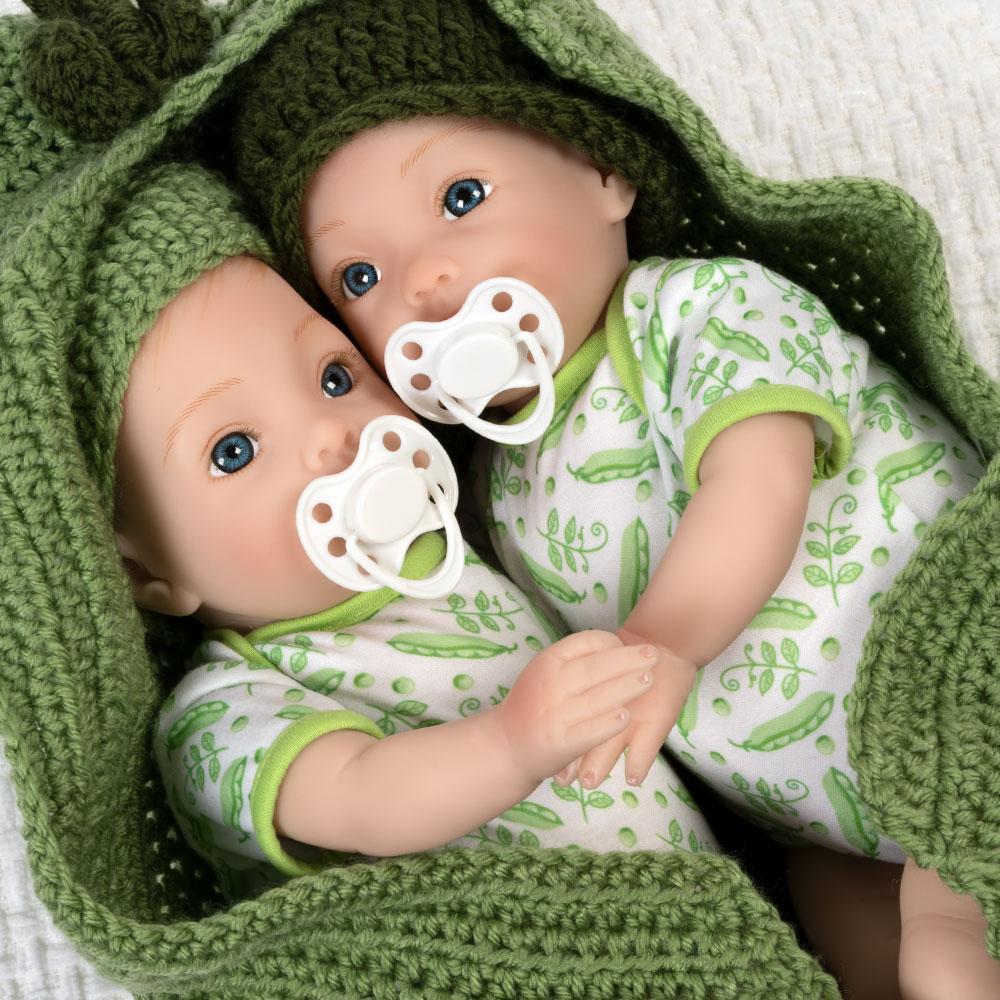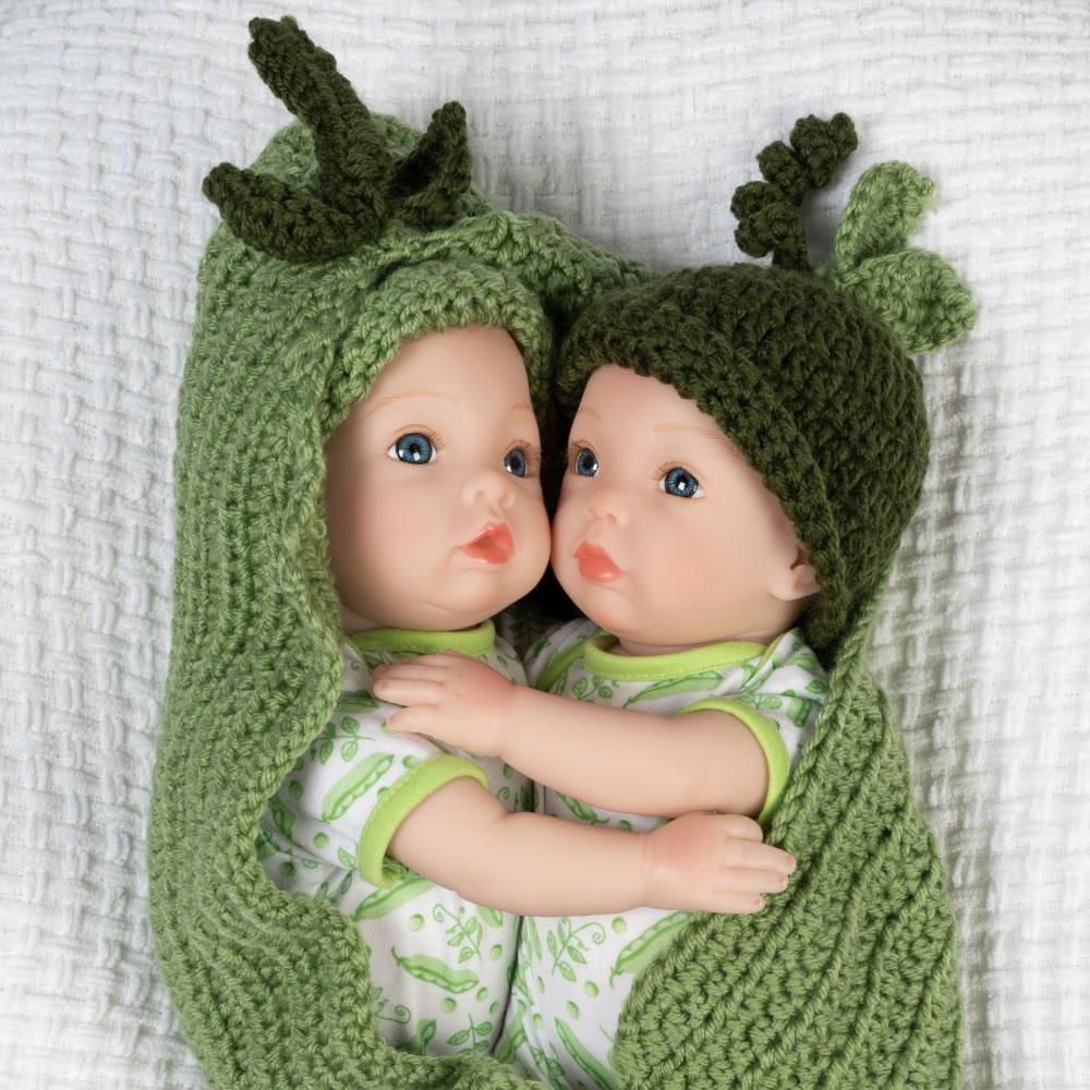 Meet our adorable newborn twins that are inseparable as Two Peas in a Pod! These sweet babies tightly embrace in their cozy crocheted pea pod with matching custom pea-patterned onesies and complimenting crocheted beanies, perfectly ready for Fall. Their delicate, soft features, beautiful round blue eyes that pop, button noses, and hand-painted pouty lips will be sure to make you melt! The twins cherish each other so much, and no matter where they go, they will always find their way back to each other to snuggle up in their peapod nook.