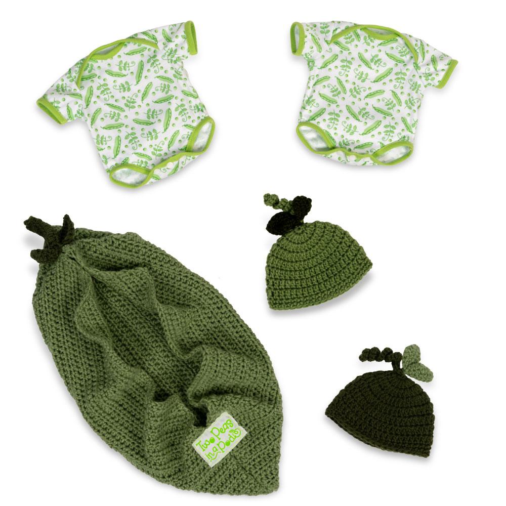- Dressed in custom matching pea-patterned onesies, complimenting dark & light green beanies, and coordinating magnetic pacifiers