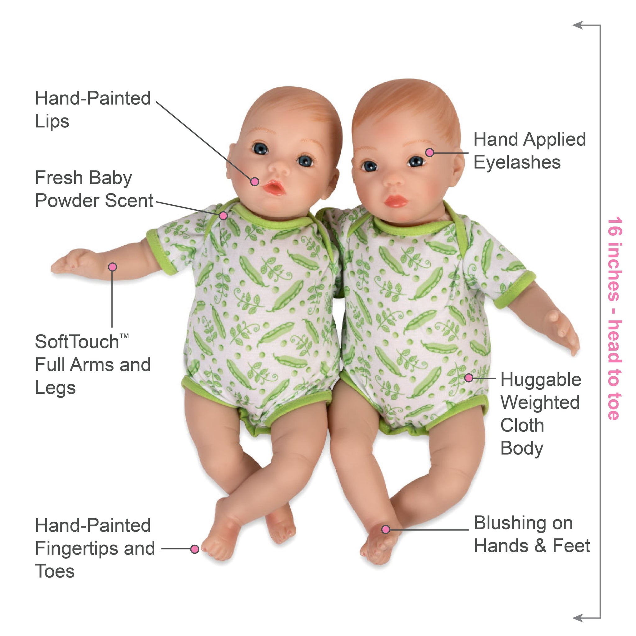 Our brand-new SoftTouch™ vinyl and weighted cloth body bring this duo to life to make them feel incredibly realistic, and you can also smell their delicious newborn baby powder scent when you cuddle them close. They are age-appropriate for young collectors aged 3 years and up, and are the perfect gift for twins/siblings or best friends!