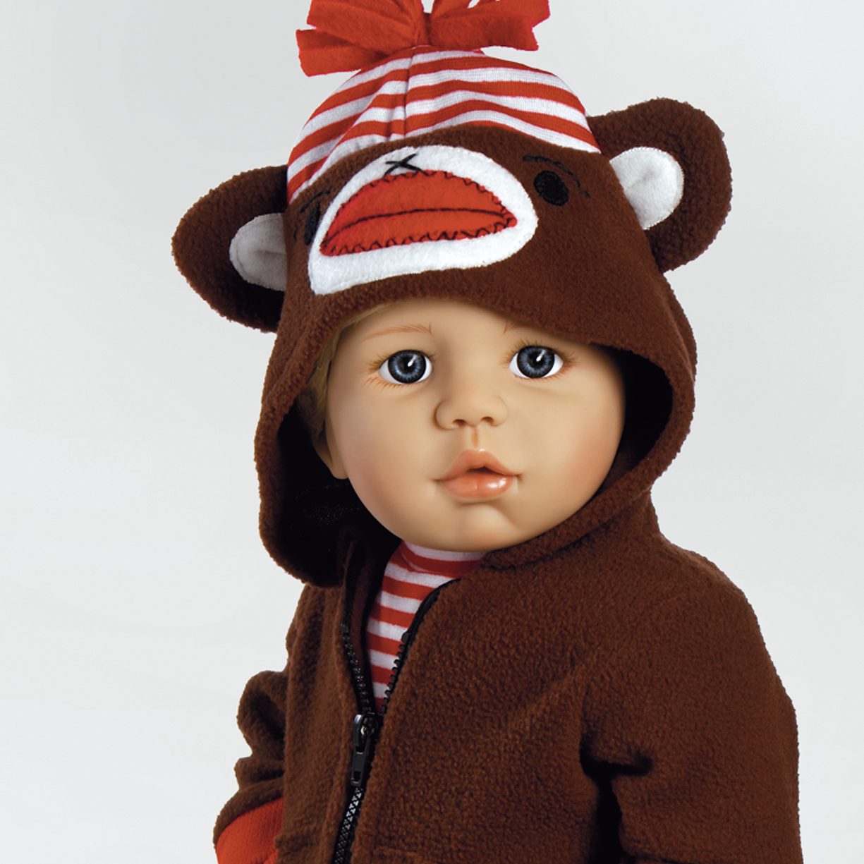“My Little Monkey” is the perfect little guy to monkey around with and play all day! He is dressed in a ¾ sleeve red & white striped jersey undershirt and tan corduroy pants. To keep his arms warm and keep him stylish…he is wearing a brown polar fleece jacket with sock monkey-face hood with red pompom fabric sprouting out the top, red accents along the pocket and bottom openings giving his jacket the perfect finishing touches. “My Little Monkey” has the best brown faux suede shoes with red laces on his tiny feet ready to run around the zoo with you…Ohh! Ohh! Ohh!