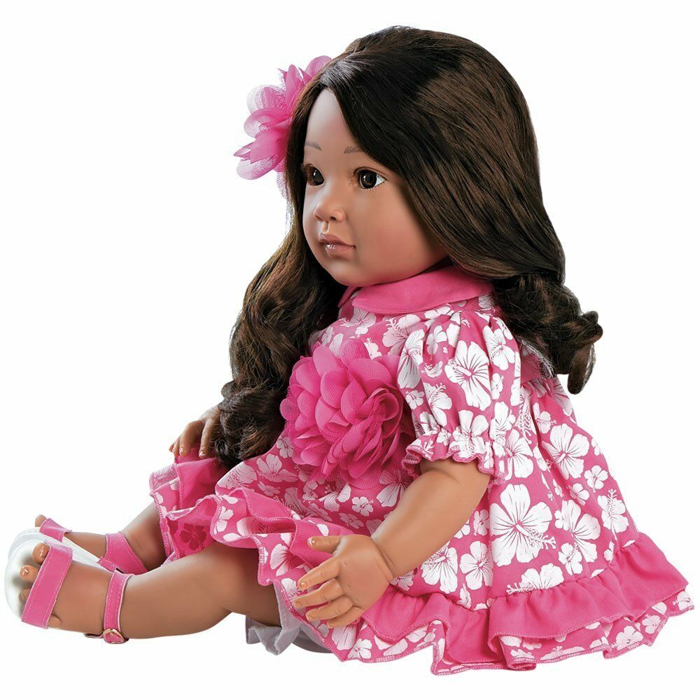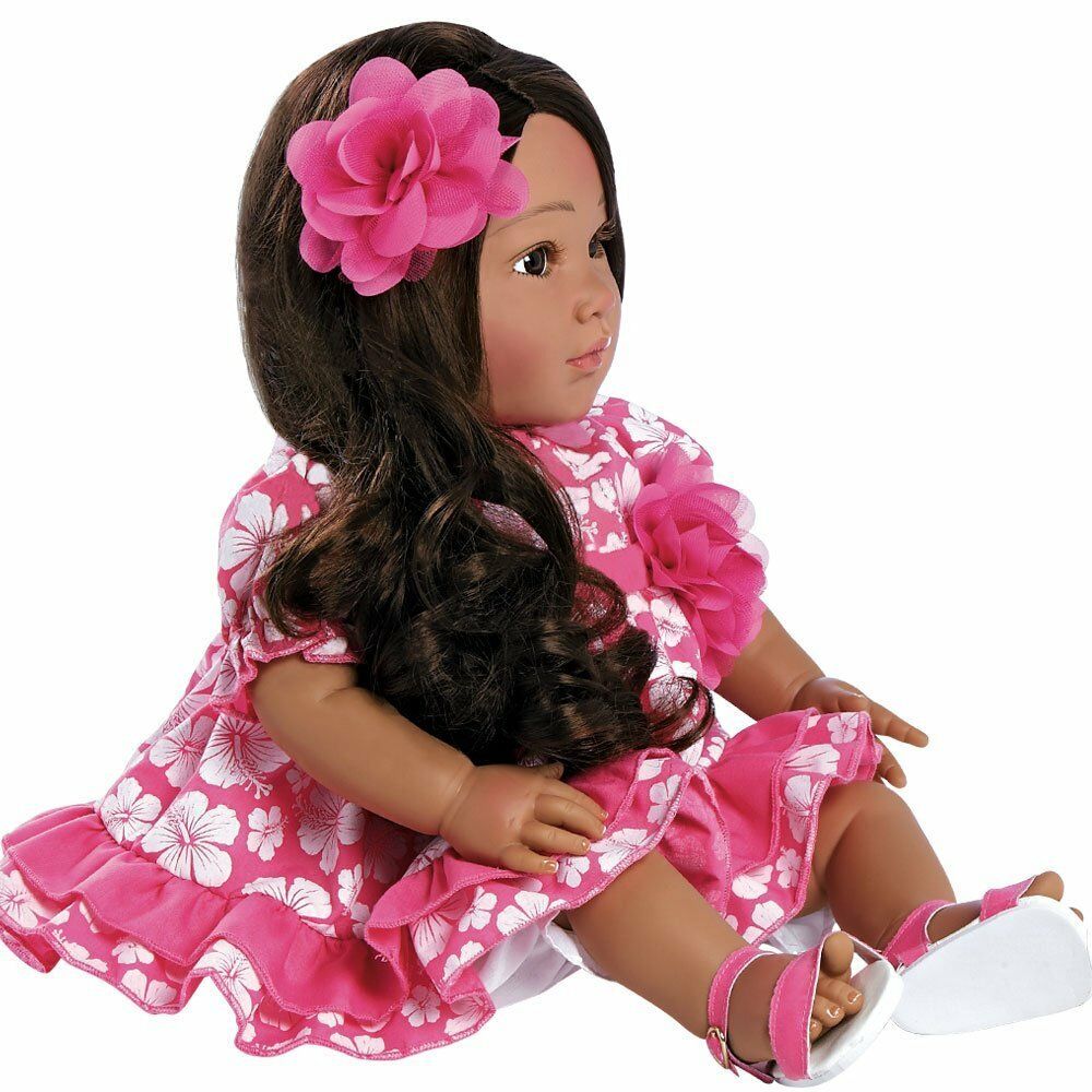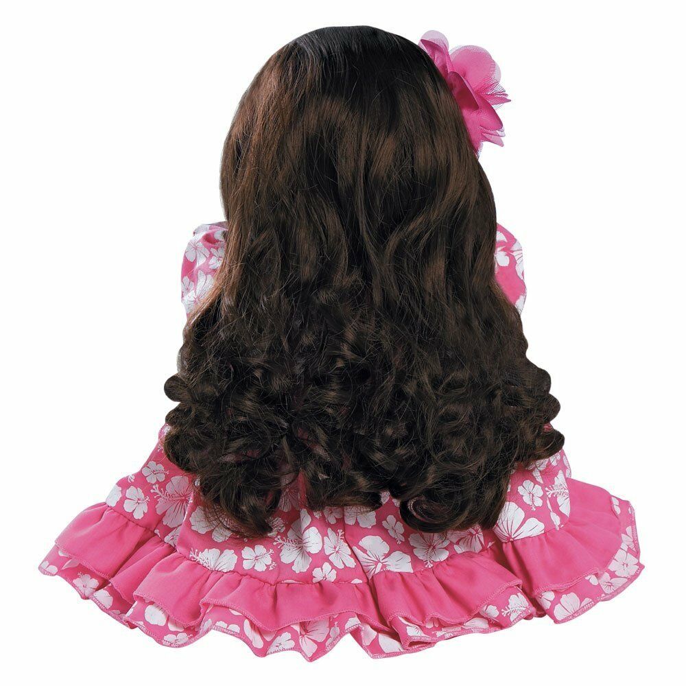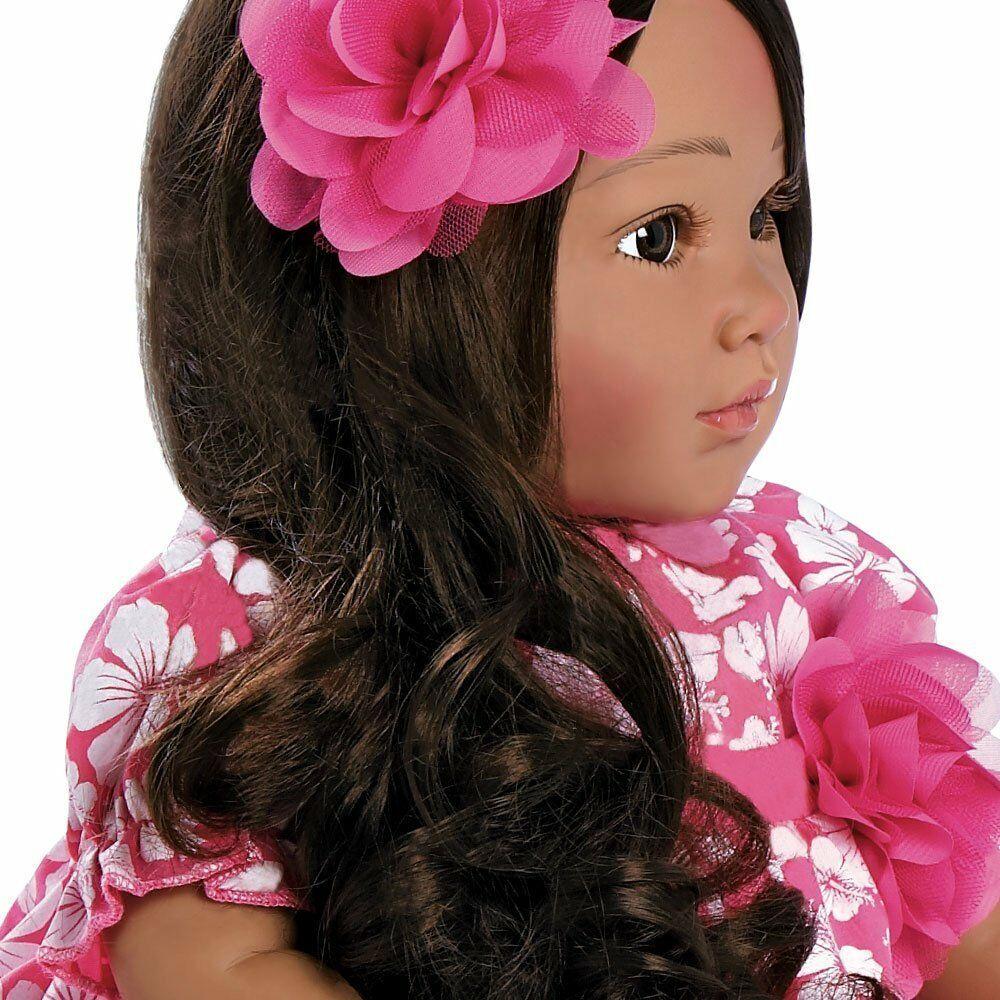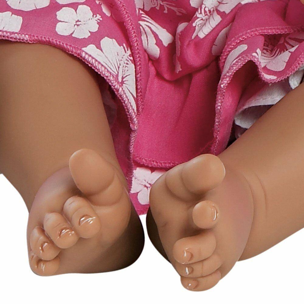 The spirit of Hawaii shines through the big, brown eyes of Lei Aloha! She’s a true island beauty with sun-kissed skin that is irresistible to your squeezes. Lei Aloha lives the tropical lifestyle in her Hibiscus dress, printed on crisp woven fabric, accented with a ruffle, and Peter Pan collar. And she’s beach-ready in her adorable pink sandals and white pantaloons to keep her cozy in the sand.