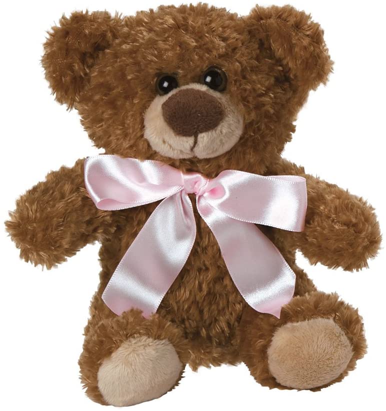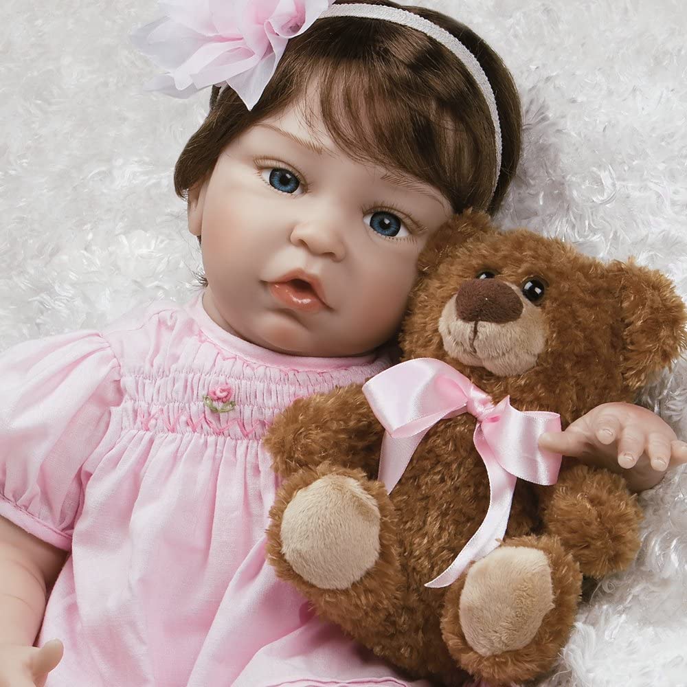 Pretty in Pink's hair is elegantly adorned by a headband accented with the softest sheer pink flower that also embellishes the toes of her sweet Mary Jane shoes. Her sideswept brunette bangs make a striking contrast to light blue eyes and rosebud lips, and she isn't complete without plush bear playmate who wears a pink satin ribbon around his neck to match. She also comes with a pink pacifier to soothe her to sleep.