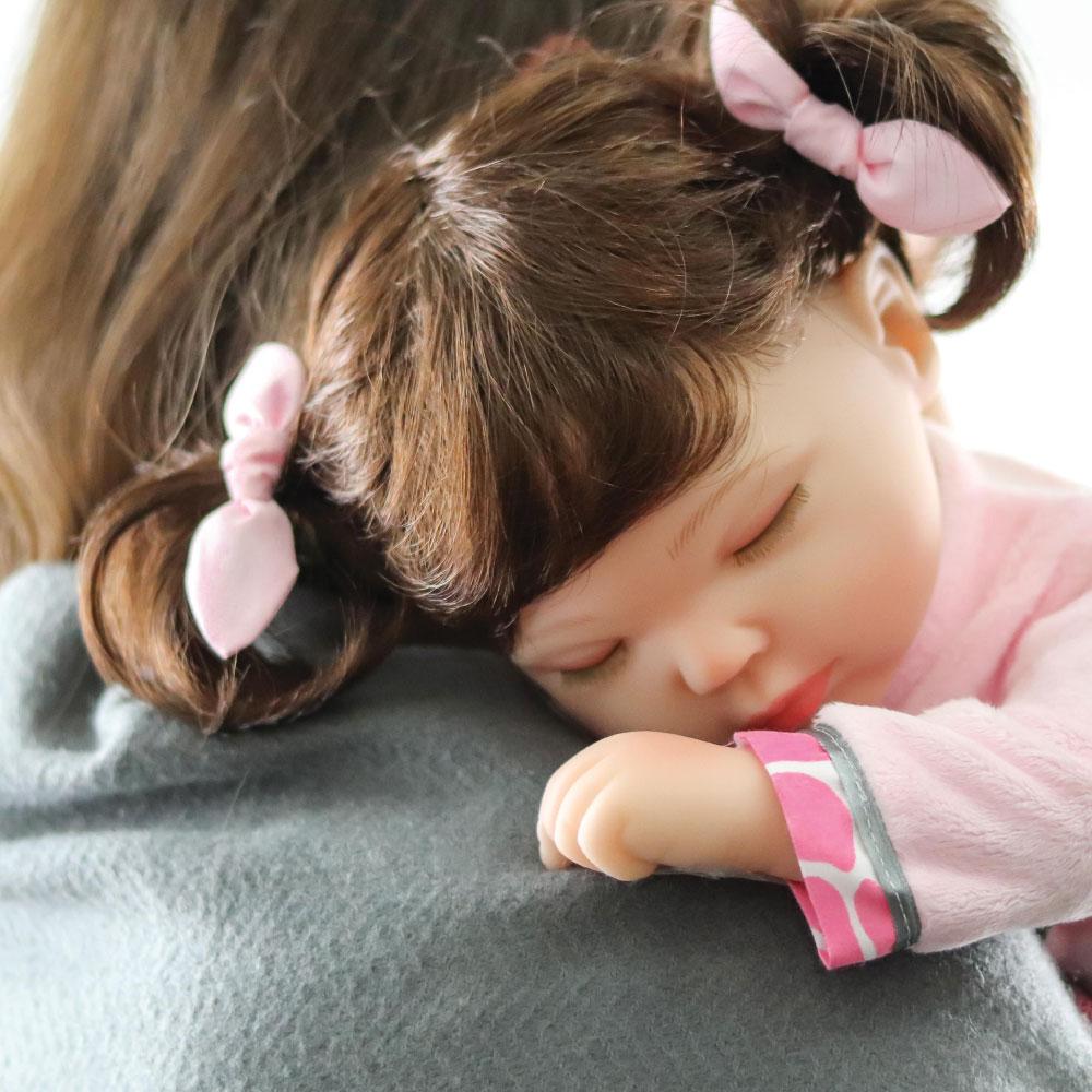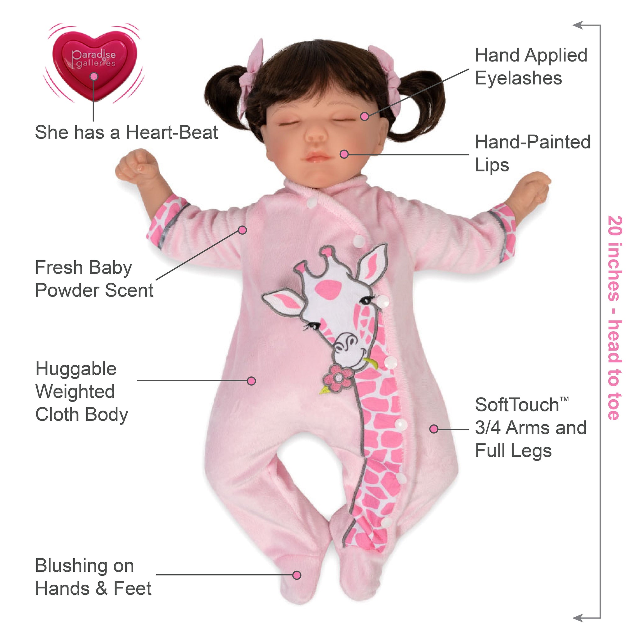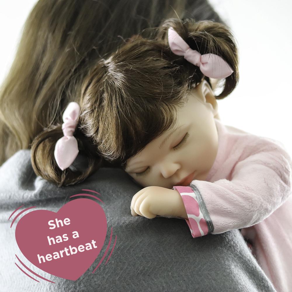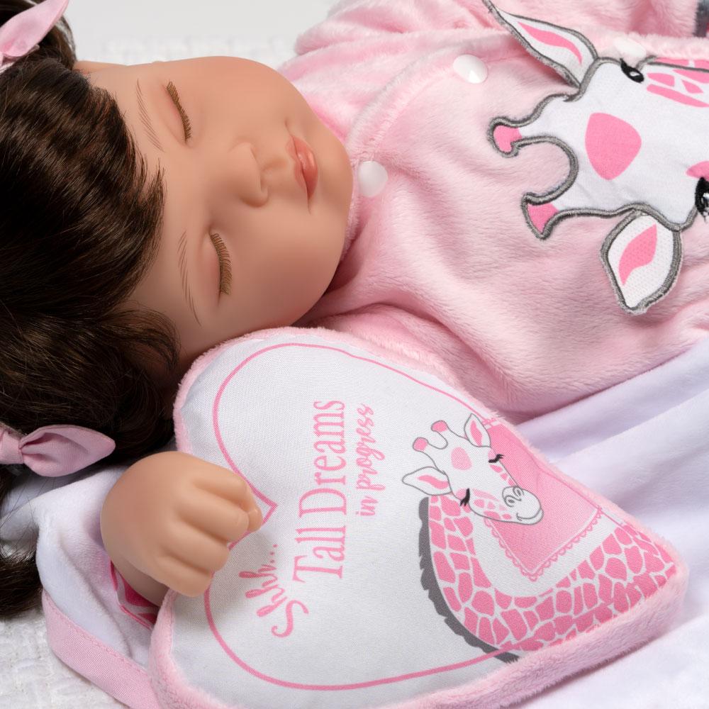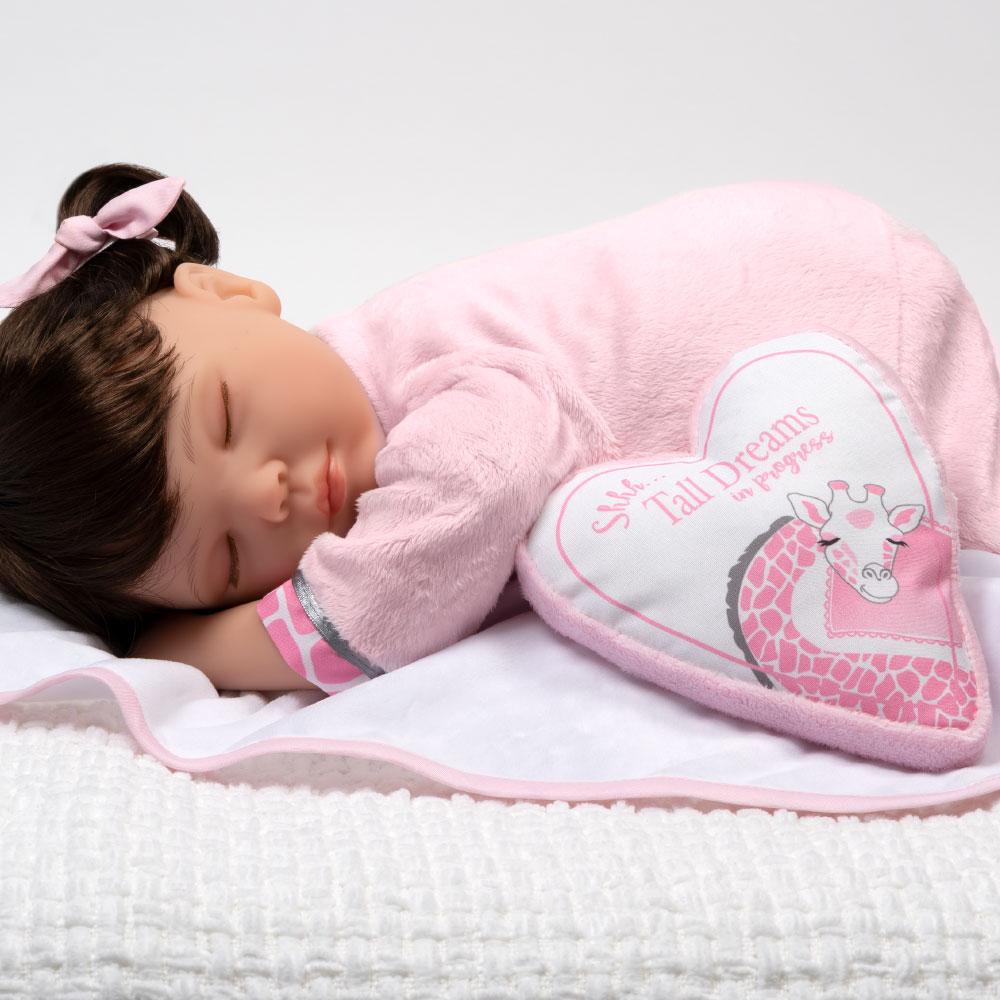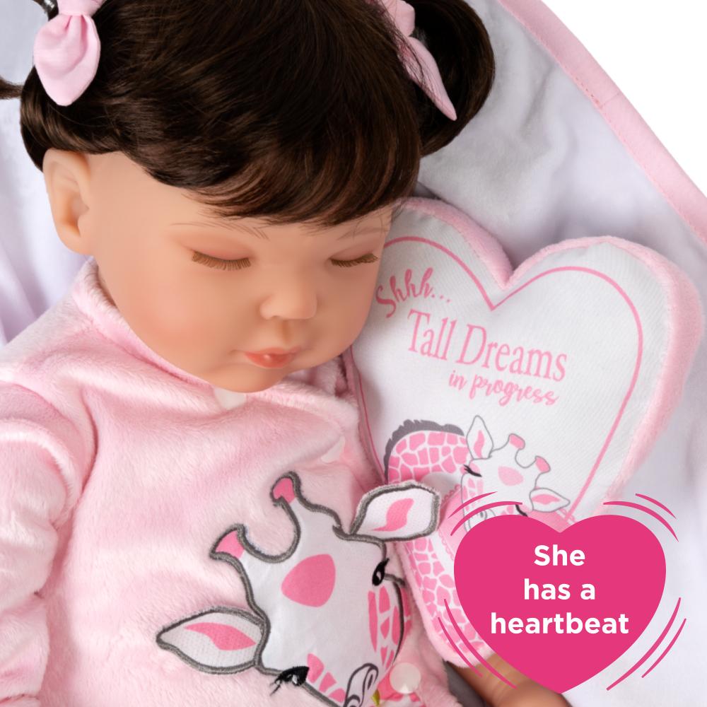 For the first time in Paradise Galleries’ history, you can connect with your beautiful baby doll on a deeper level, thanks to our new heartbeat technology. Hold Sleeping Tall Dreams in your arms and feel your soul fill with joy as her heart beats against yours. And if she looks familiar to one of our most beloved baby dolls, you’re right! Inspired by our iconic reborn like Tall Dreams, Sleeping Tall Dreams is all grown up! With her chubby cheeks, luscious lips and plush PJs, your heart will skip a beat when she’s in your arms. For nap time, she lays down on her cozy blanket and hangs her pillow on the door so she can have tranquil, uninterrupted dreams. Turn this dream into a reality and add her to your nursery today.
